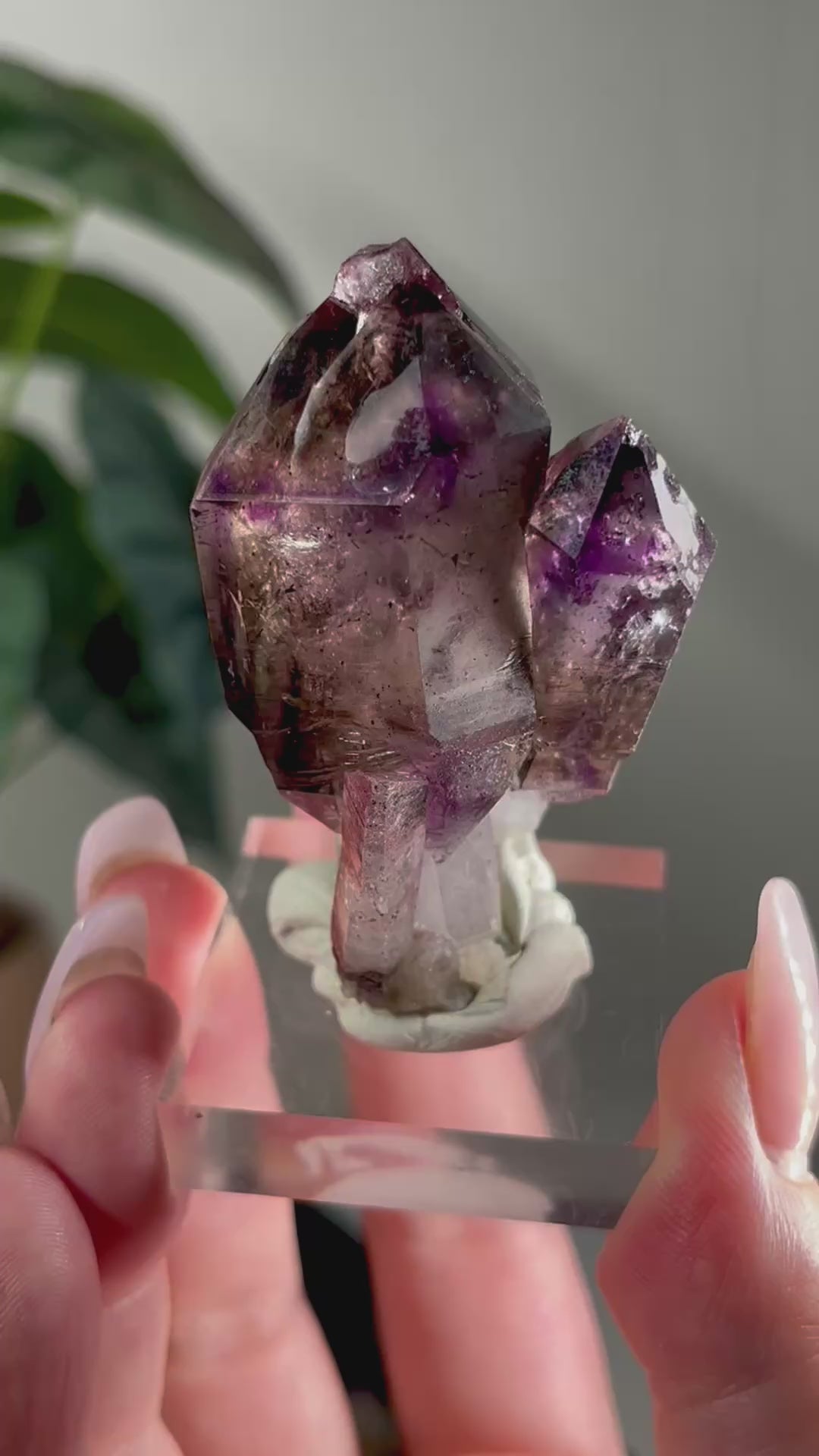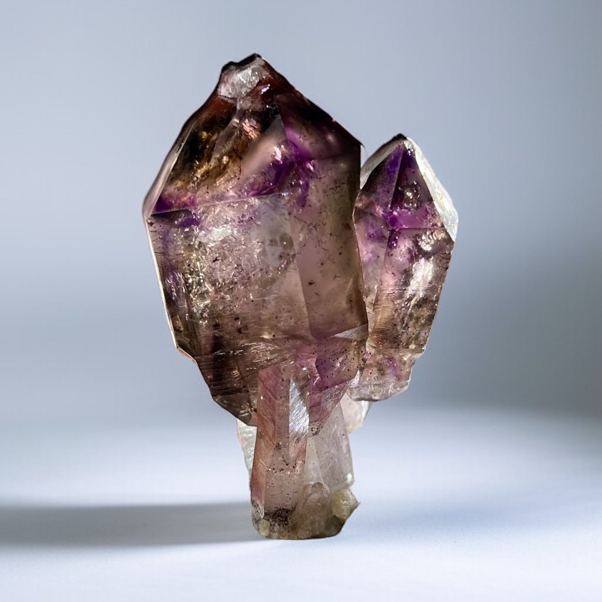 What makes Chibuku scepters especially striking is their sparkling red hematite inclusions, which appear as shimmering flecks or bold blotches against the smoky-purple backdrop. Many also contain enhydrosβtiny, ancient water bubbles sealed within the crystal for millennia.
