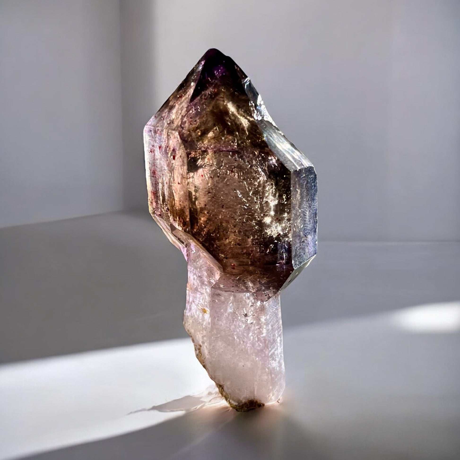 What makes Chibuku scepters especially striking is their sparkling red hematite inclusions, which appear as shimmering flecks or bold blotches against the smoky-purple backdrop. Many also contain enhydrosβtiny, ancient water bubbles sealed within the crystal for millennia.