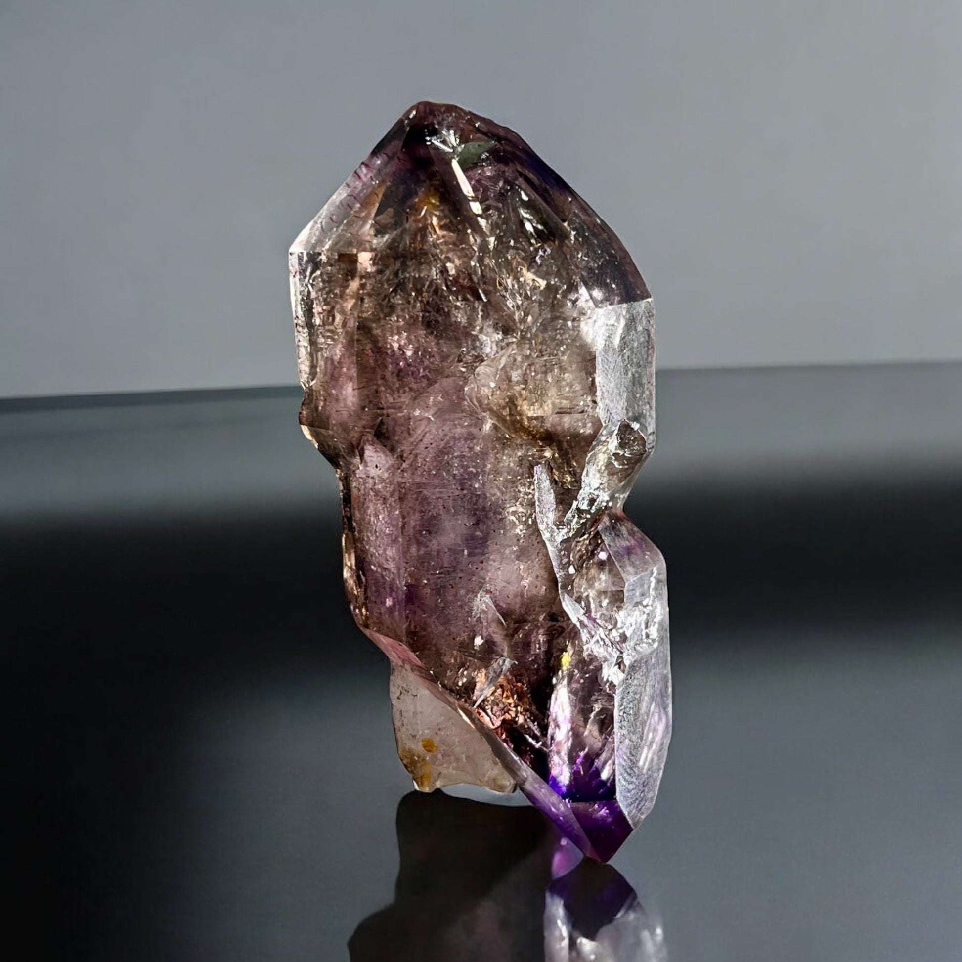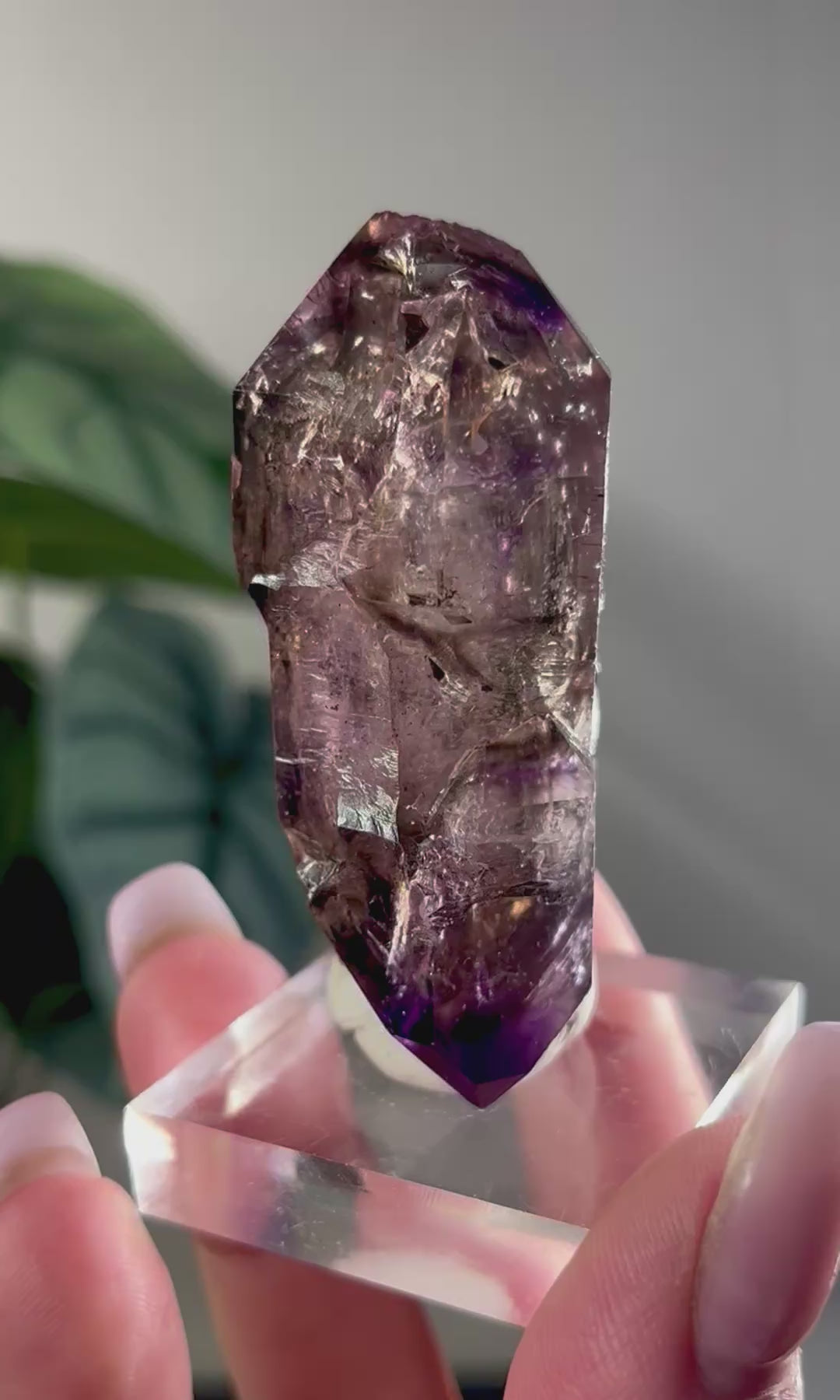 What makes Chibuku scepters especially striking is their sparkling red hematite inclusions, which appear as shimmering flecks or bold blotches against the smoky-purple backdrop. Many also contain enhydrosβ€”tiny, ancient water bubbles sealed within the crystal for millennia.