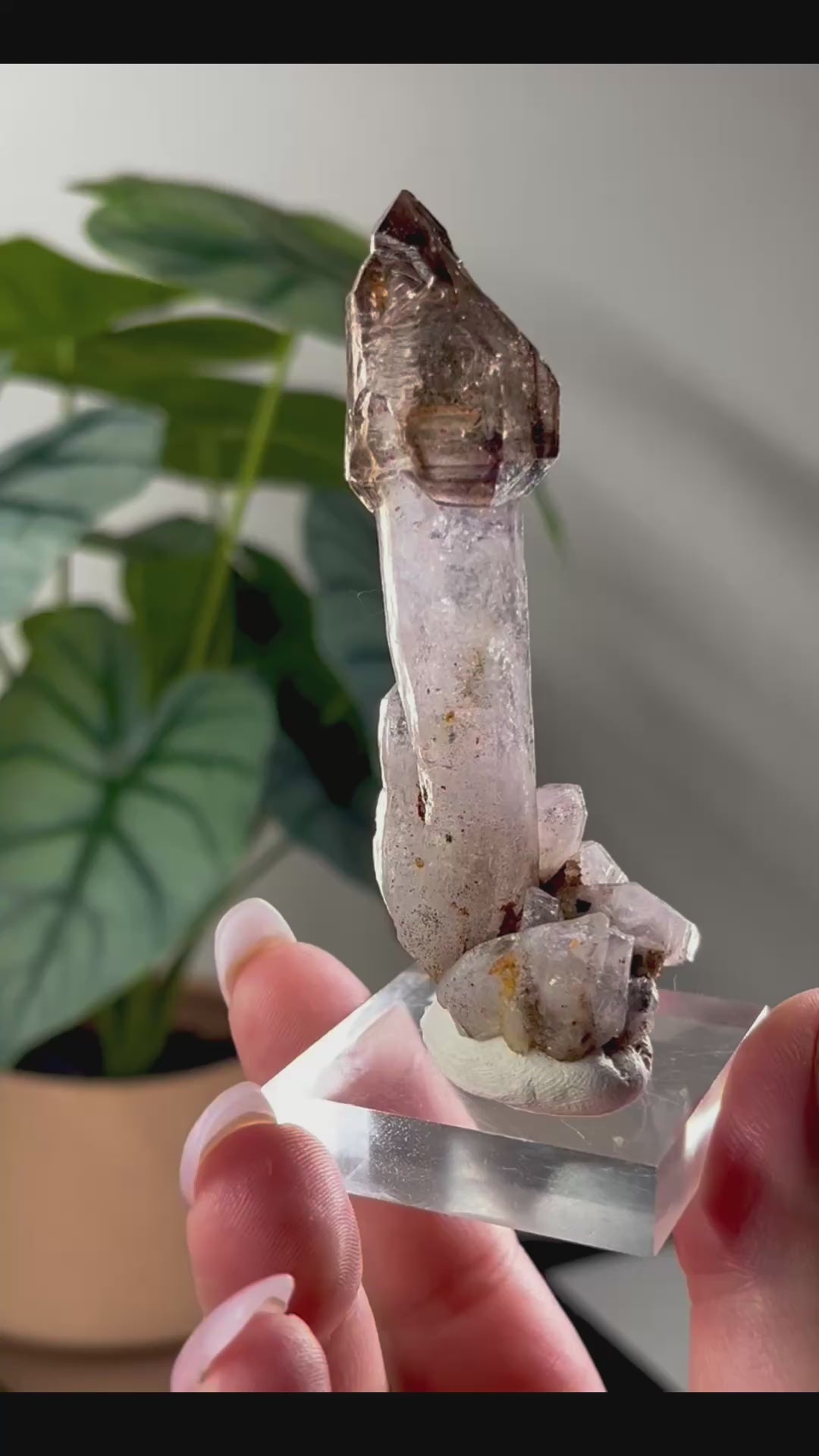 What makes Chibuku scepters especially striking is their sparkling red hematite inclusions, which appear as shimmering flecks or bold blotches against the smoky-purple backdrop. Many also contain enhydrosβtiny, ancient water bubbles sealed within the crystal for millennia.