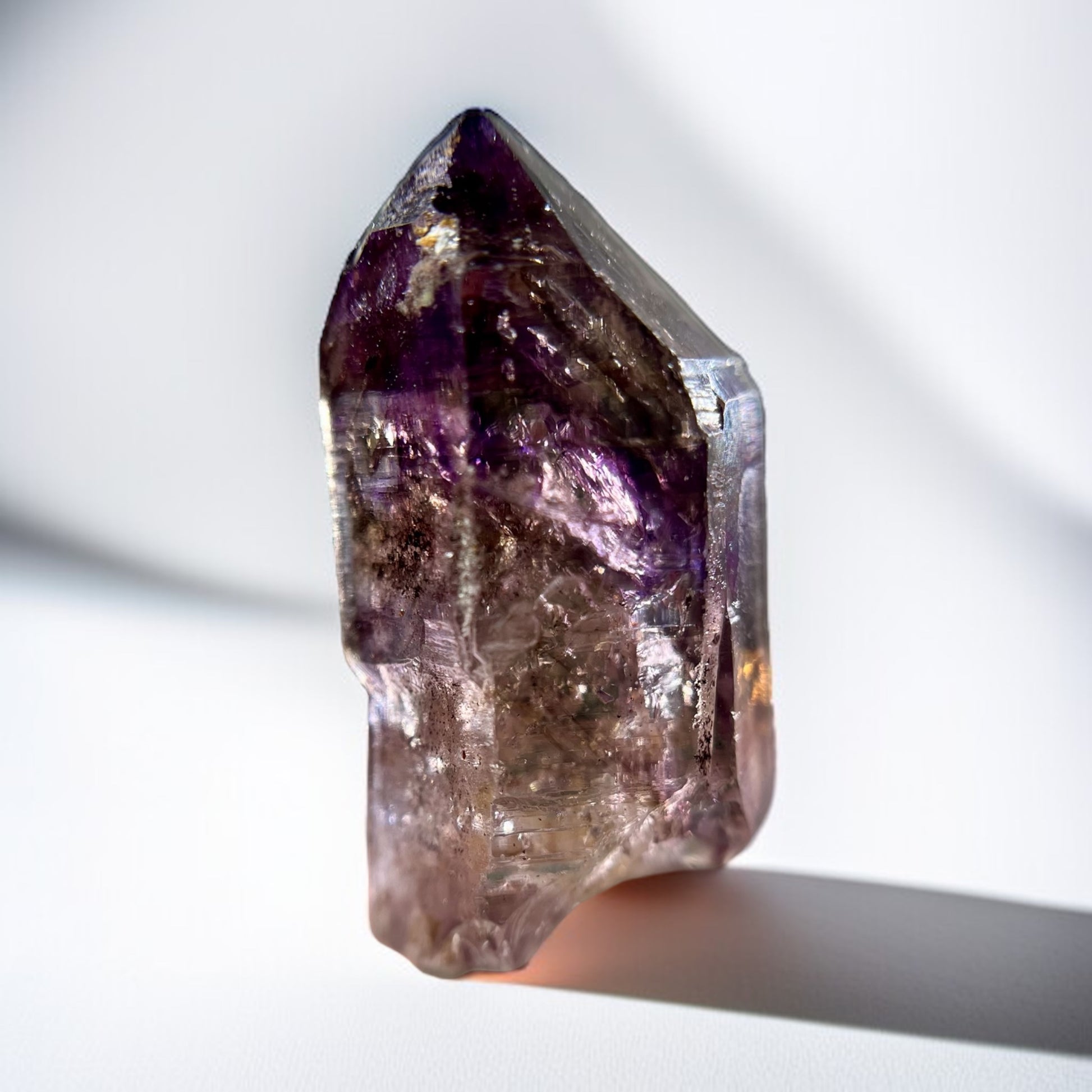What makes Chibuku scepters especially striking is their sparkling red hematite inclusions, which appear as shimmering flecks or bold blotches against the smoky-purple backdrop. Many also contain enhydrosβtiny, ancient water bubbles sealed within the crystal for millennia.
