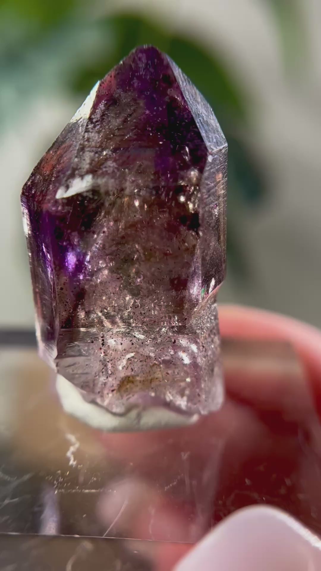This oneβs a little powerhouseβchunky, vibrant, and packed with detail. Deep purple at the tip, smoky throughout the body, and those red hematite flecks give it that extra magic.