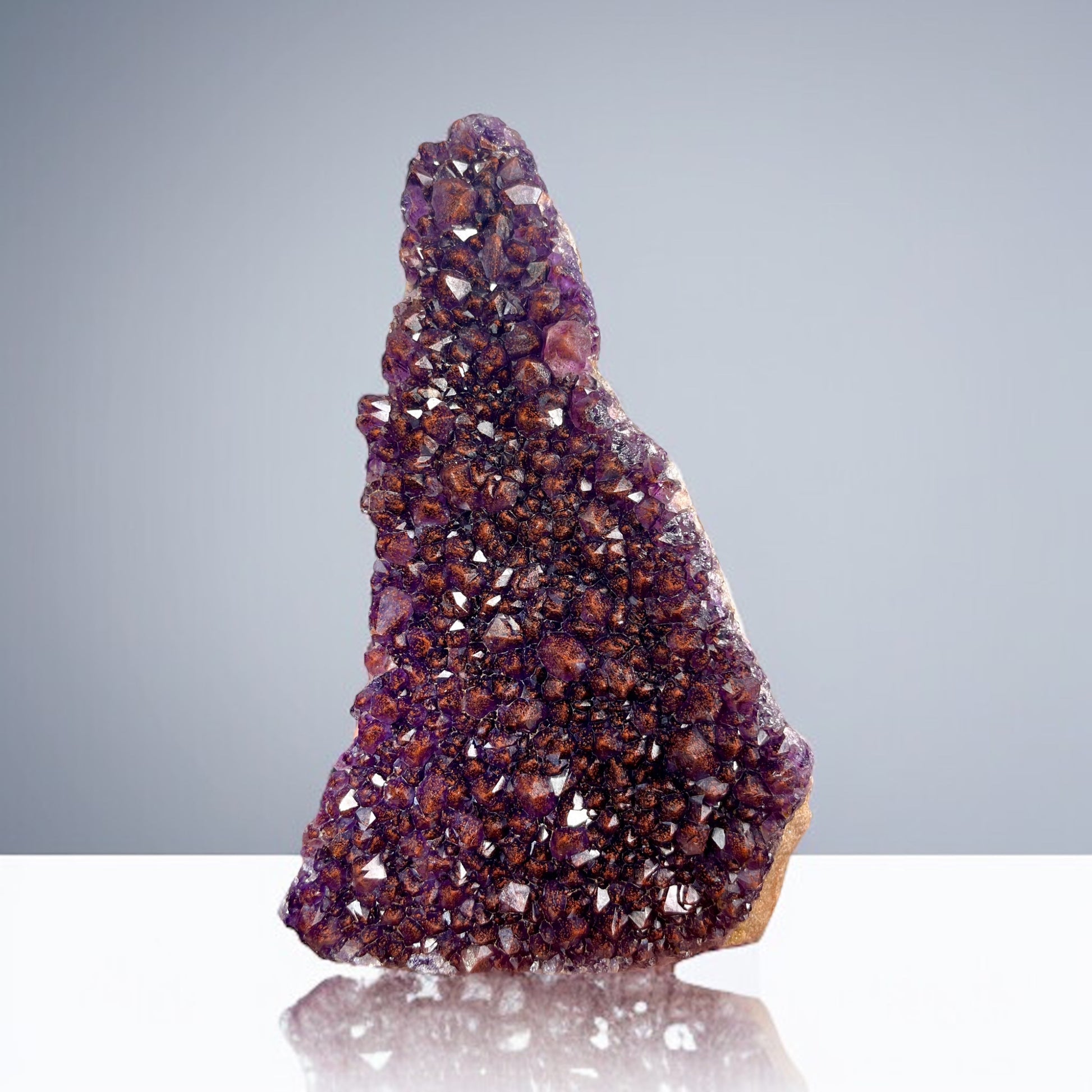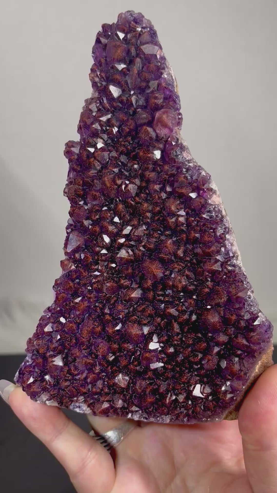 This is a standout Thunder Bay Amethyst with serious presence. The crystals are richly saturated in violet, but what steals the show is the heavy hematite inclusionsβ€”flashing deep copper and burnt orange even under normal lighting. The formation is sharply triangular, adding to the sculptural vibe, and the luster? Next level.