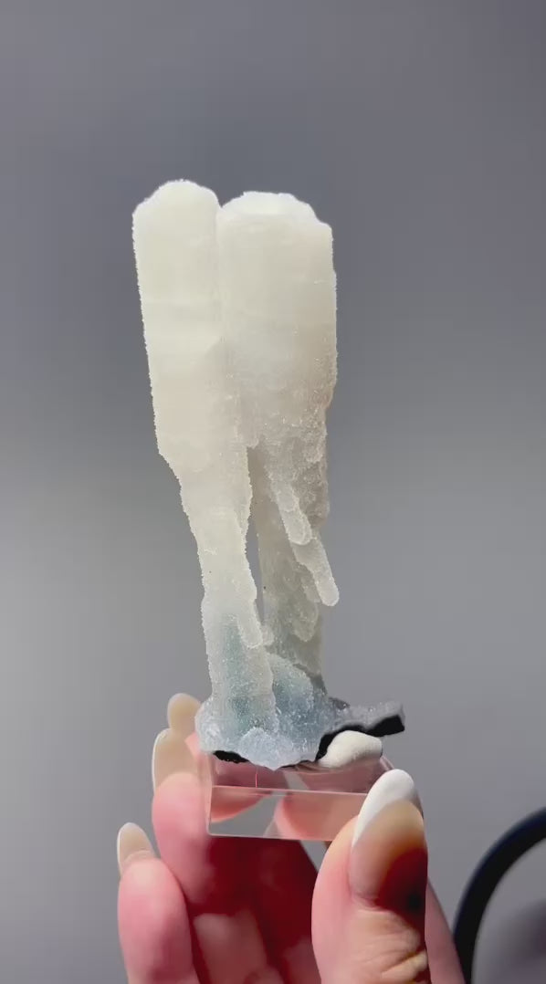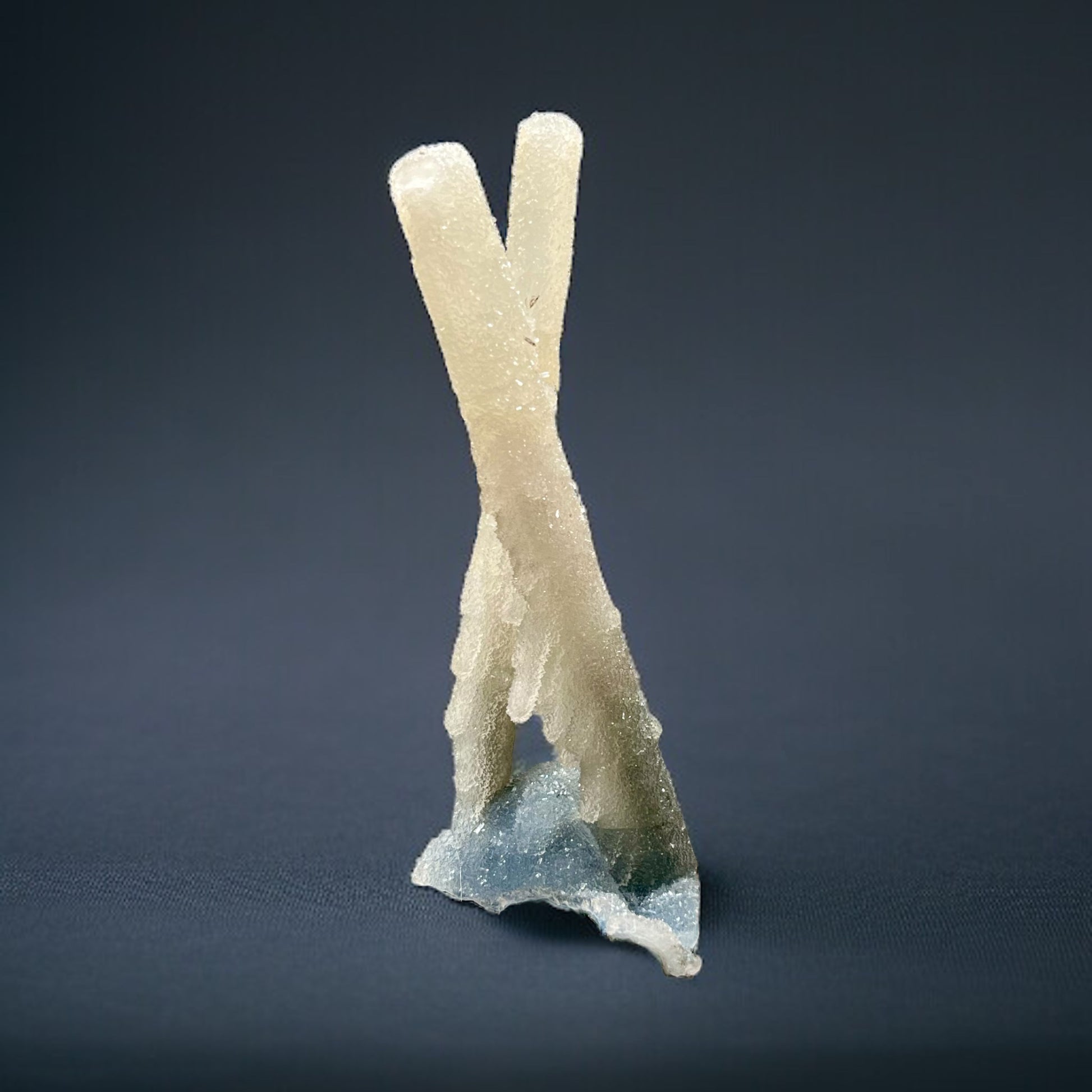 This ethereal specimen features two elongated selenite crystals encrusted in a sparkling druse of natural chalcedony. While the crystals grow side by side, they are not twinned — but rather individual blades preserved in parallel, each contributing to the sculptural elegance of the piece.