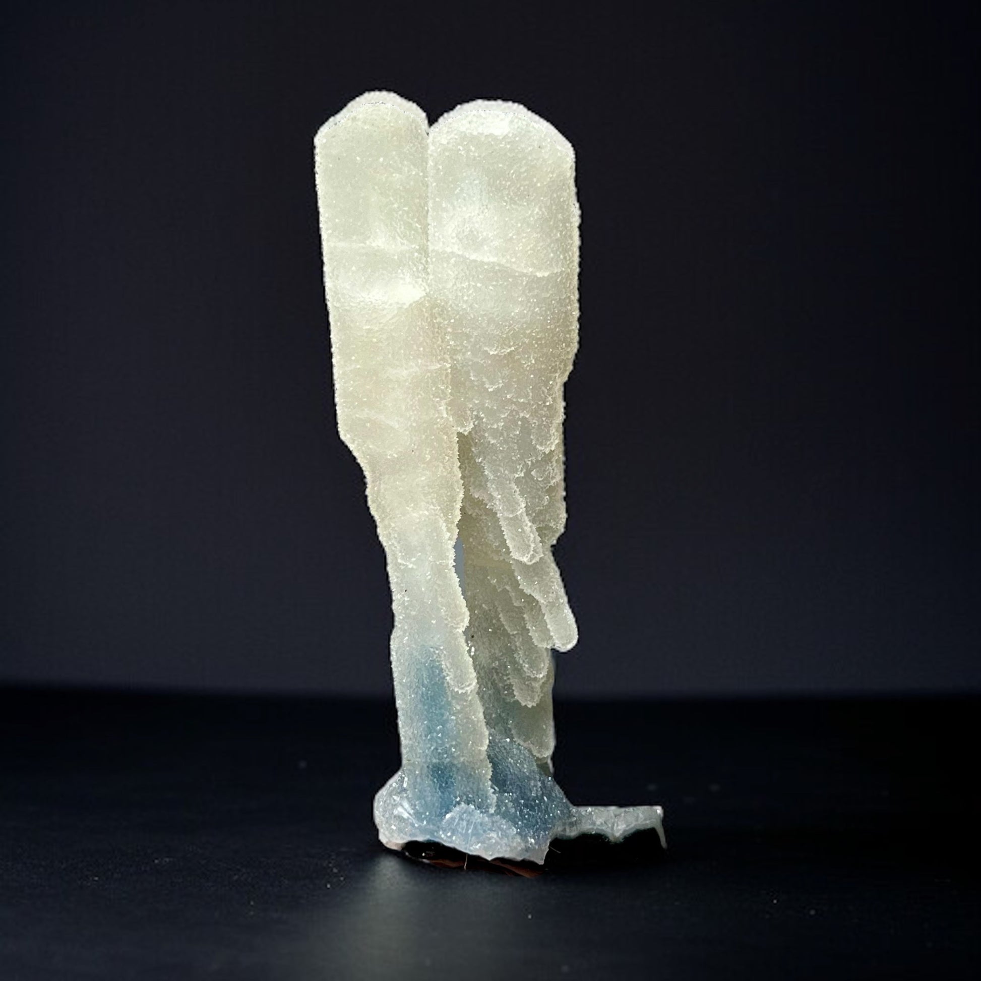 The outer coating of white chalcedony glitters in light, while icy blue tones near the base add visual depth — a natural effect caused by trace minerals in the silica. The selenite core remains intact inside, giving the piece structure while remaining visually subtle beneath the quartz-rich shell.