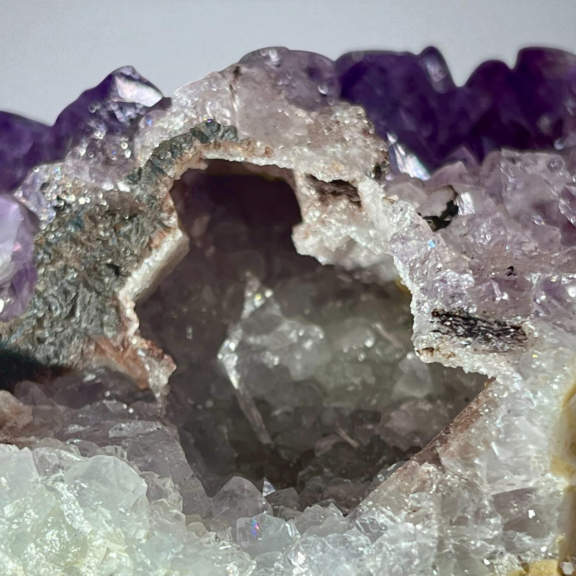 This sparkling Uruguayan amethyst dome features vibrant lavender zoning and a rare geological highlight: a hollow dogtooth calcite cast (epimorph). The pale, ghost-like form in the center shows where a sharp scalenohedral calcite crystal once stood. Over time, it was overgrown by quartz/amethyst/goethite and later dissolved, leaving a hollow cavity that perfectly preserves its shape.