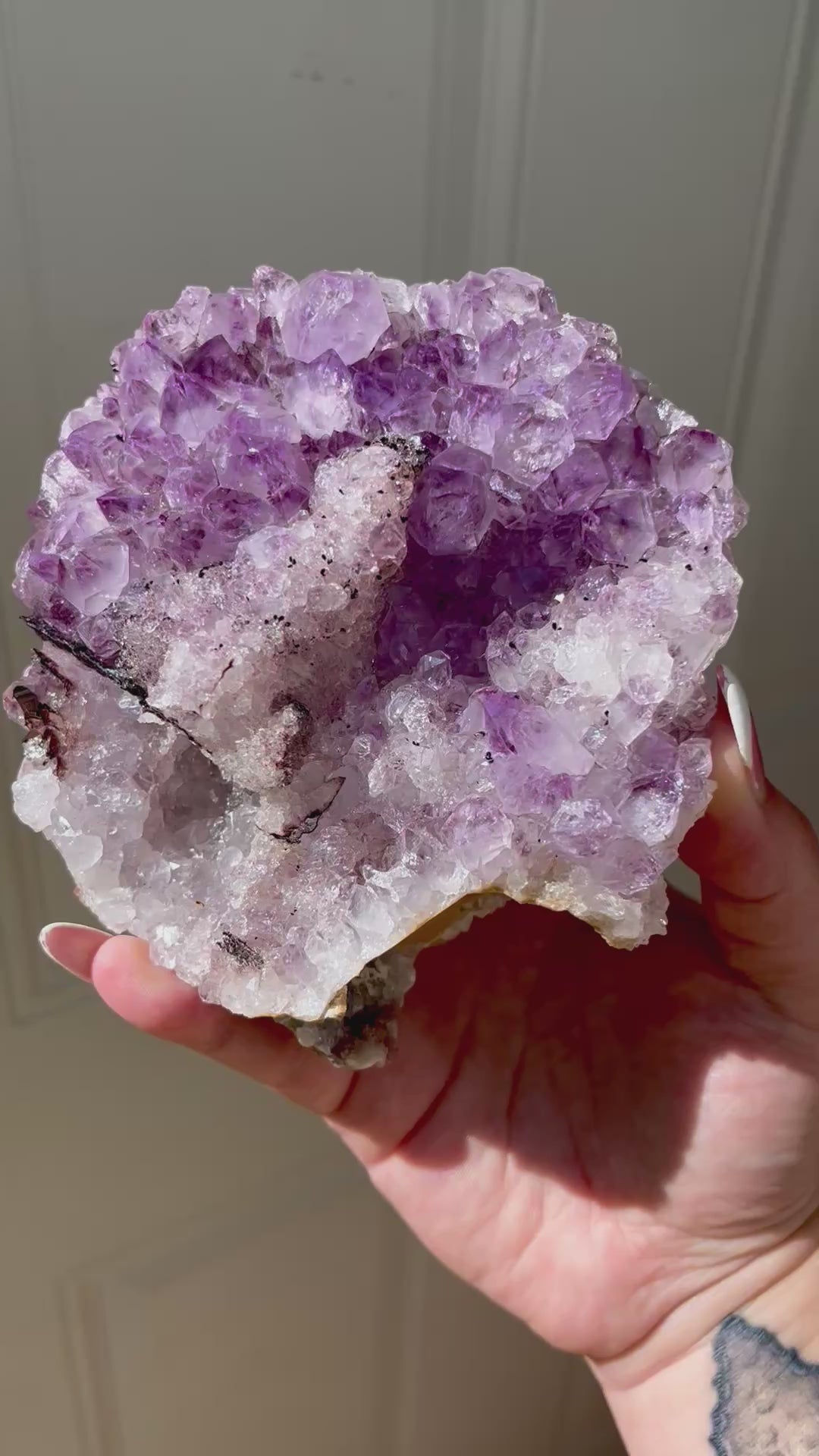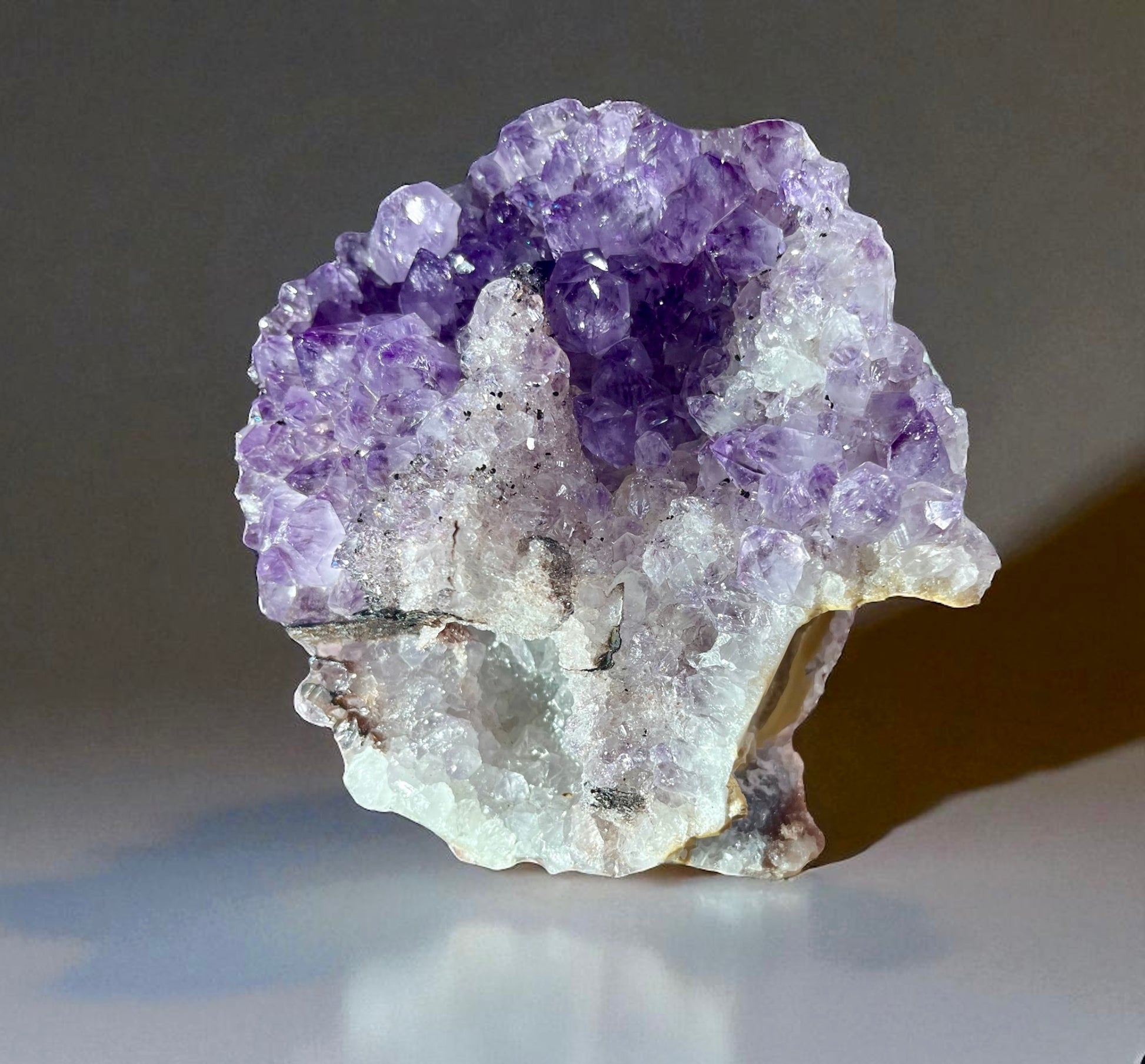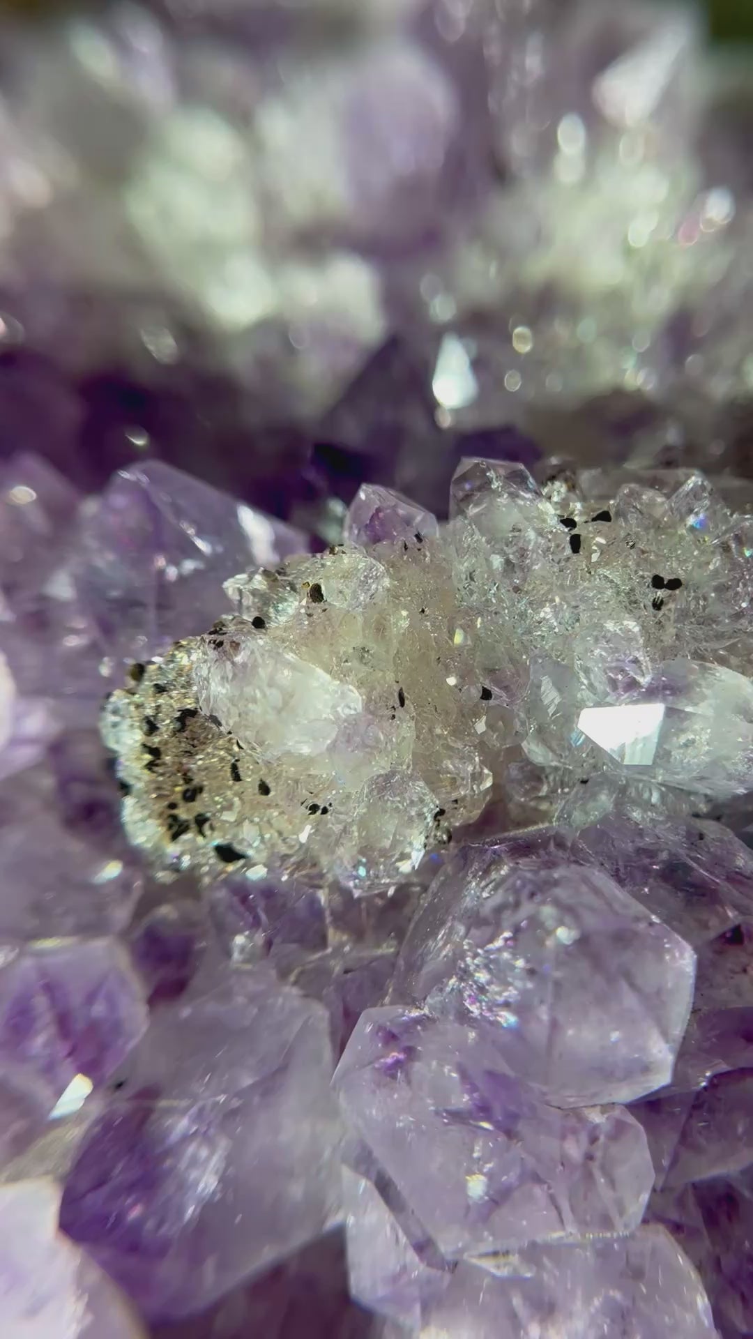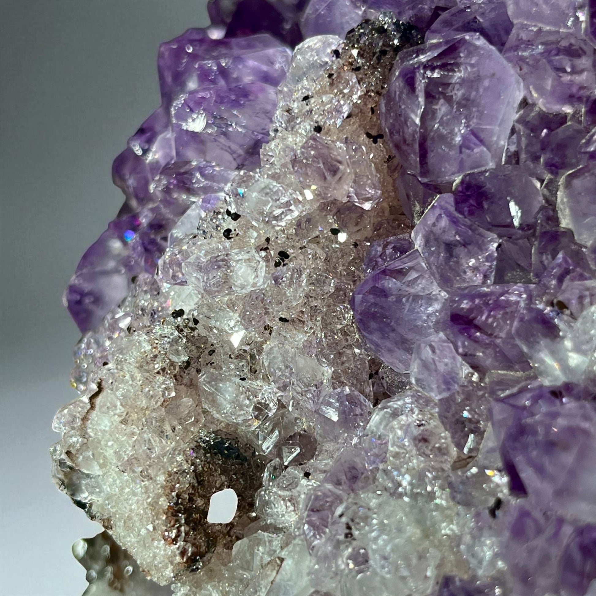 - Saturated purple amethyst crystals with bright, glassy luster, many micro rainbows!