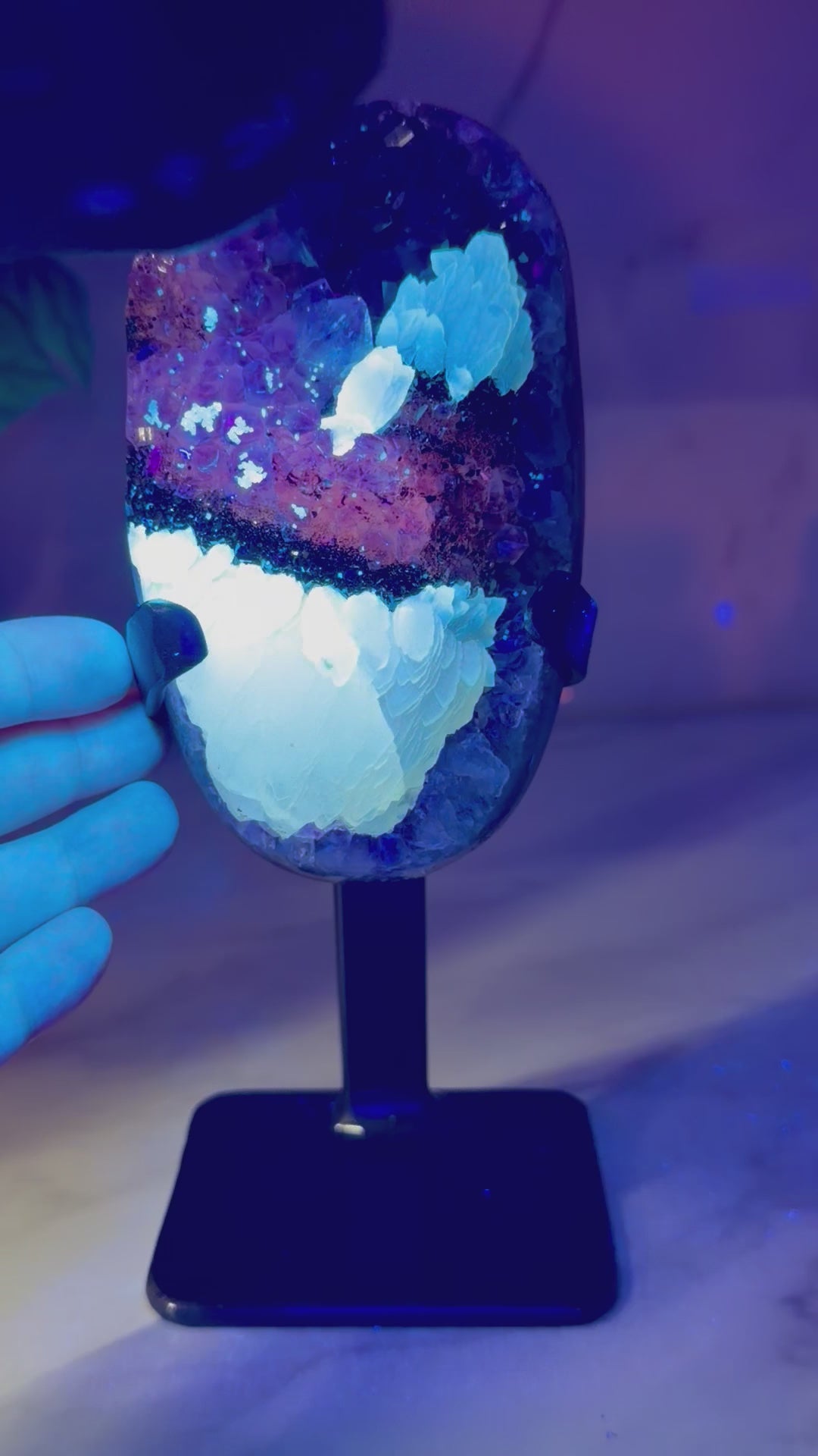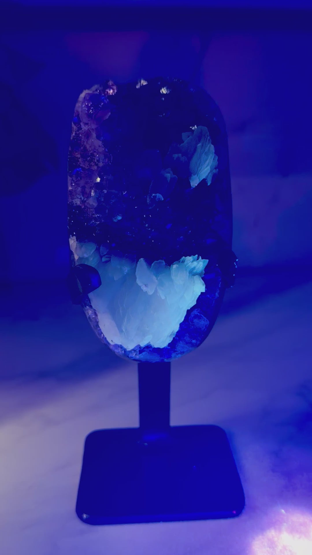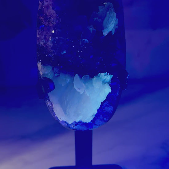 This calcite holds a hidden surprise — under UV light, it glows a brilliant white, but the moment the light switches off, it flashes a vivid orange afterglow. This rare phosphorescent color change is highly uncommon, even among UV-reactive minerals.