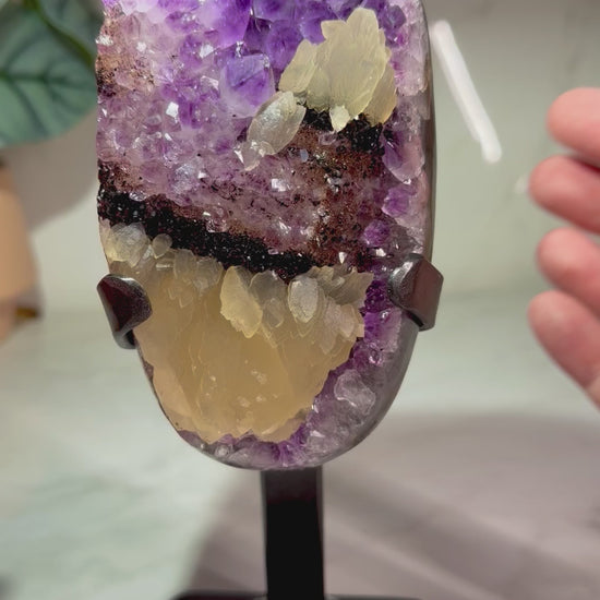 A natural landscape of violet and gold. Bright yellow calcite blooms across amethyst druzy, divided by a dark band of goethite that gives the whole piece depth and drama. The warm and cool tones balance perfectly — a textbook example of why Uruguayan amethyst is so loved by collectors.