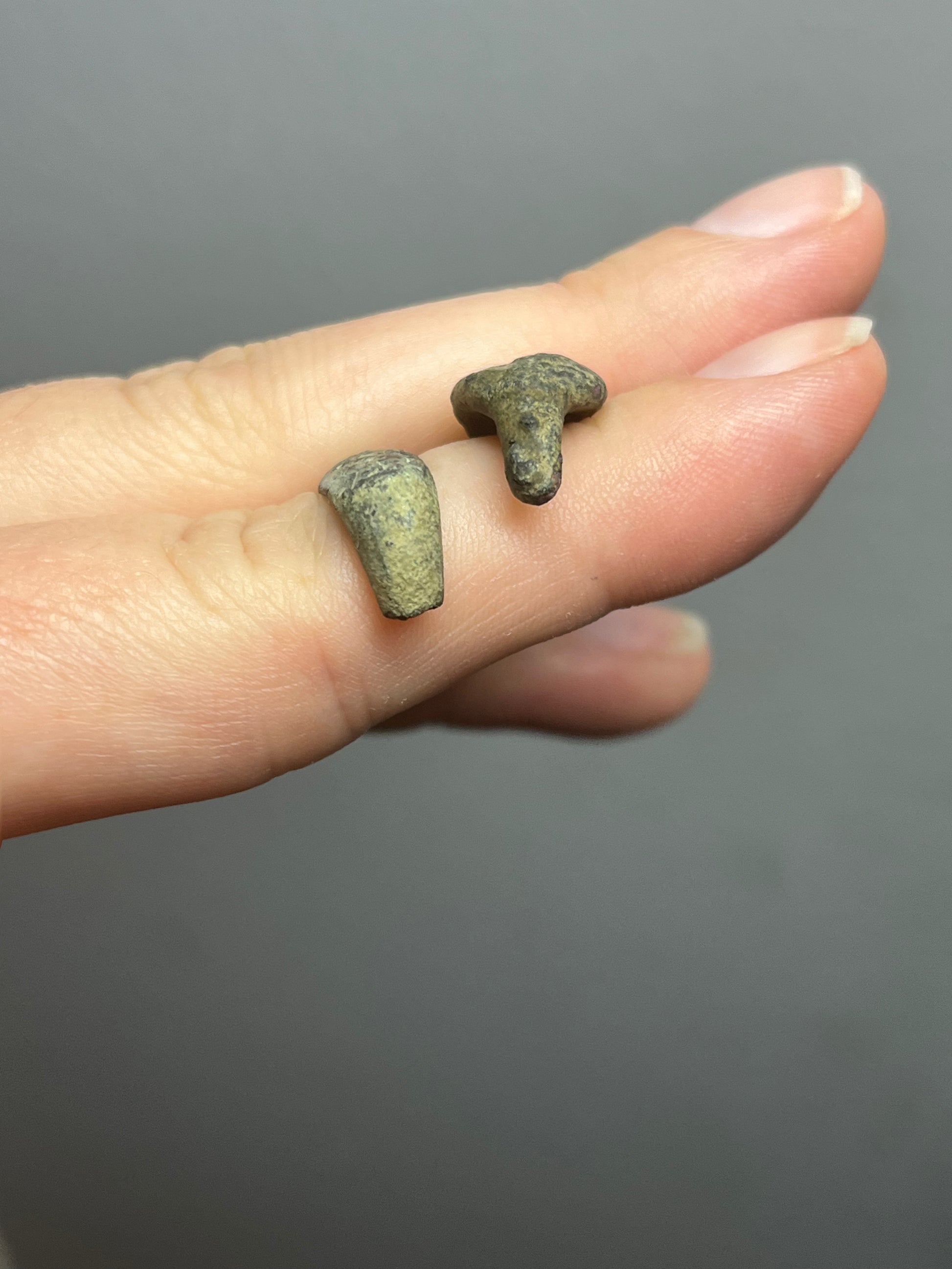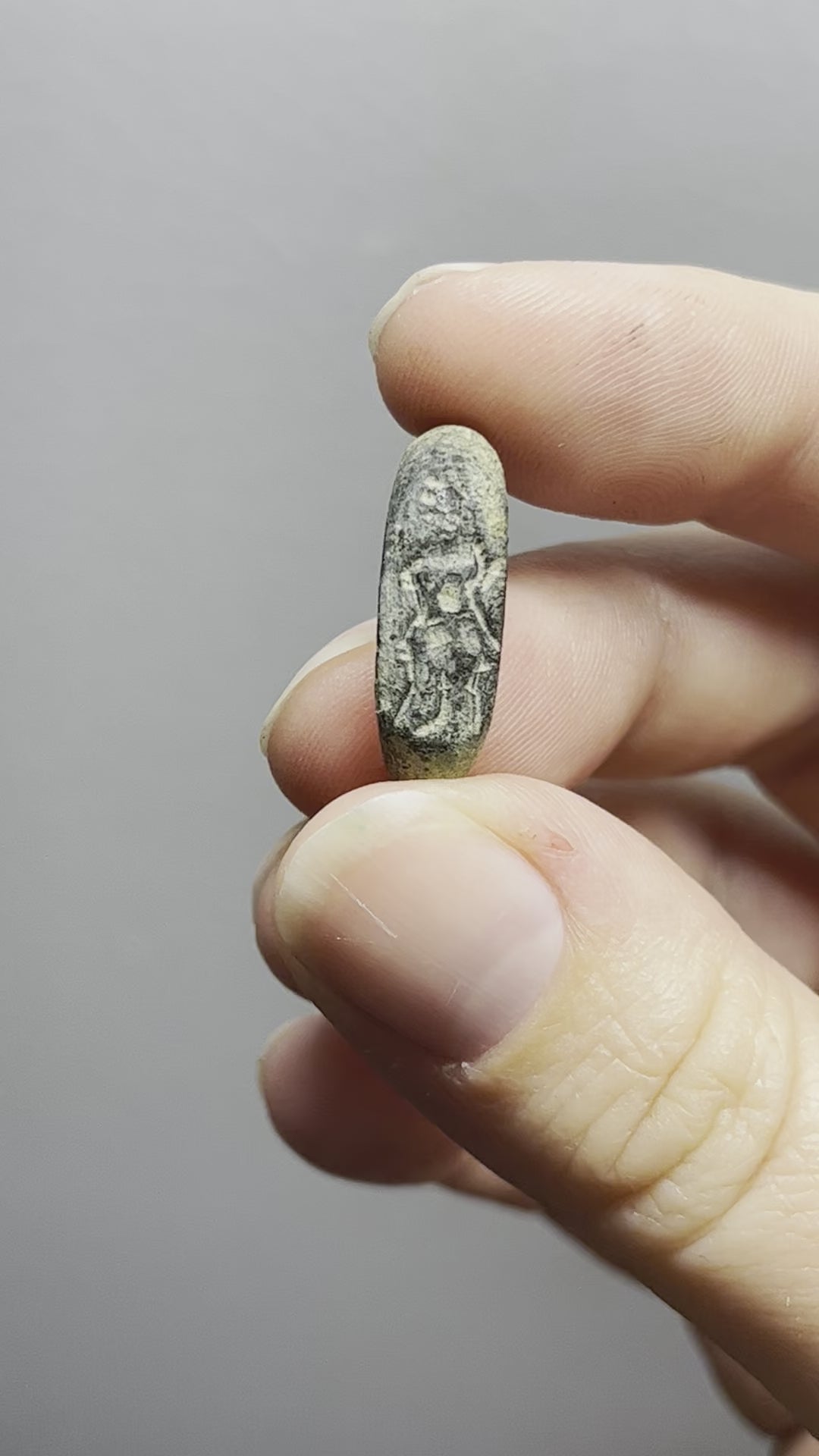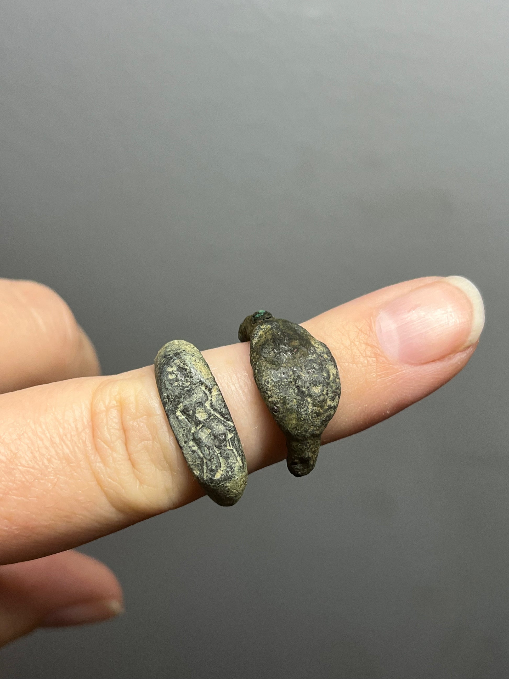 Two rings from Ancient Greece. Unfortunately due to being 2,000+ years old, the bottom portion has worn away. You can see rough outlines of figures and designs on the rings that would have been hand-carved by a master at the time.