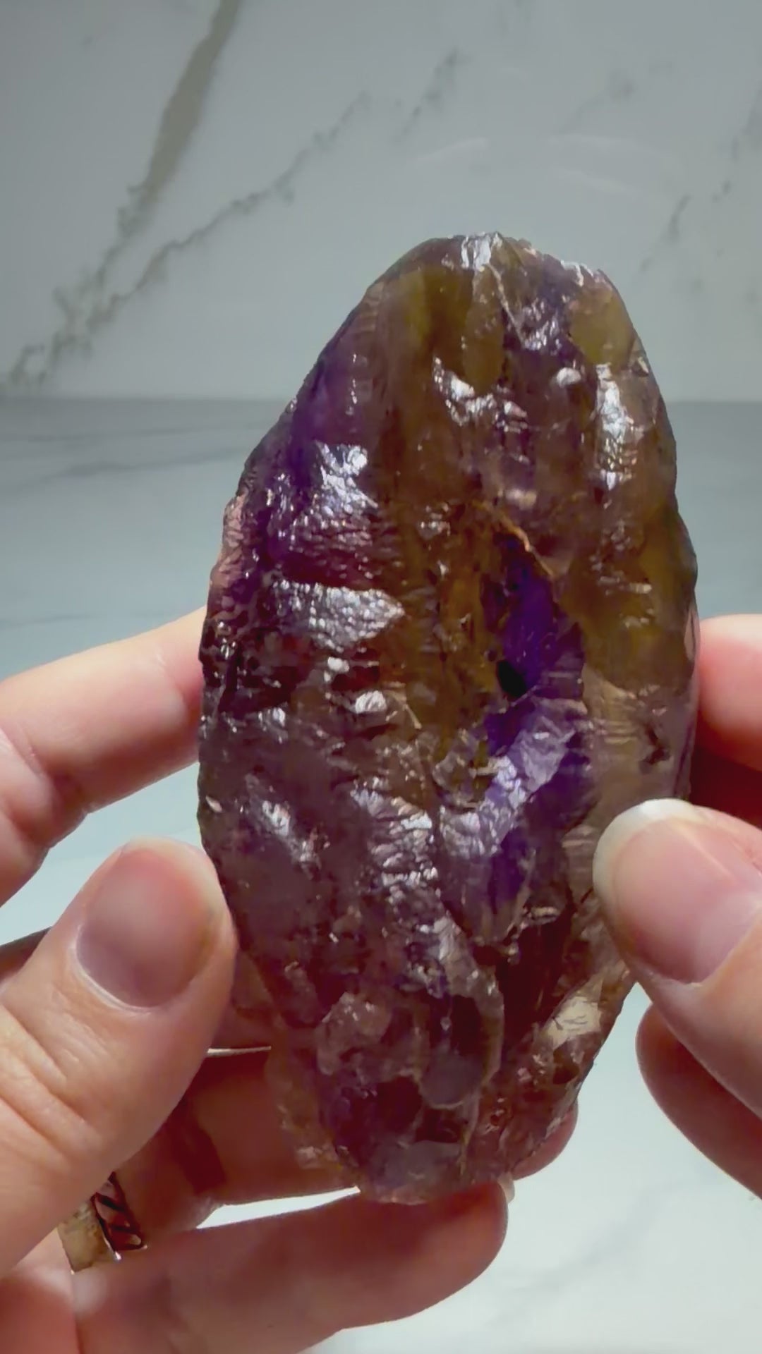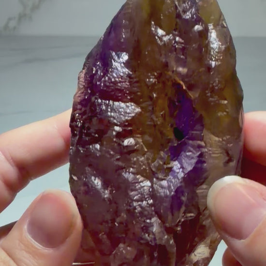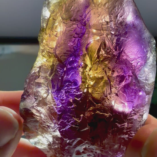 The majority of ametrine specimens currently available worldwide were mined approximately 30 years ago and typically show significant damage, abrasion, or incomplete crystal preservation. In contrast, this piece retains sharp internal clarity, strong color zoning, and intact etched surfaces, qualifying it as A-Grade material.