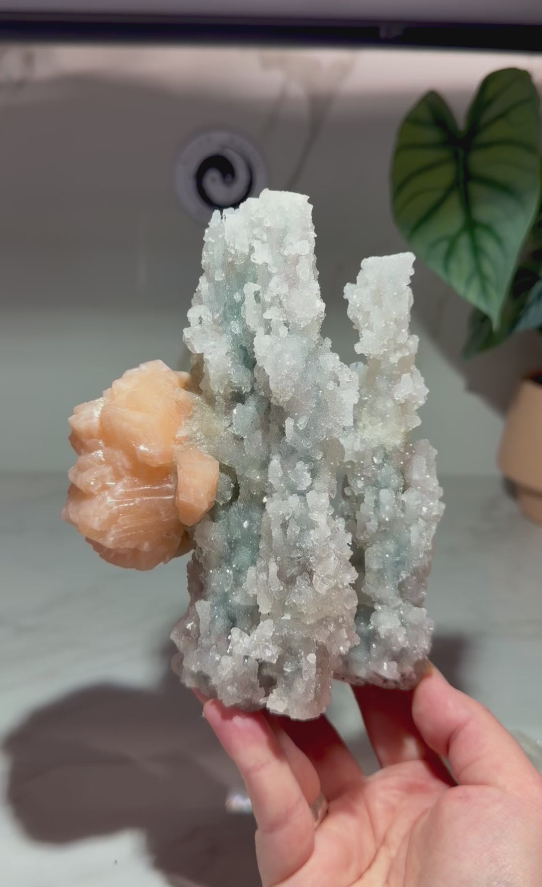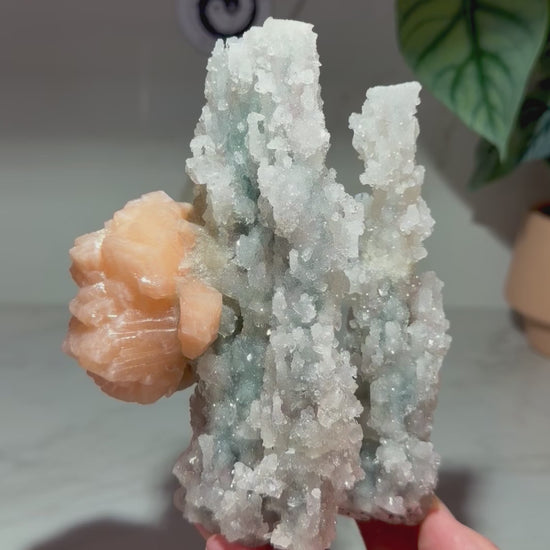 A chunky, glittering chalcedony formation with strong vertical texture and a peach stilbite fan growing right off the side like a flower bloom. The chalcedony surface is packed with sparkle, and there are apophyllite touches tucked into the structure that pop!