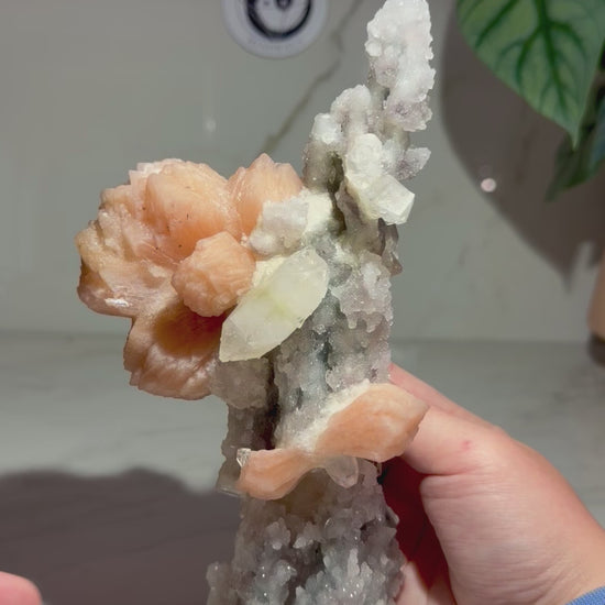 This one is all contrast: a large sparkly chalcedony stalactite column paired with a large peach stilbite fan and a standout apophyllite crystal perched as a focal point. The chalcedony has that fine “sugar” shimmer, and the composition is balanced- bold on one side, textured and vertical on the other.