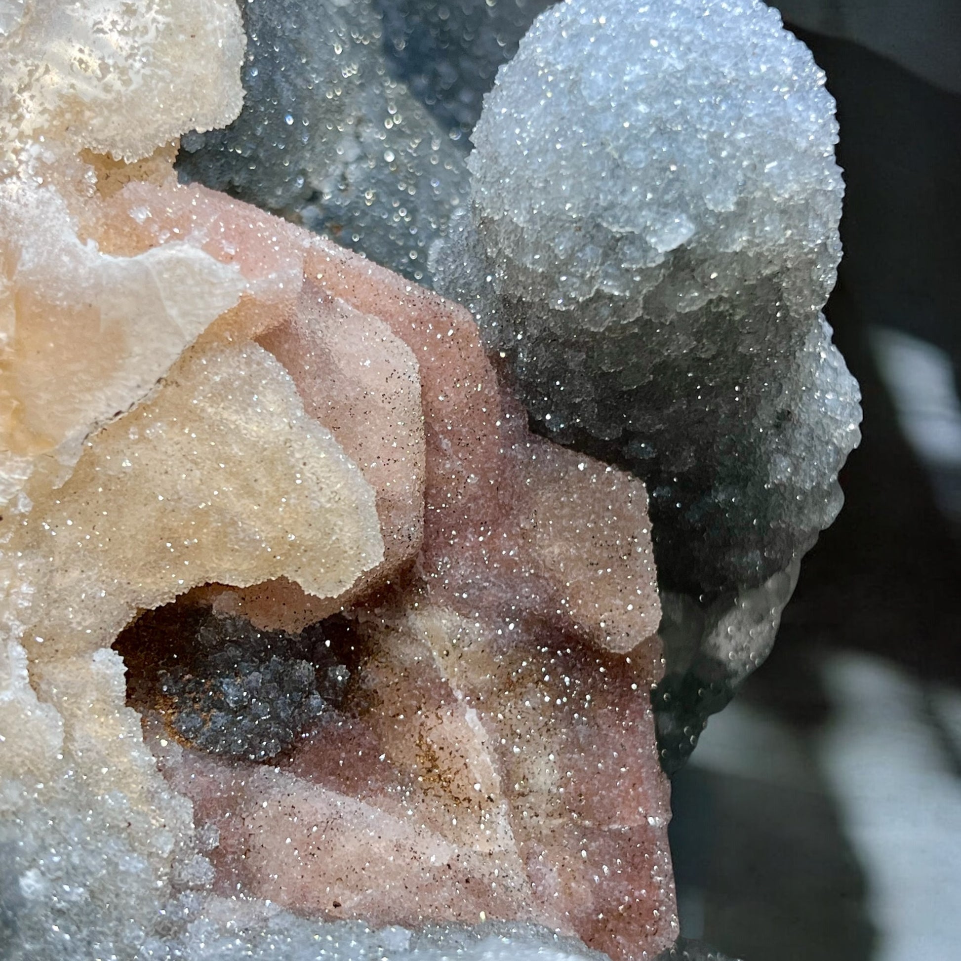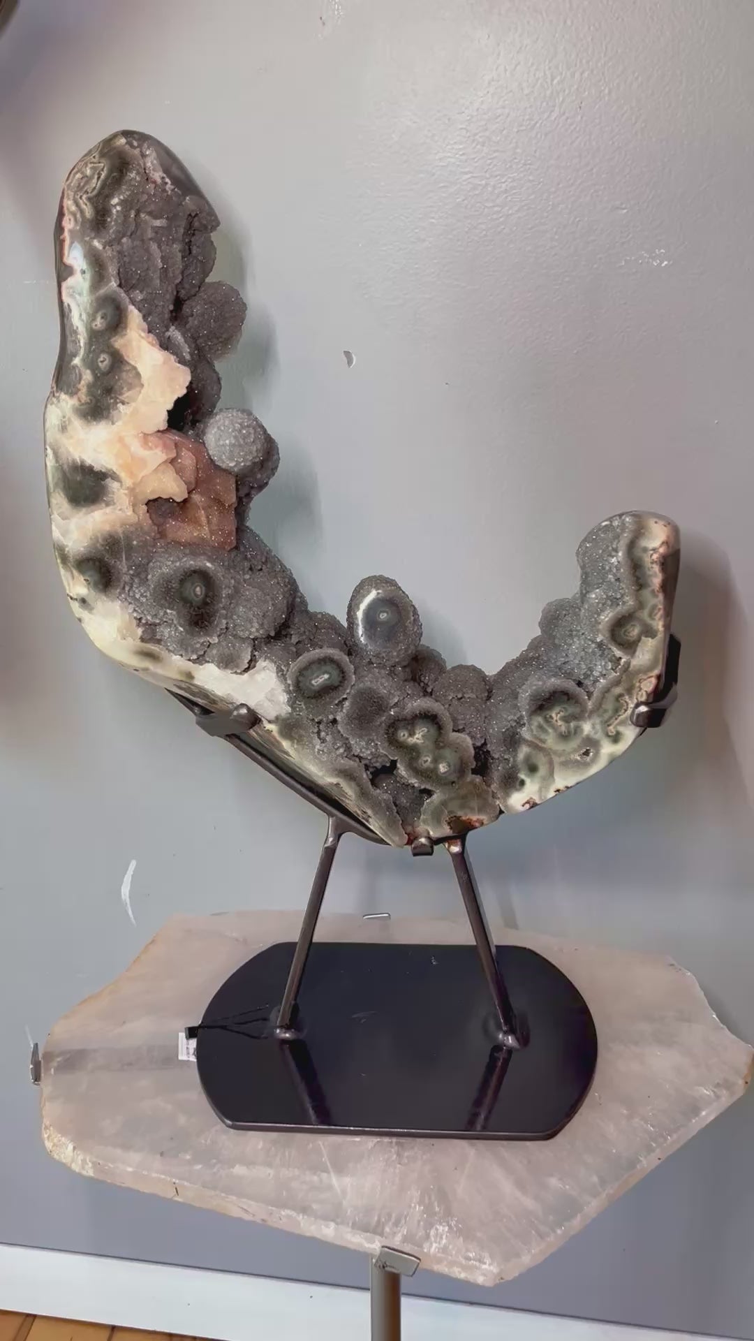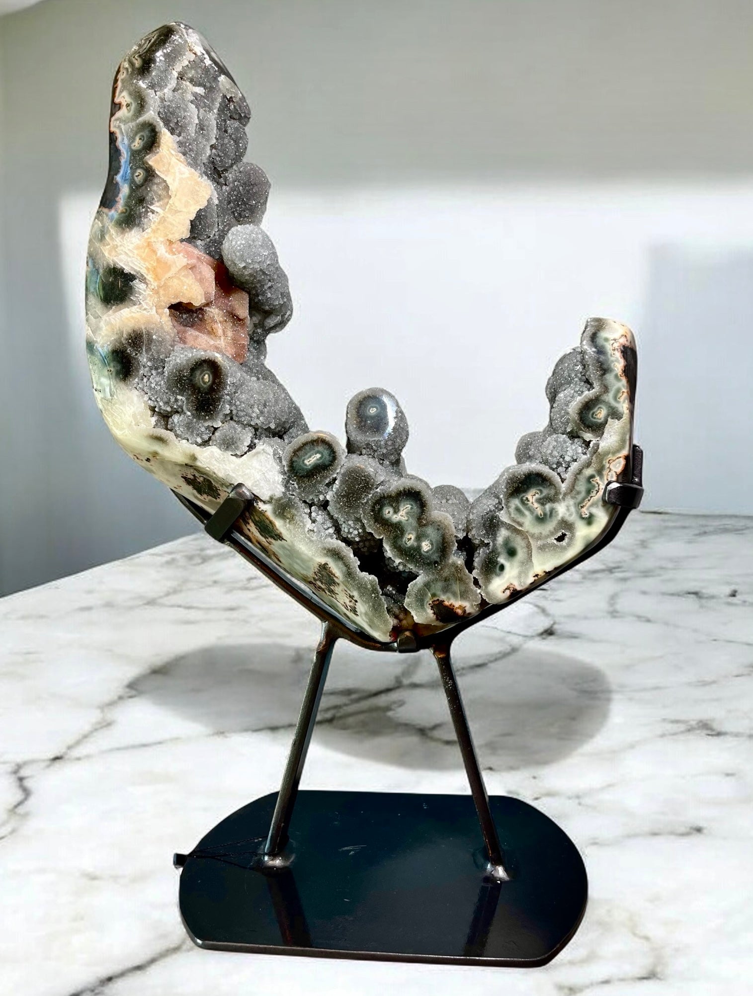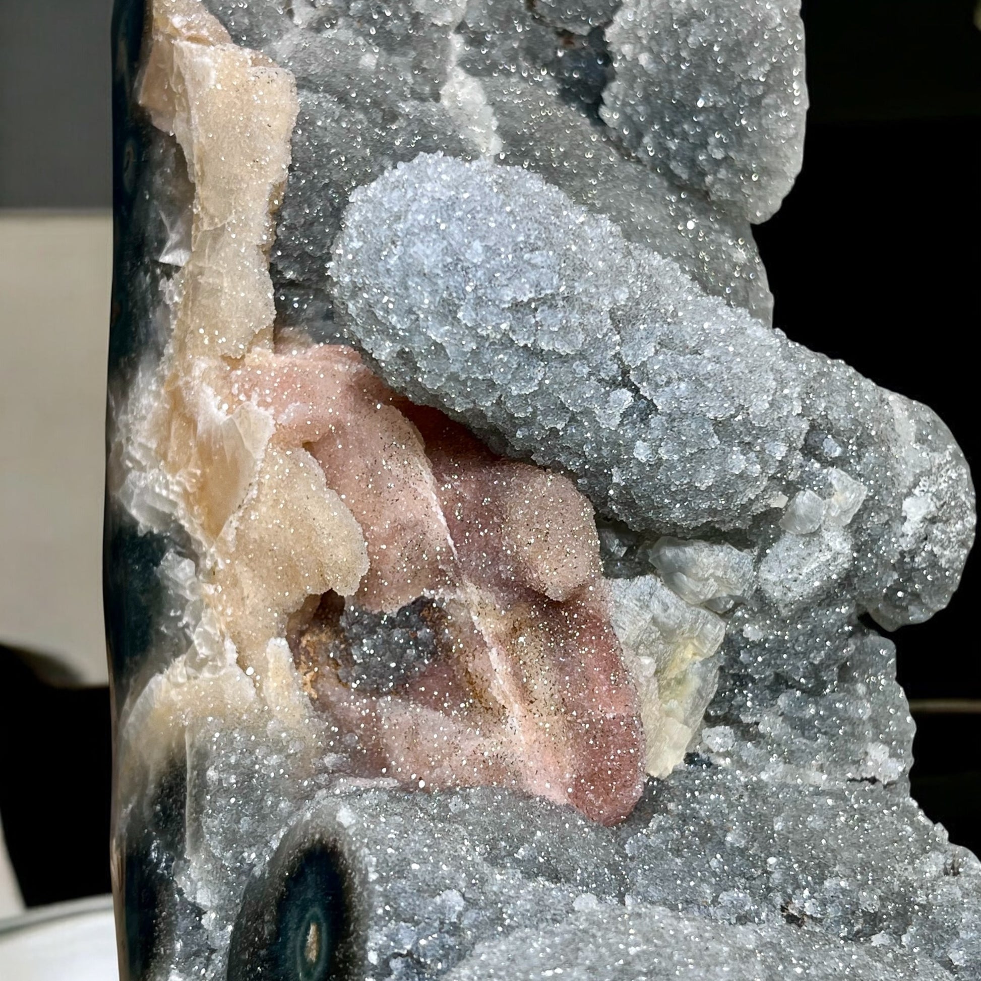 Soft tones of dusty pink, stormy blue, and smoky grey flow throughout the piece, layered with crystallized calcite and delicate flecks of micro pyrite. This is not just a mineral specimen—it’s natural sculpture, formed deep within the Earth and expertly cut to reveal its full grandeur.