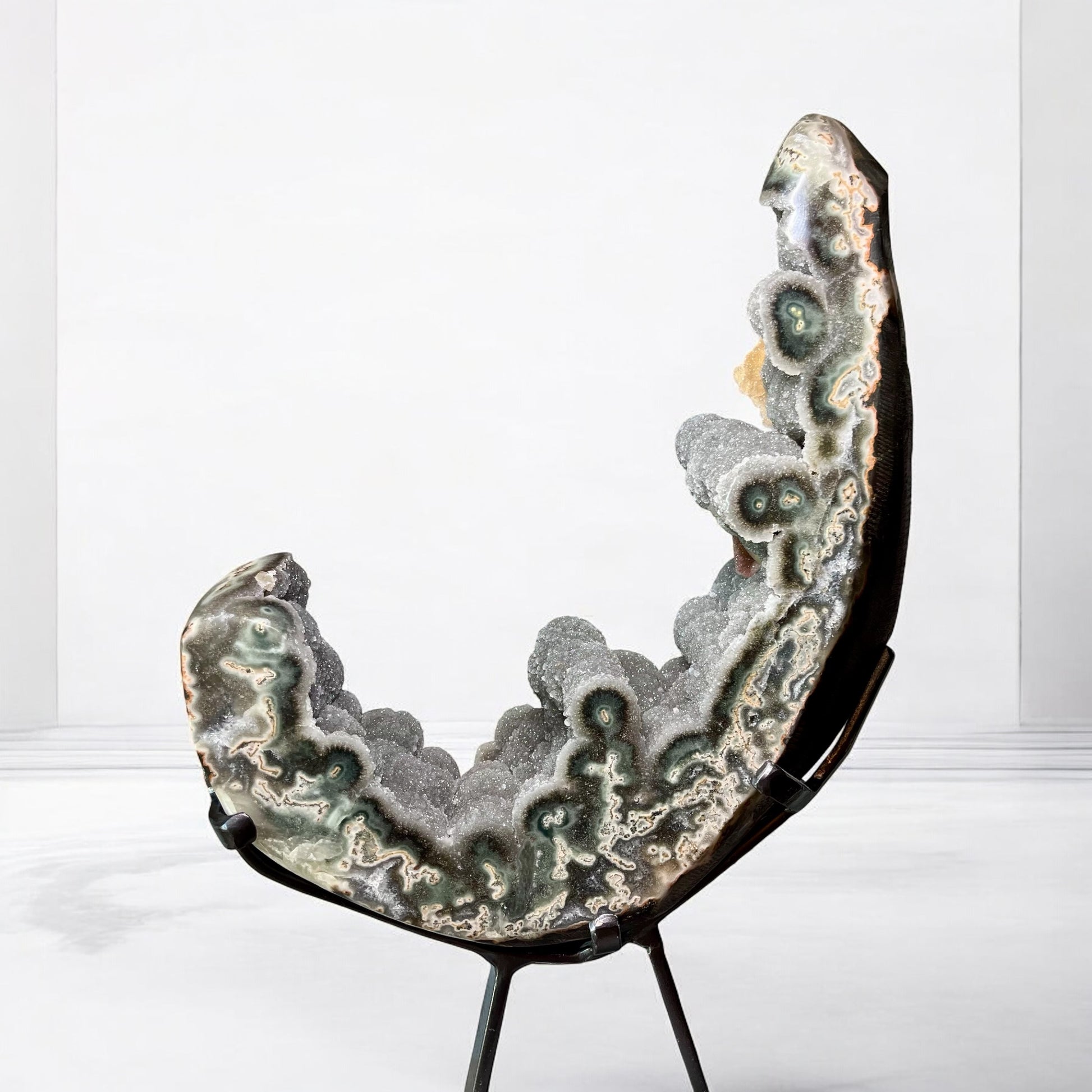 A breathtaking statement piece from Artigas, Uruguay—this dramatic crescent-shaped jasper sculpture showcases nature’s fluid artistry in bold form. Botryoidal and stalactitic textures sweep across the face, blanketed in a shimmering layer of quartz druse that adds endless sparkle from every angle.