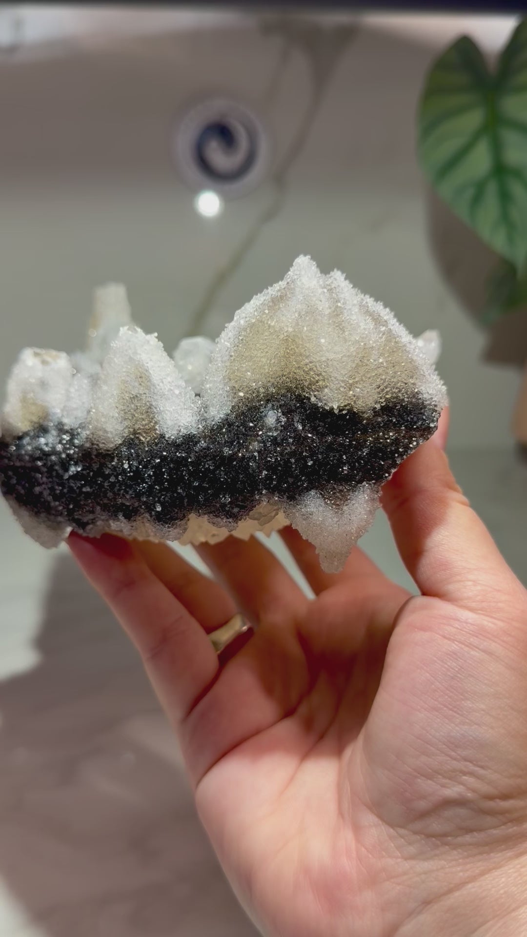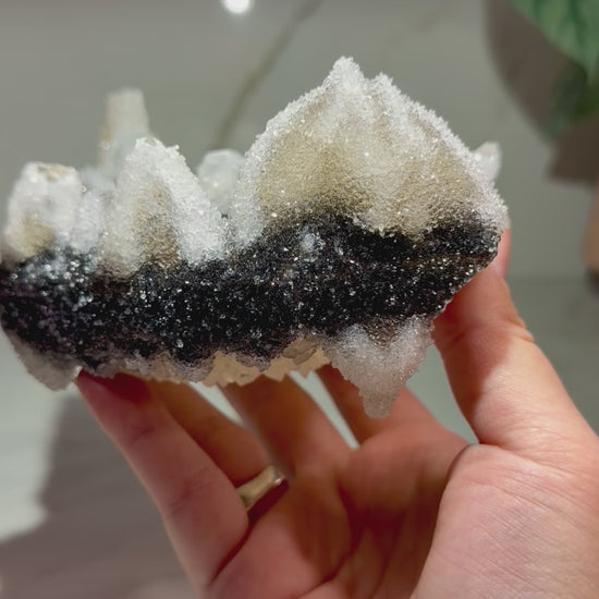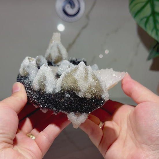 This crystal has a uniquely striking look! The broad central crystal gives it an unusual appearance you don’t see every day, while a dark strip of goethite adds strong natural contrast across the surface. Around the edges, sharp pointed calcite crystals create a crown-like border that frames the main, flat hexagonal calcite crystal beautifully. On one edge sits a smaller hexagonal calcite coated in black sparkling goethite, adding another standout detail and even more character. There is a lot to take in with this specimen, and the mix of geometry, texture, and yin-yang contrast keeps it captivating from every angle.