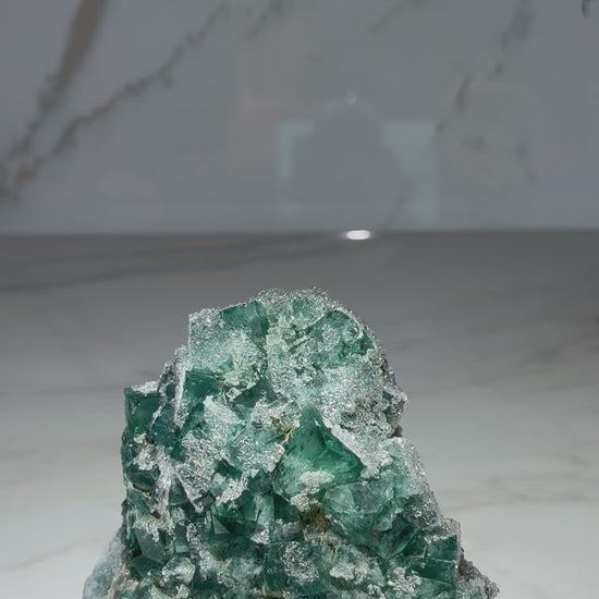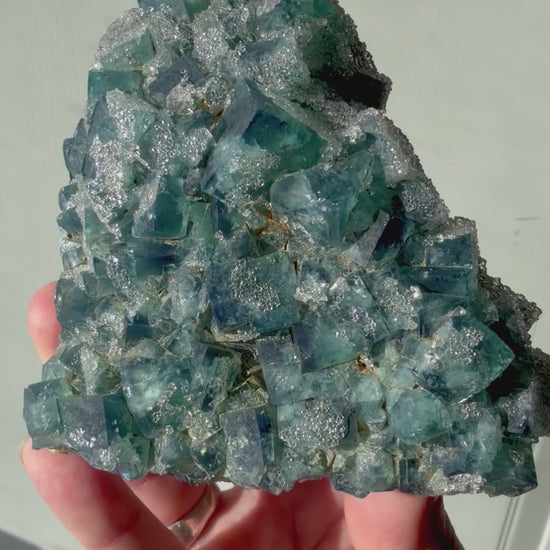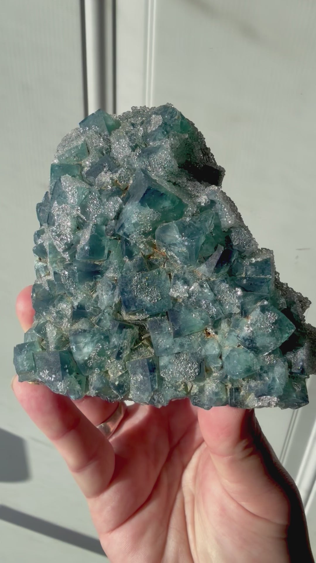 This piece is daylight fluorescent, meaning the fluorite visibly turns blue when exposed to direct sunlight, offering an interesting color shift that is not present under standard indoor lighting.