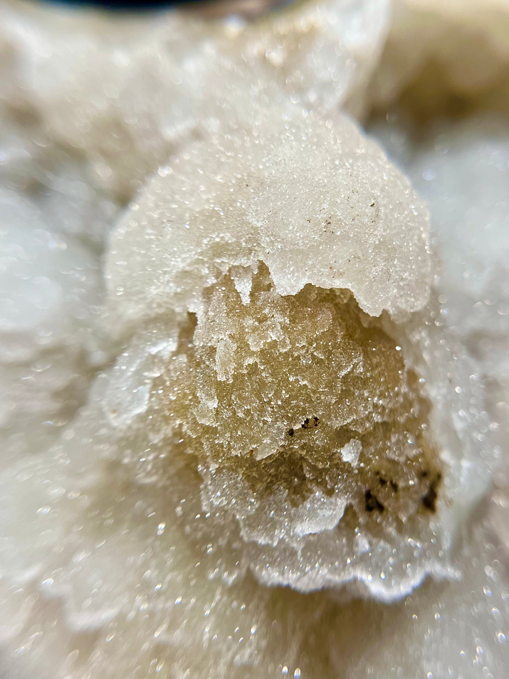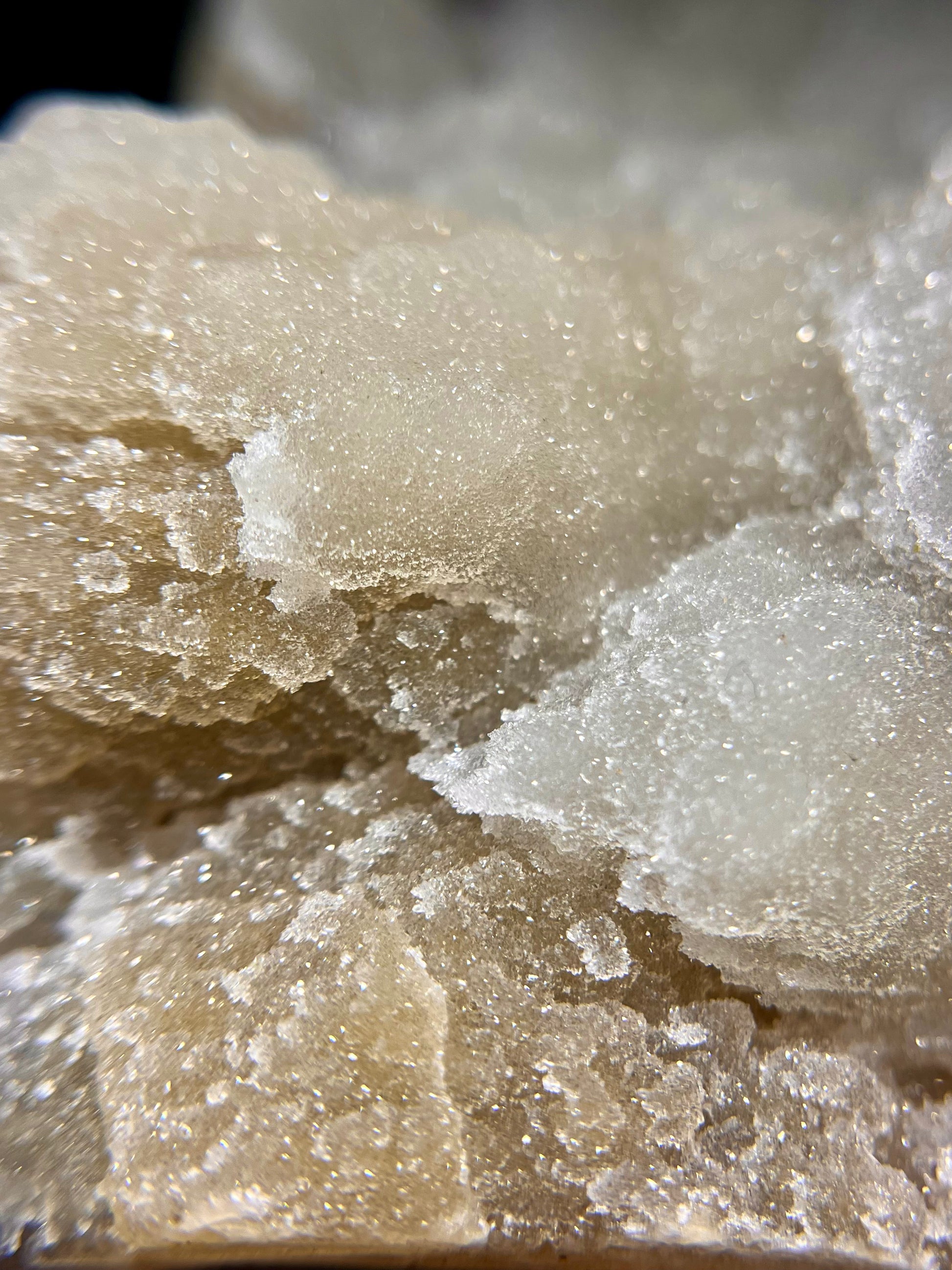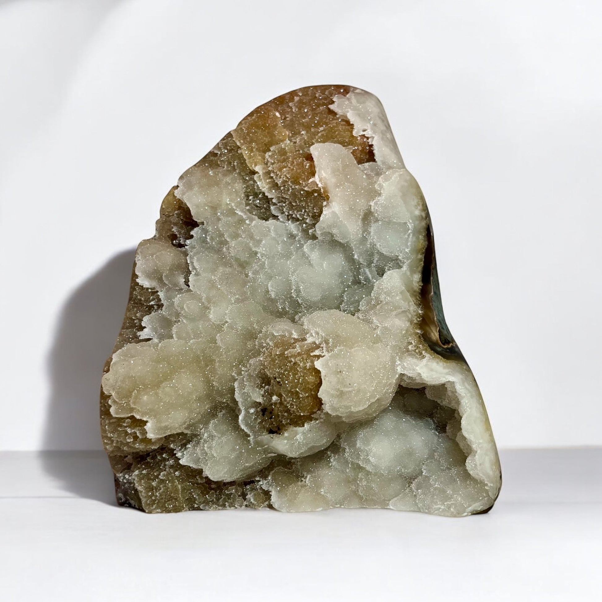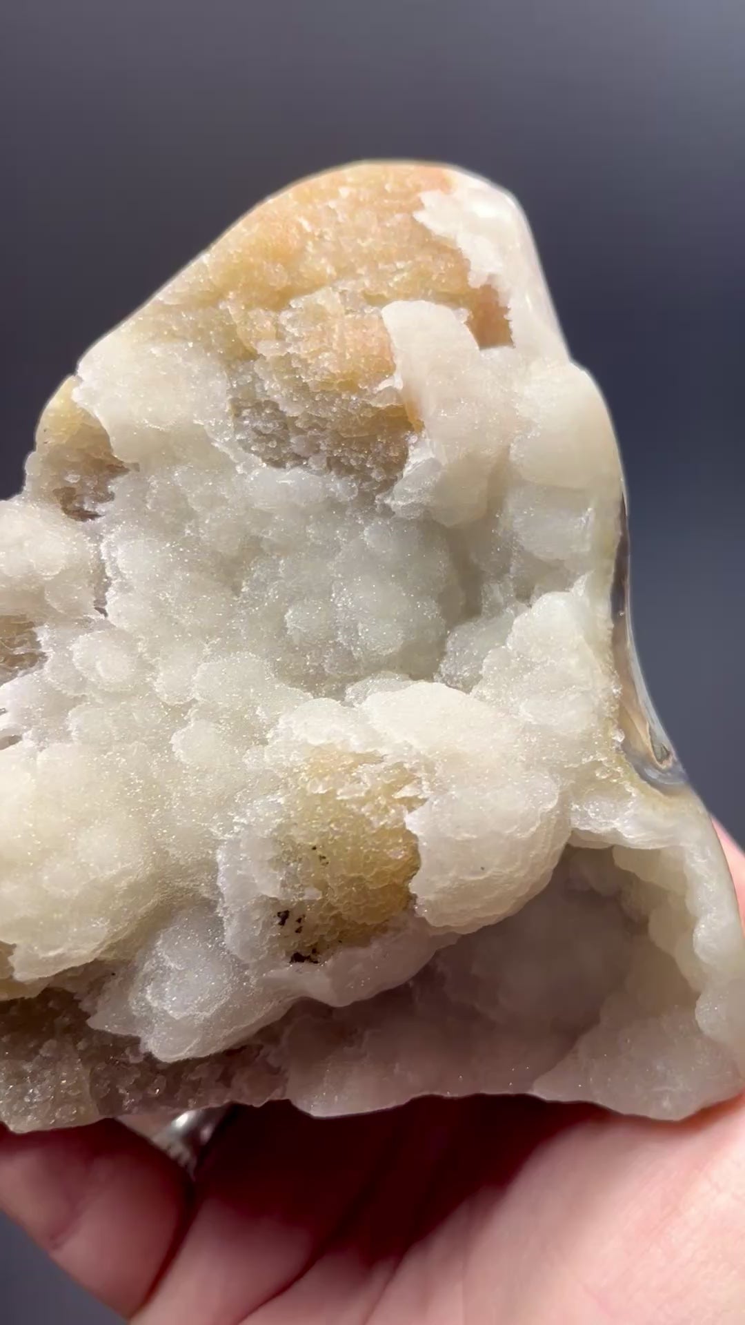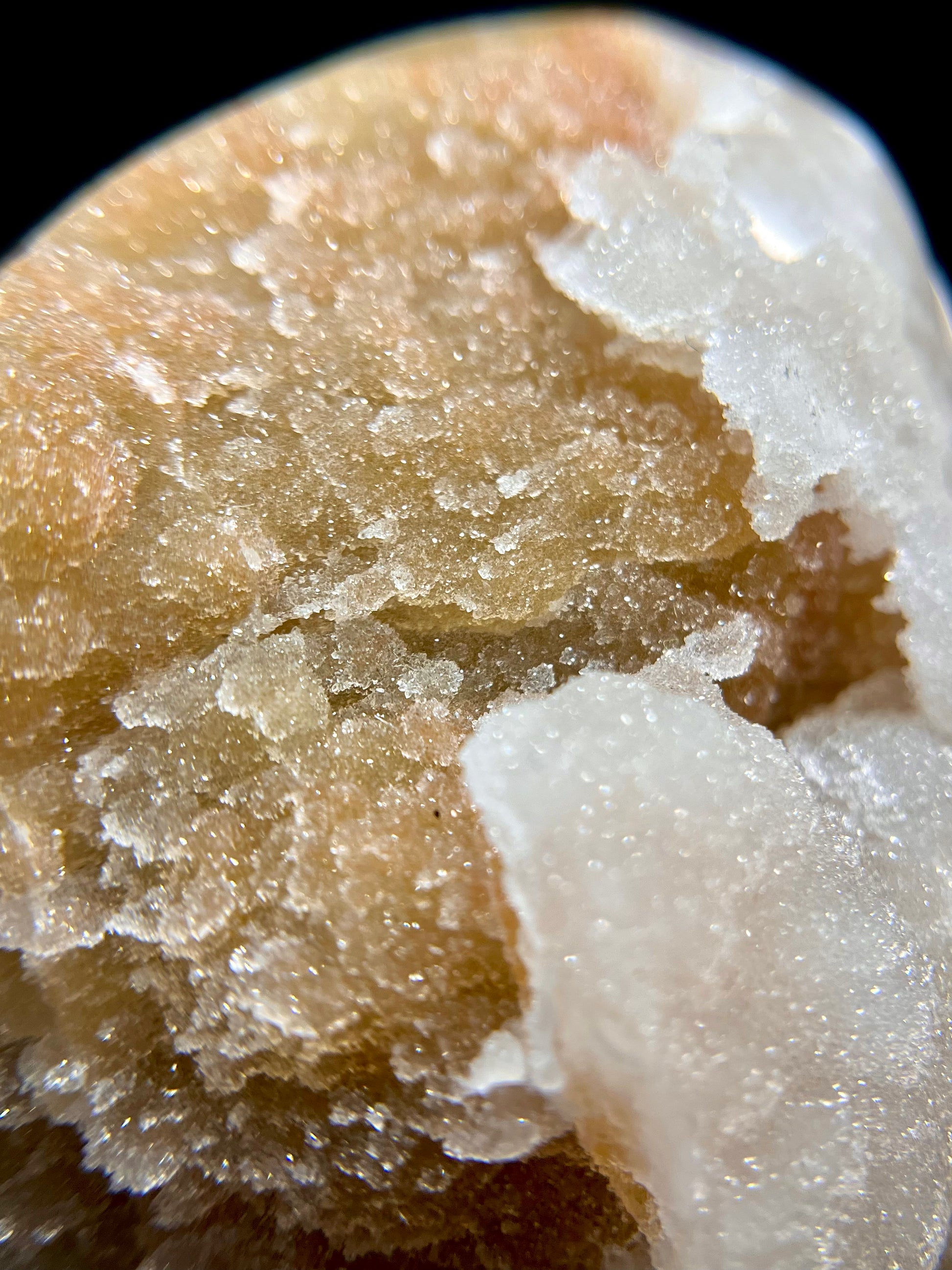 Beautiful orange & white cut base with a fine sugary druzy top coat, agate banding, and sparkling botryoidal formations! This is truly a unique and 1-of-a-kind piece.