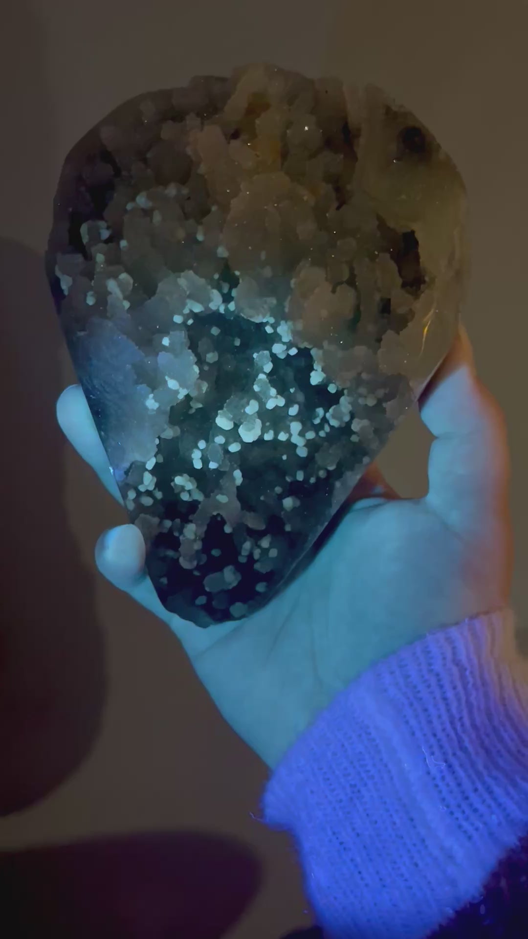This beauty is FULL of druzy! It is a jasper piece with smaller stalactite formations, dotted with smaller cubic calcites that’s glow amazingly under UV light. This is a gorgeous display piece with light polish along the edges, and comes with a custom-fit metal stand!