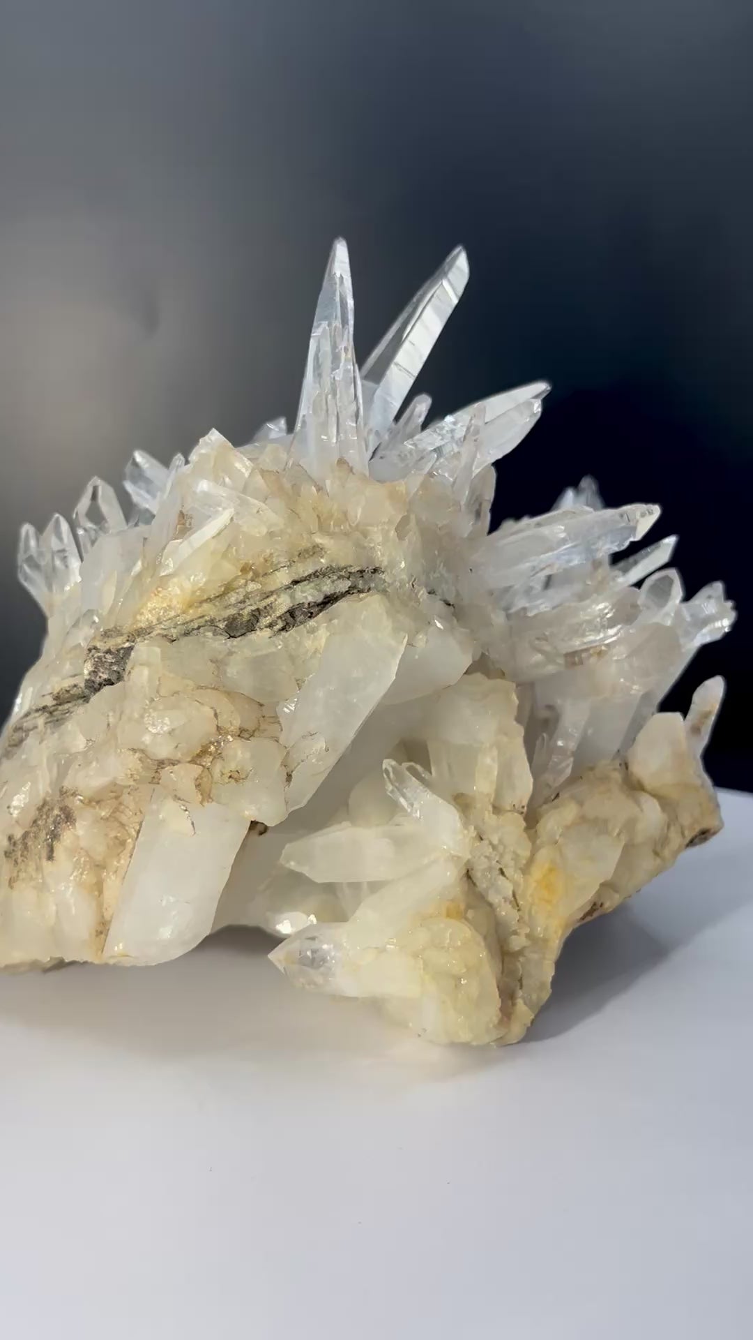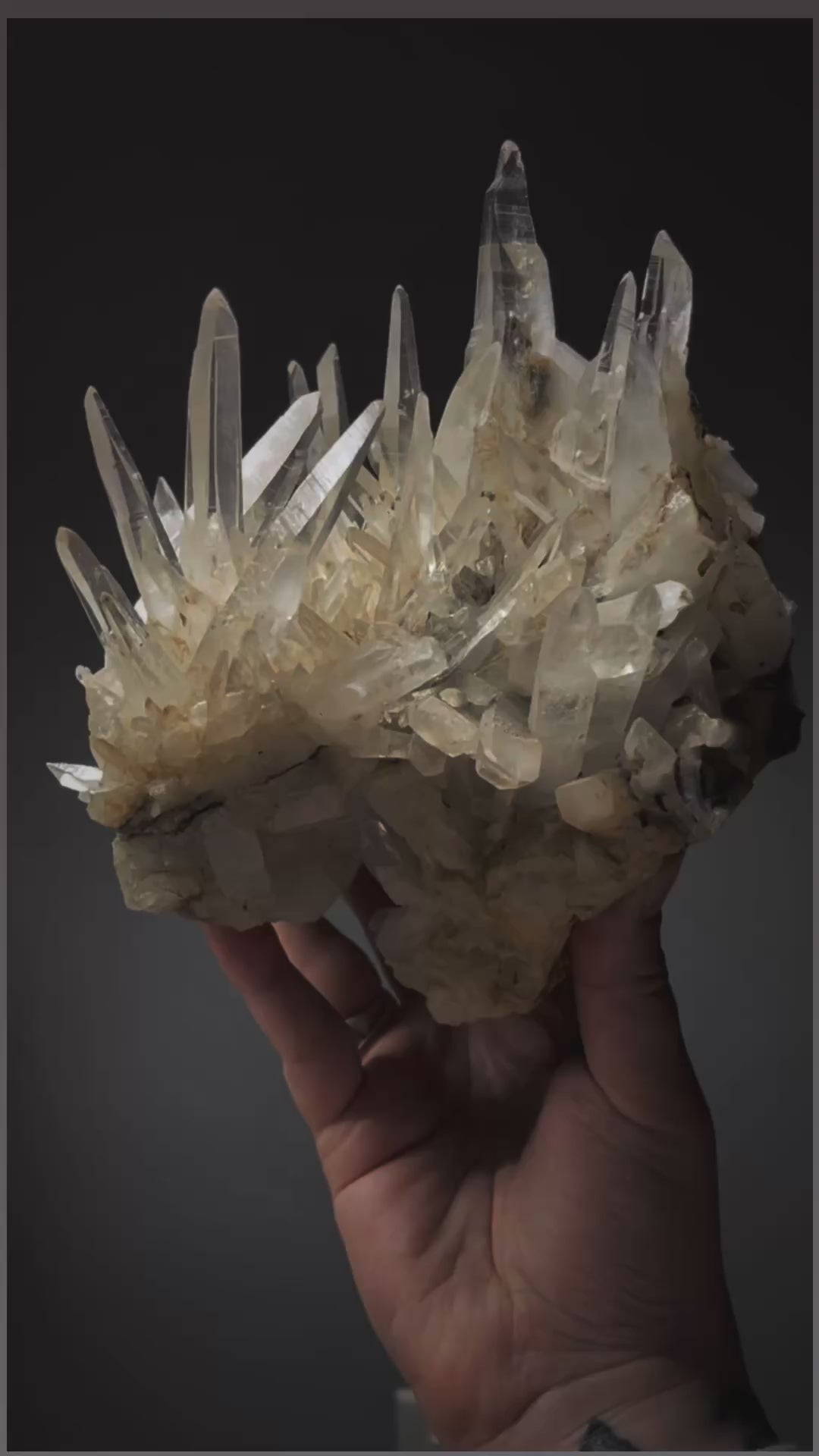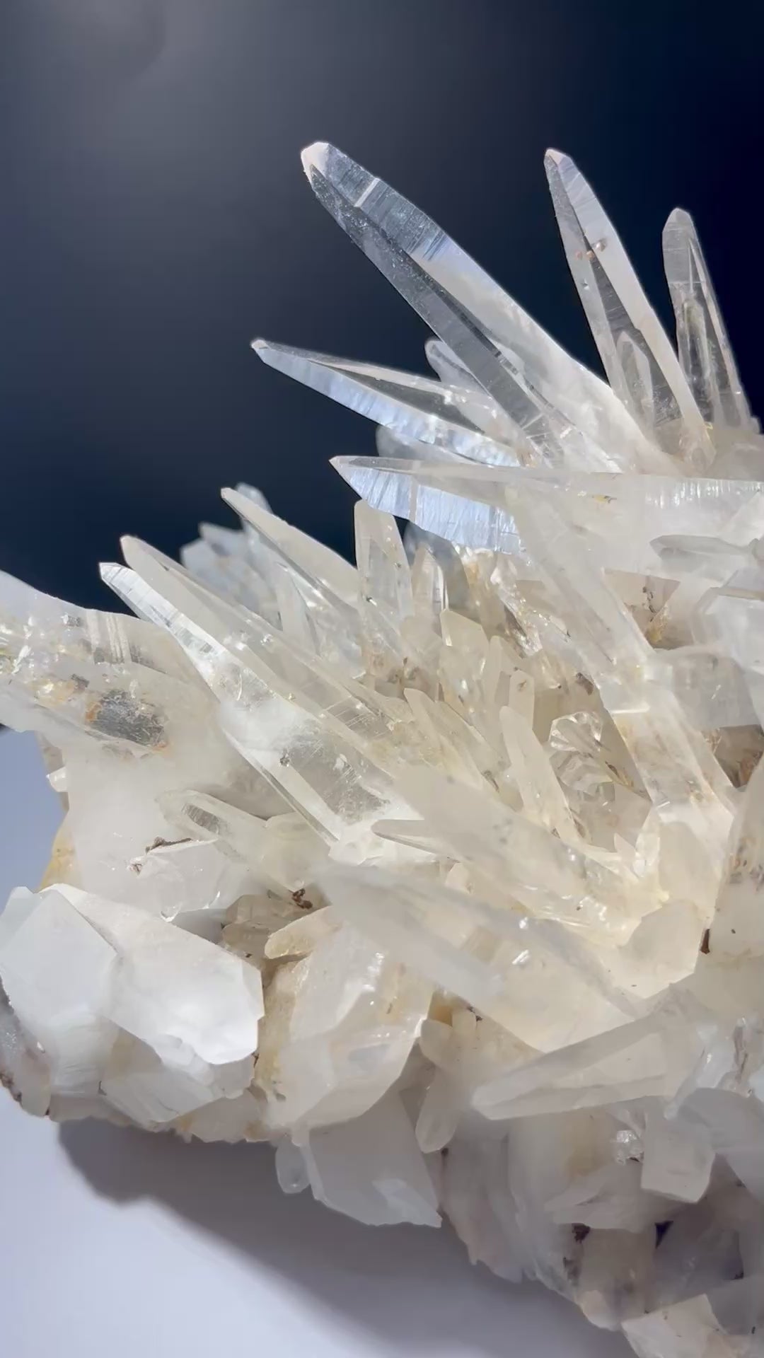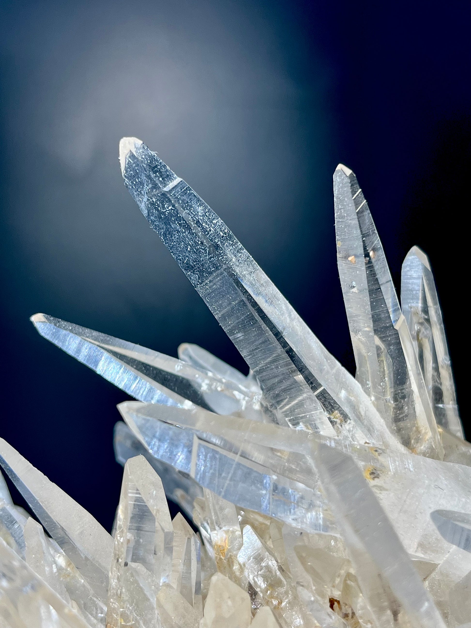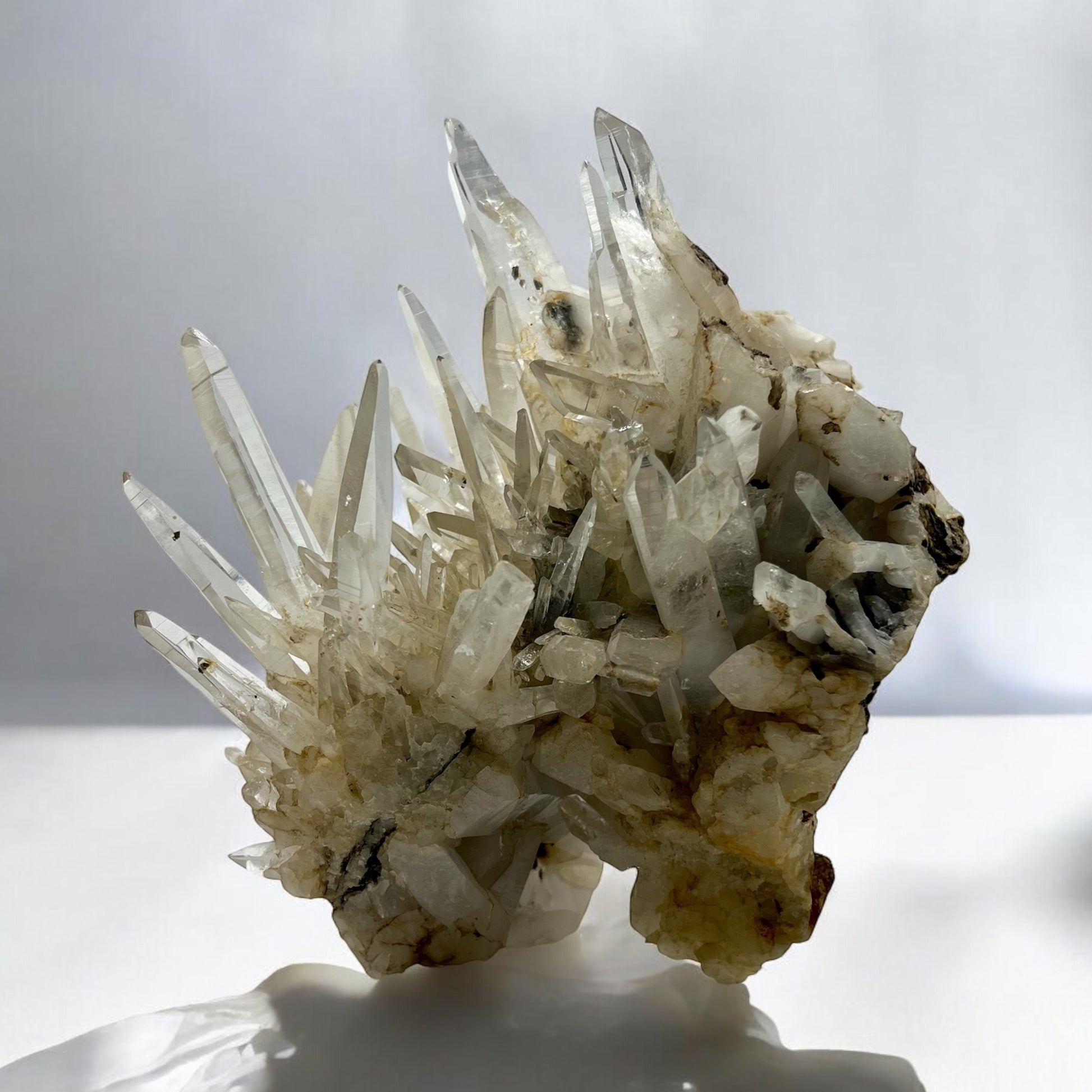 This is a top-quality Muzo habit quartz cluster. Known for its elongated, tapering crystal formations, Muzo habit quartz is named after the famous emerald region of Muzo, Colombia, where similar growth patterns are found. This specimen features sharp, well-formed points with excellent clarity, resting on a natural matrix. A prime example of its kind, it showcases the distinctive aesthetics and rarity that make Muzo habit quartz highly valued among collectors.