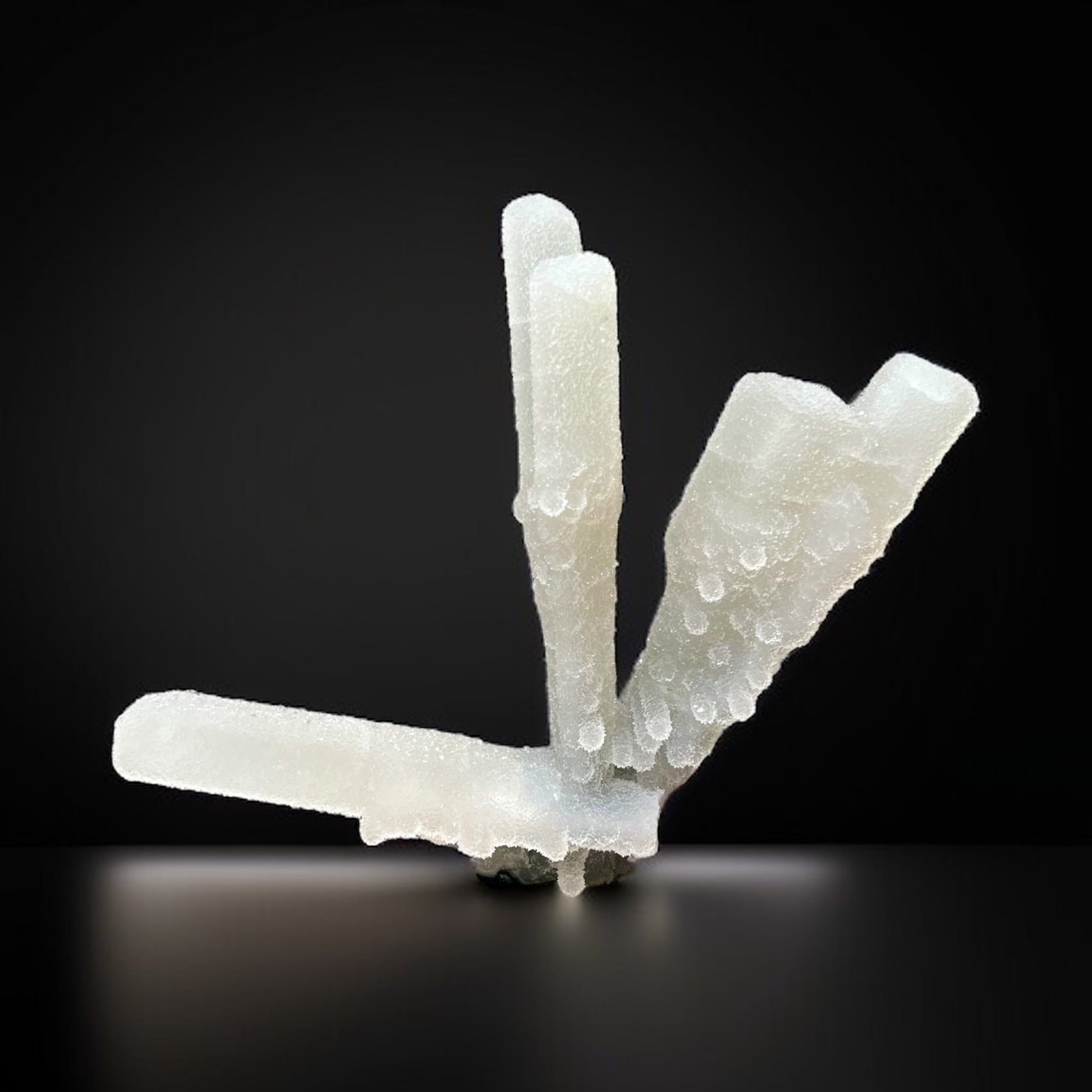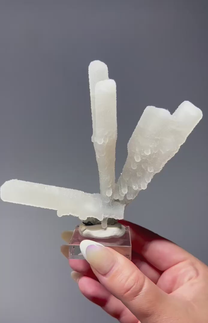 The result is a dynamic and frosty formation that appears almost otherworldly, with each arm of the cluster glittering under light like sugar-coated ice. From some angles, subtle smoky hues from the selenite core peek through the translucent chalcedony veil.