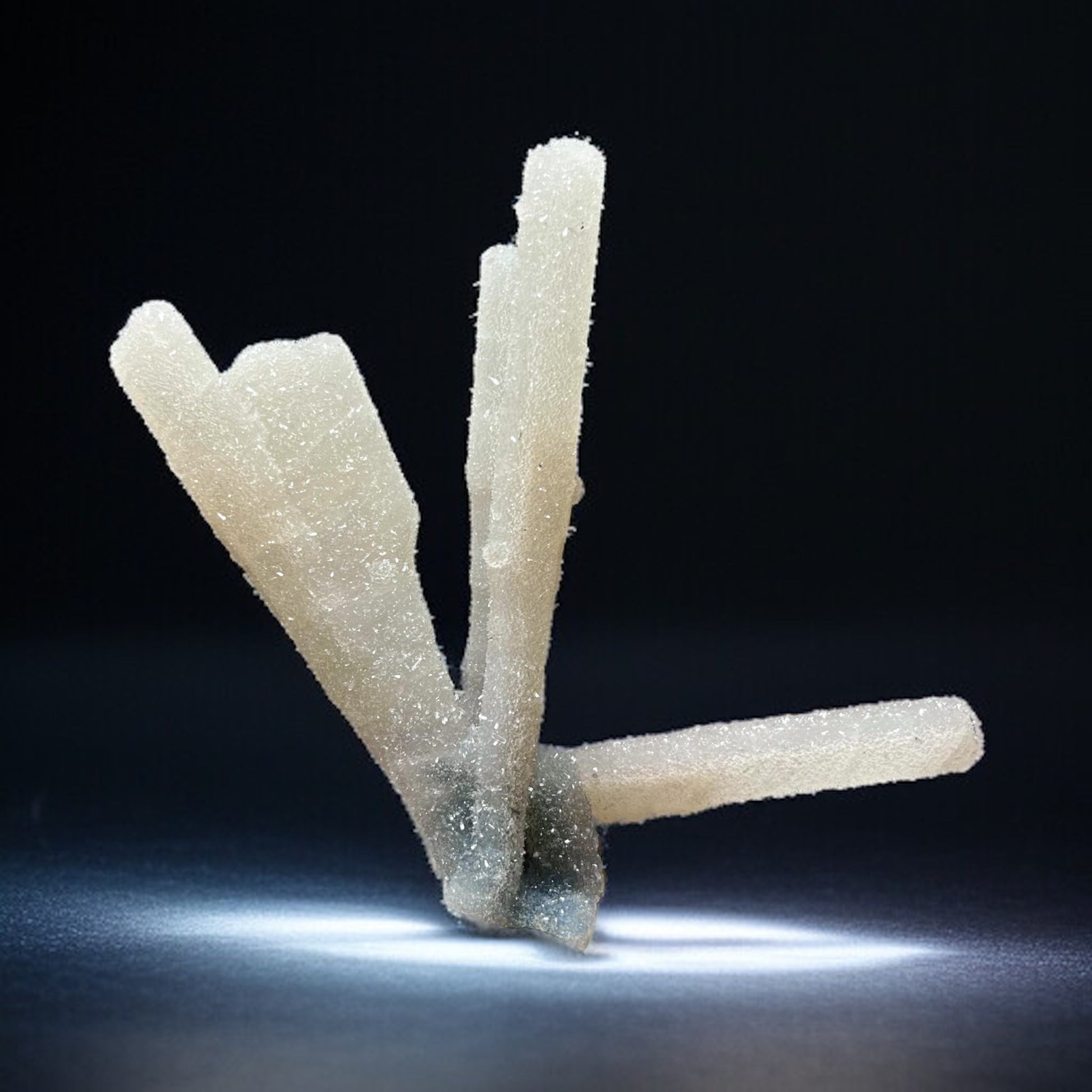 A surreal and sculptural cluster of elongated selenite crystals, naturally coated in a fine druse of sparkling white and blue chalcedony. Unlike true pseudomorphs where the original mineral has been completely replaced, this piece still contains intact selenite within — making it a rare example of chalcedony encrusting selenite, not replacing it.