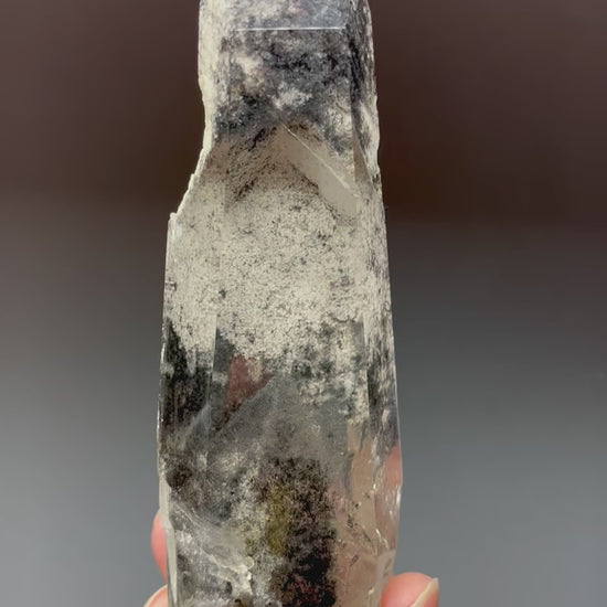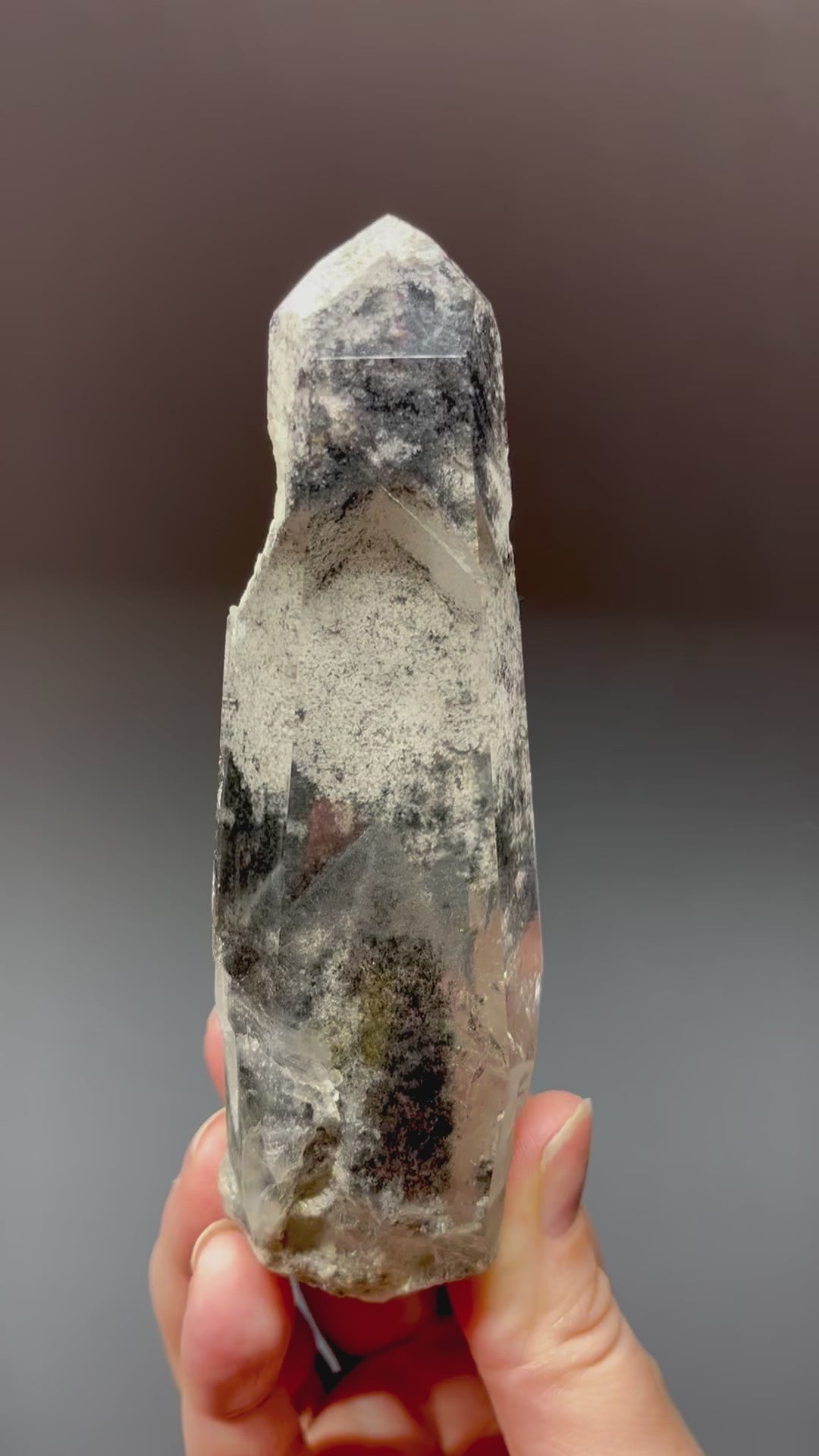This is one of those pieces that pulls you in the longer you look at it. Semi-polished faces frame a dark, sharply defined phantom rising through the center, with soft lodolite inclusions creating a layered “landscape” inside the quartz. The contrast between the extreme clarity, natural etchings, and the velvety inclusions gives this crystal a really elegant feel!