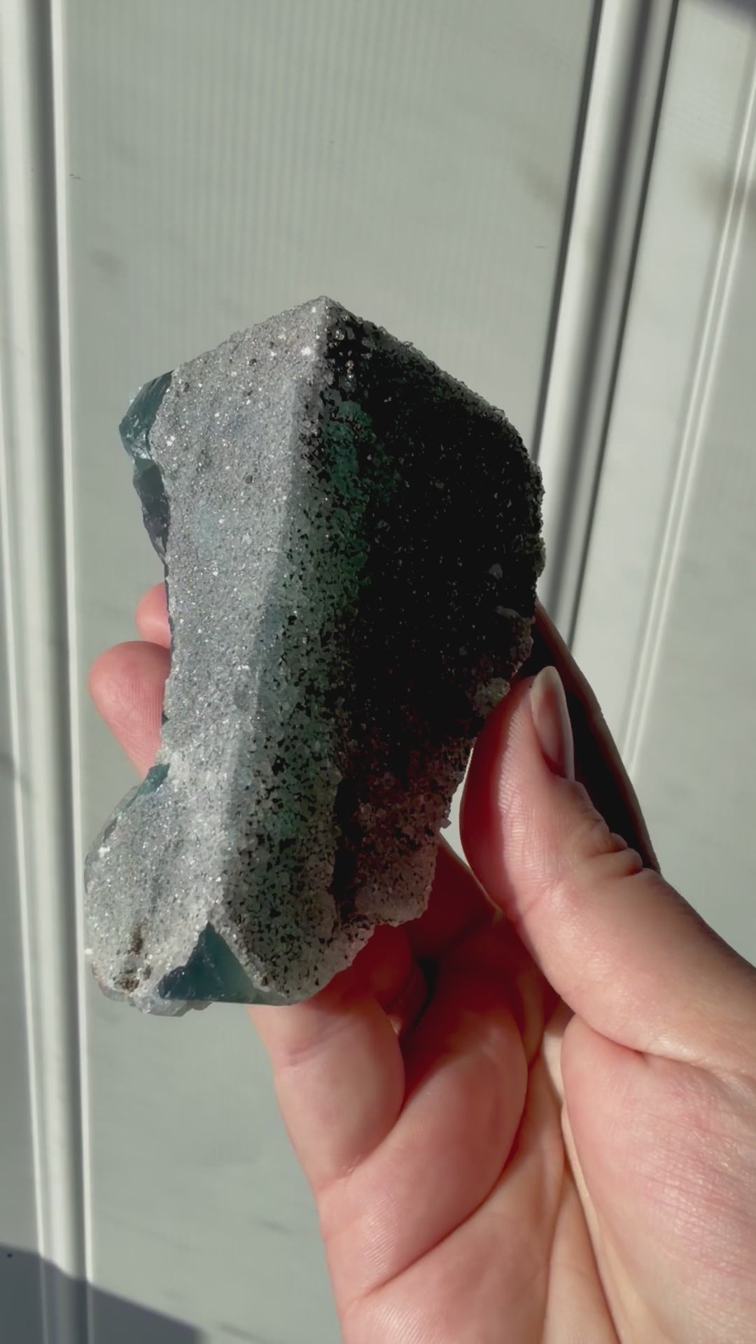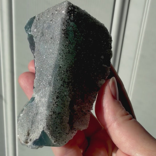 This piece is daylight fluorescent, meaning when it’s exposed to natural sunlight, the fluorite shifts from green to noticeable blue tones, a reactive effect caused by trace activator elements within the crystal structure.