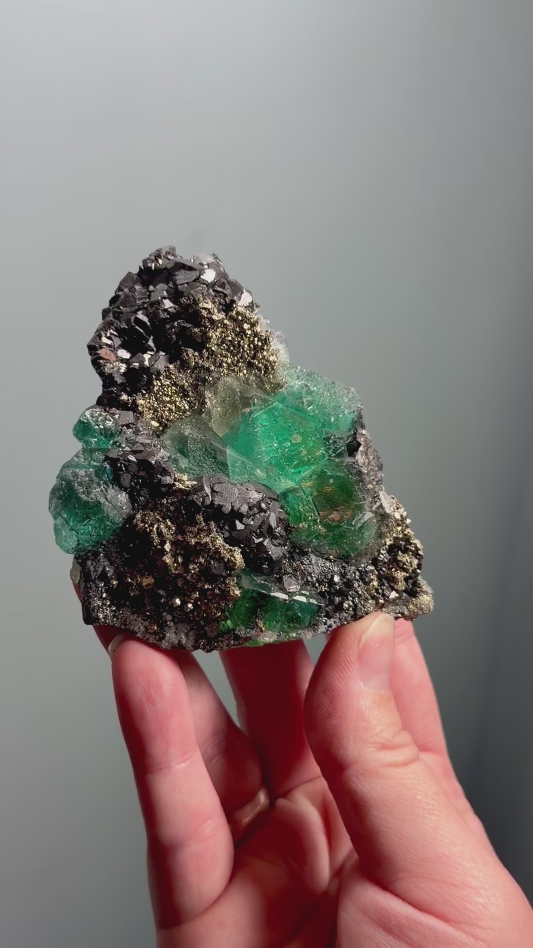 Set on a dense sulfide matrix of bright cubic galena, sparkling pyrite, and darker sphalerite, all working together to create strong color contrast. The minerals are well distributed throughout, giving the piece a cohesive, complete look from every angle.