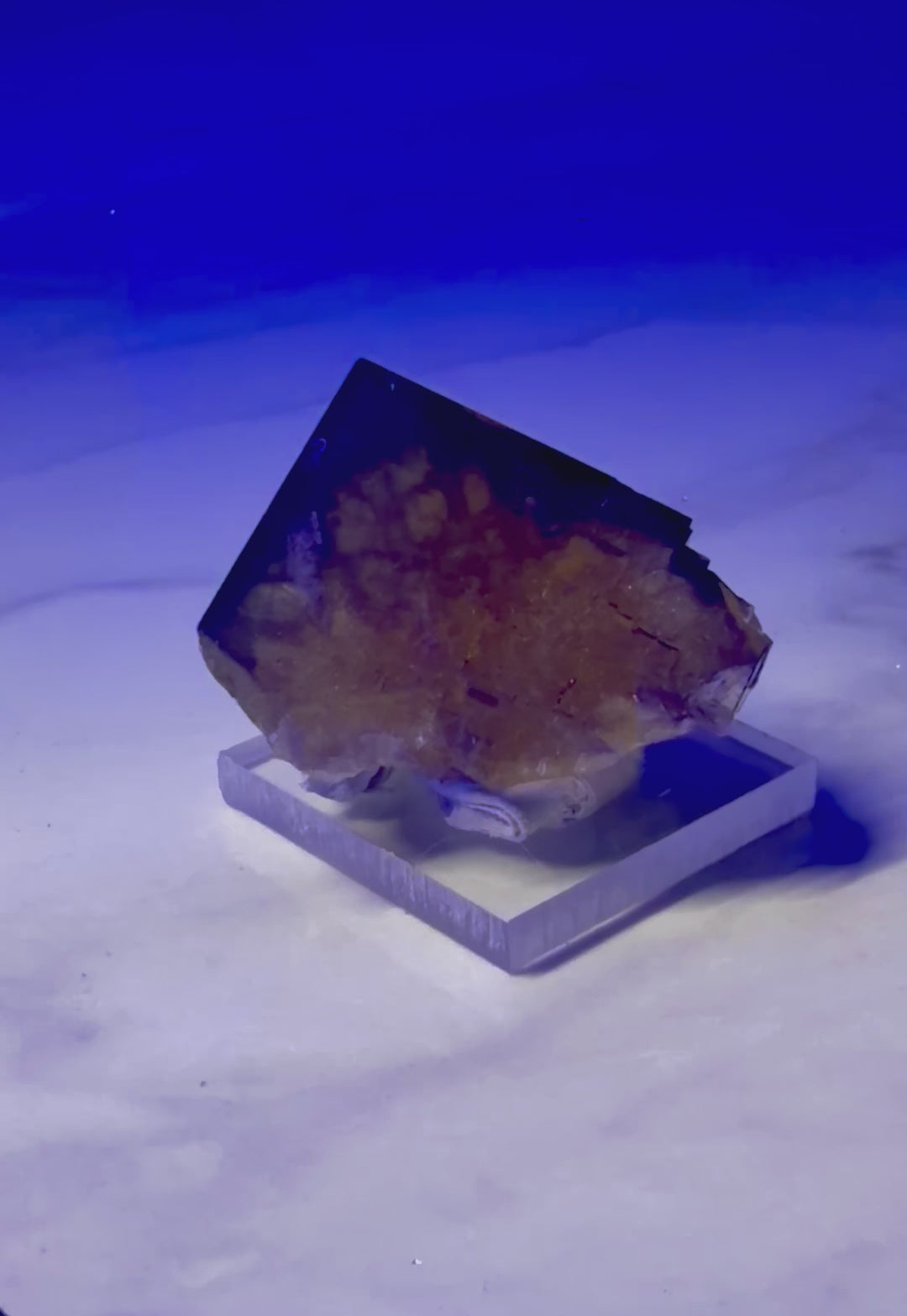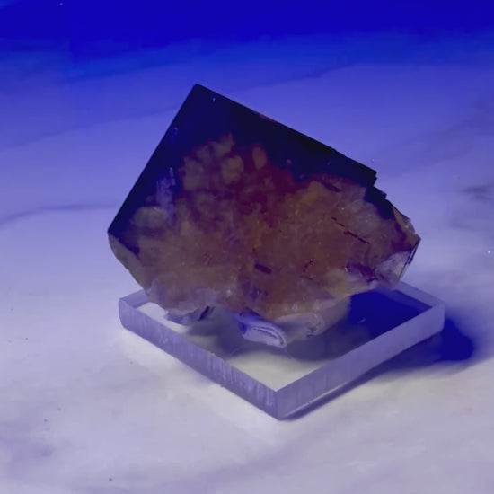 This exceptional fluorite from the Minerva No. 1 Mine in southern Illinois exhibits the unmistakable golden-to-violet blue zoning and clarity that made this locality world-famous. Sharp cubic faces reveal a luminous amber core capped by rich blue-violet edges, with delicate internal wisps and speckles of bitumen inclusions visible just under the surface of the crystal, distinctly glowing under UV light. The interplay of color, transparency, and organic inclusions captures the unique hydrocarbon-rich environment that shaped Minerva’s most iconic specimens.