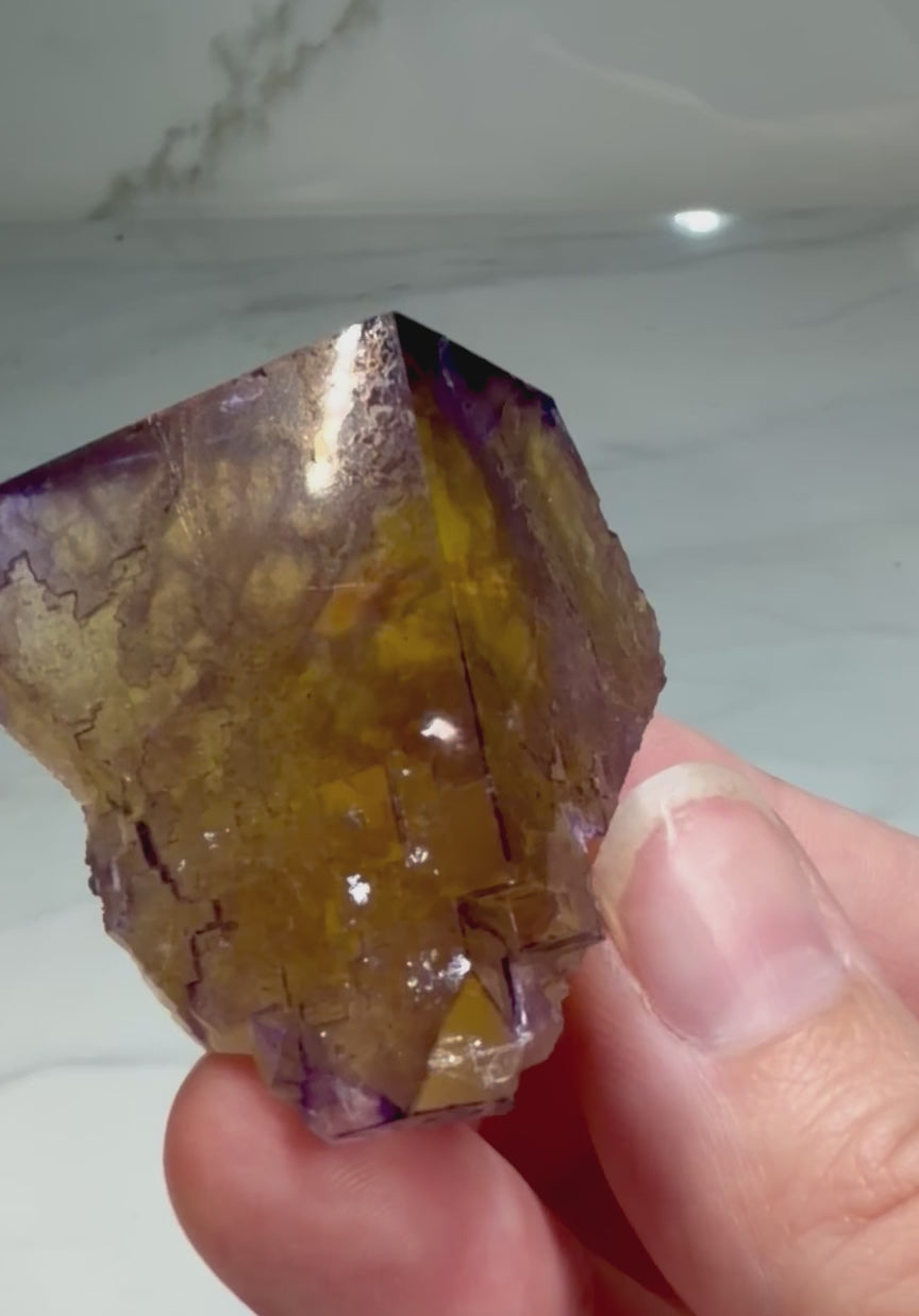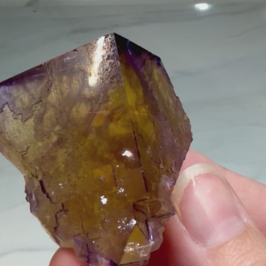 - Color & zoning: Transparent golden core transitioning to deep violet margins.