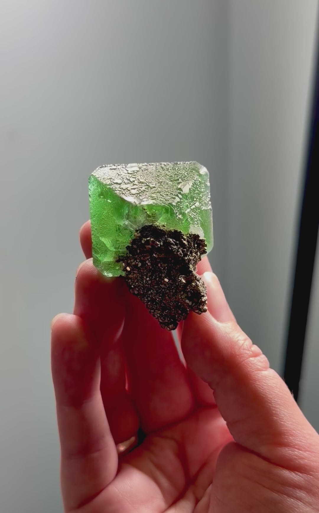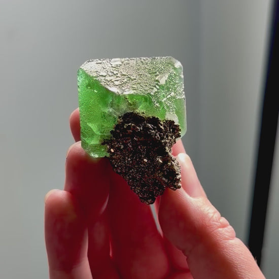 This is a really aesthetic green octahedral fluorite sitting over a bed of sparkling pyrite. The color is strong and clean, and it has that classic Milpo glow you only find in the higher quality pieces.