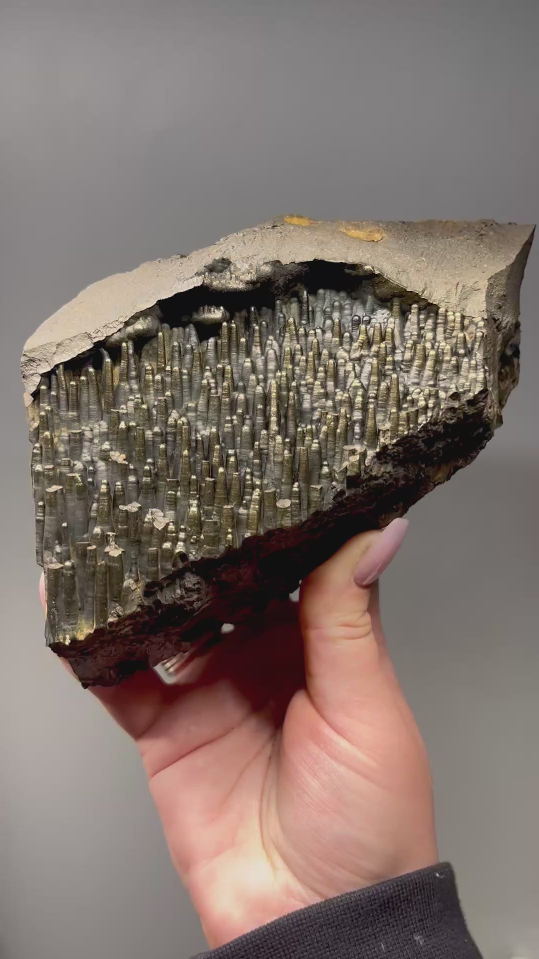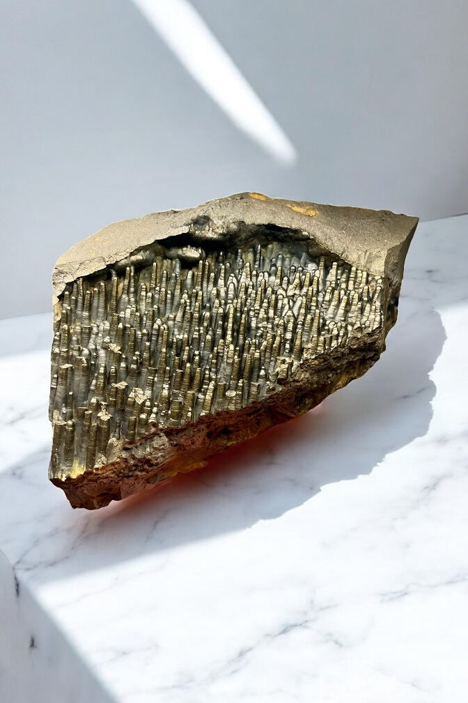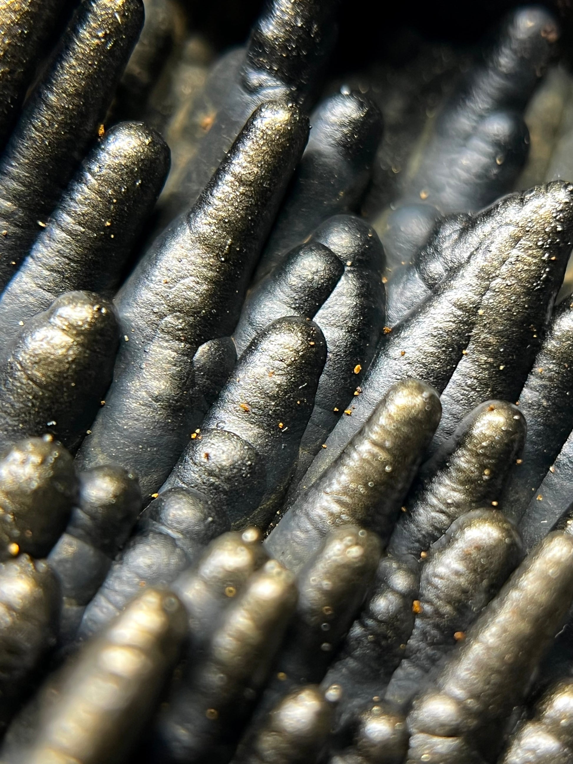 This piece is just wild. A dense wall of metallic stalactites, each one perfectly stacked like nature’s own skyline. The shimmer is that classic goethite gold-bronze, and the texture feels almost too precise to be natural—but it is.