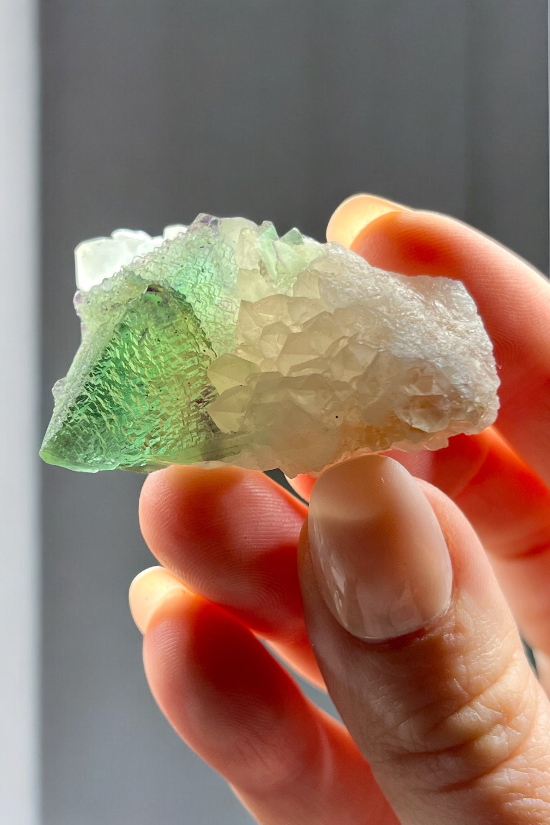 This aesthetic cluster has two conjoined octahedral fluorite crystals with a stepped formation. They are bright green with purple zoning. These two sit on a bed of mini terminated quartz points.