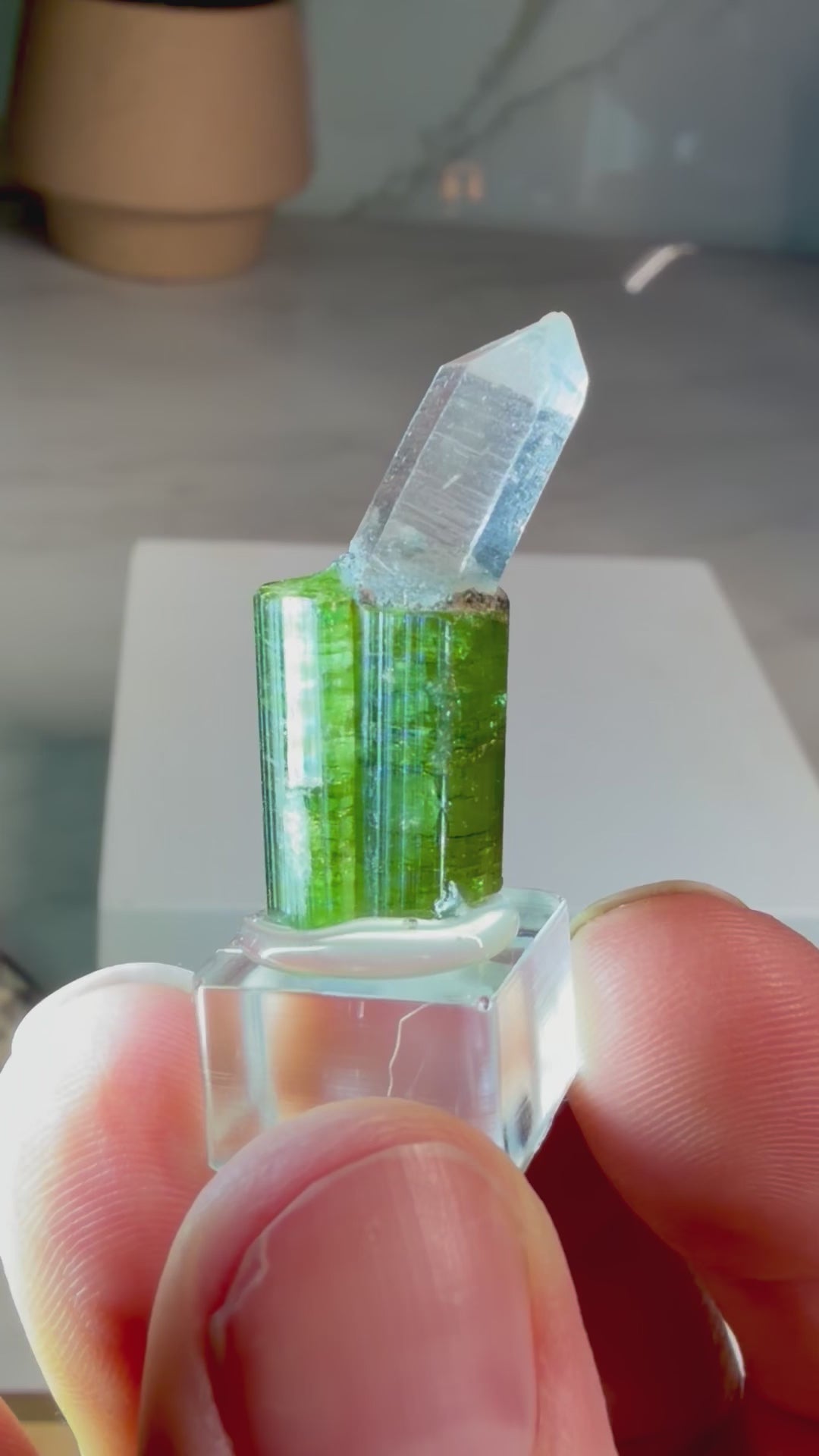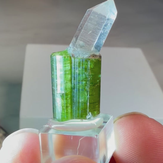 A bright, gemmy green tourmaline crystal hosting a perfectly perched quartz point from the famous Aricanga Mine, Tunnel 2. The tourmaline stands upright with sharp, well-defined faces, a cute “key” on the back, and fine vertical striations, giving it great presence for its size. At the termination, a perfect clear quartz crystal grows at an angle, creating a fun contrast of color and form.