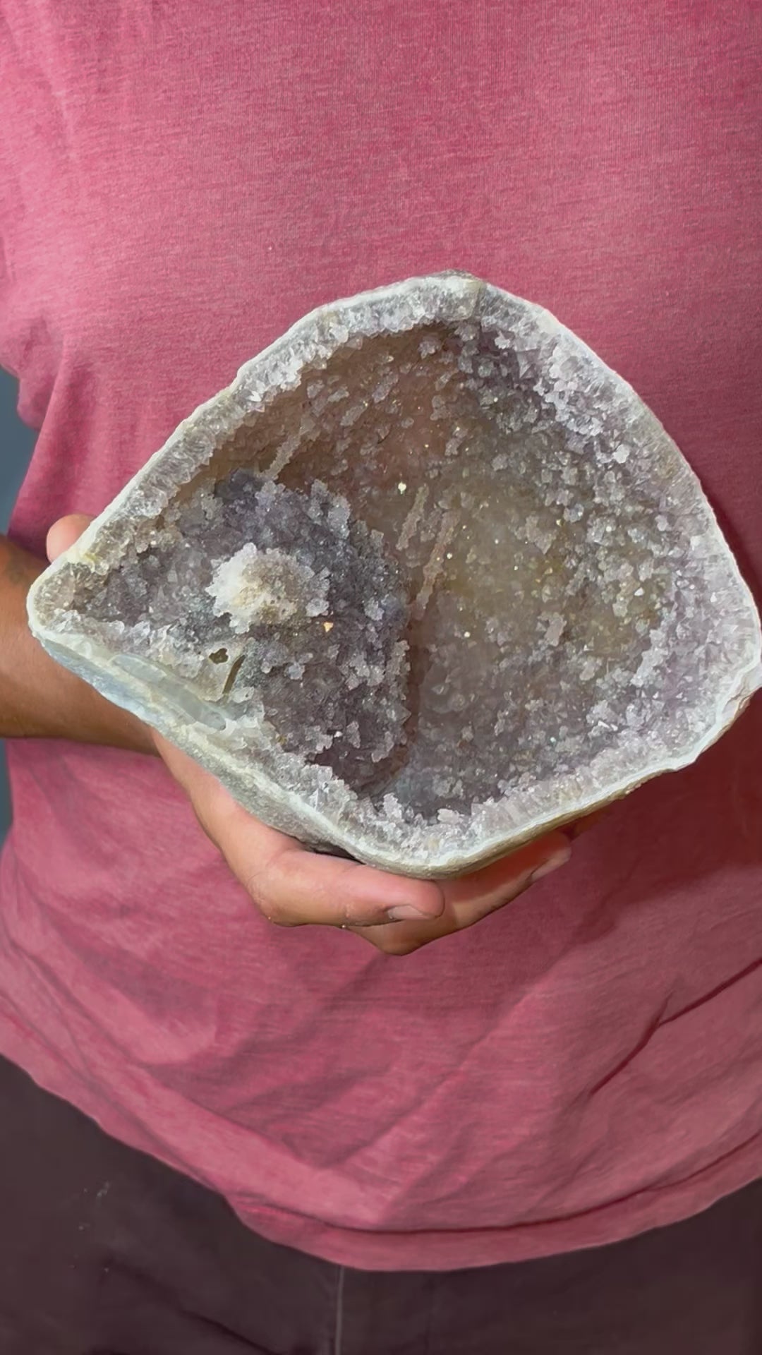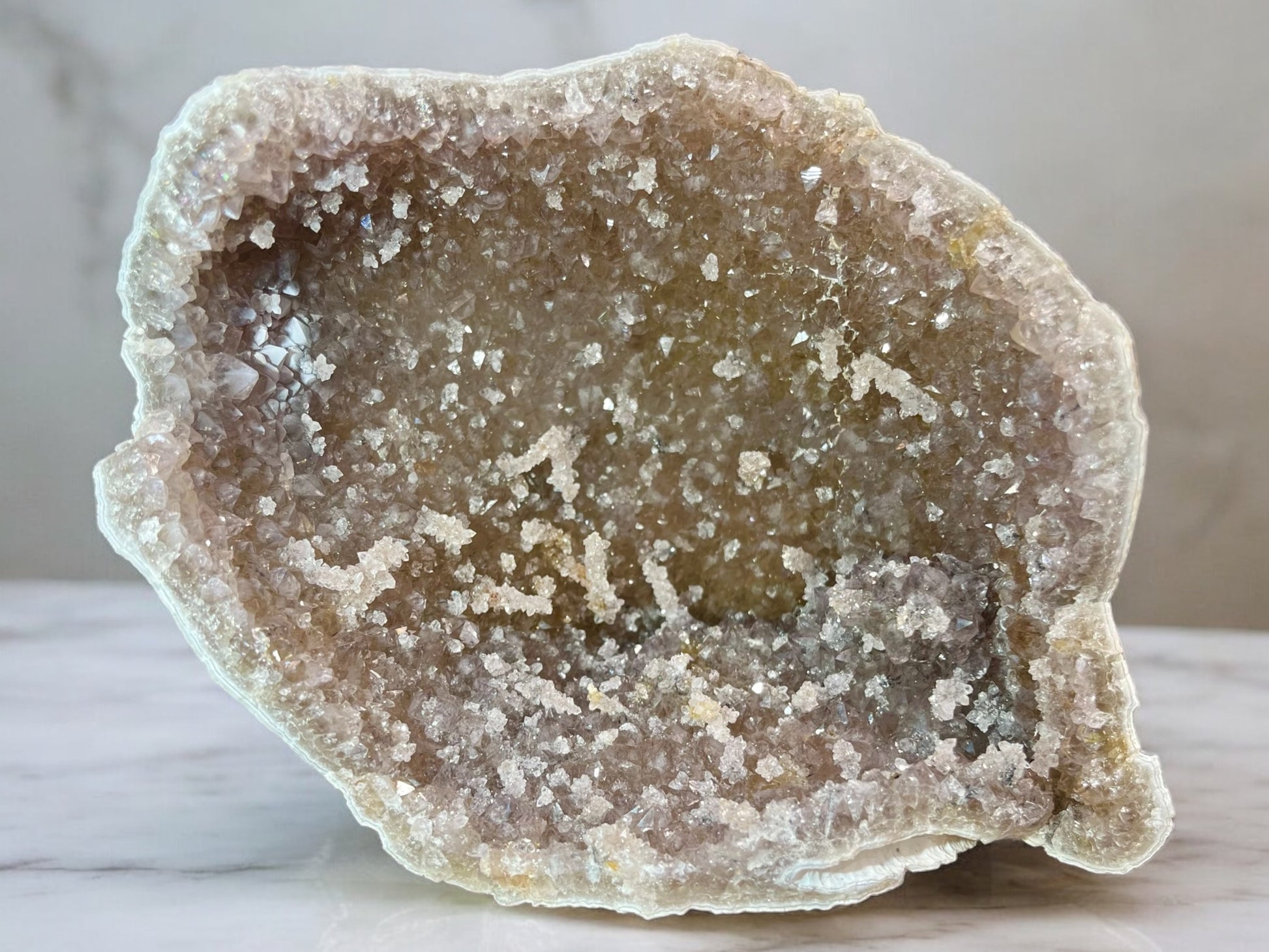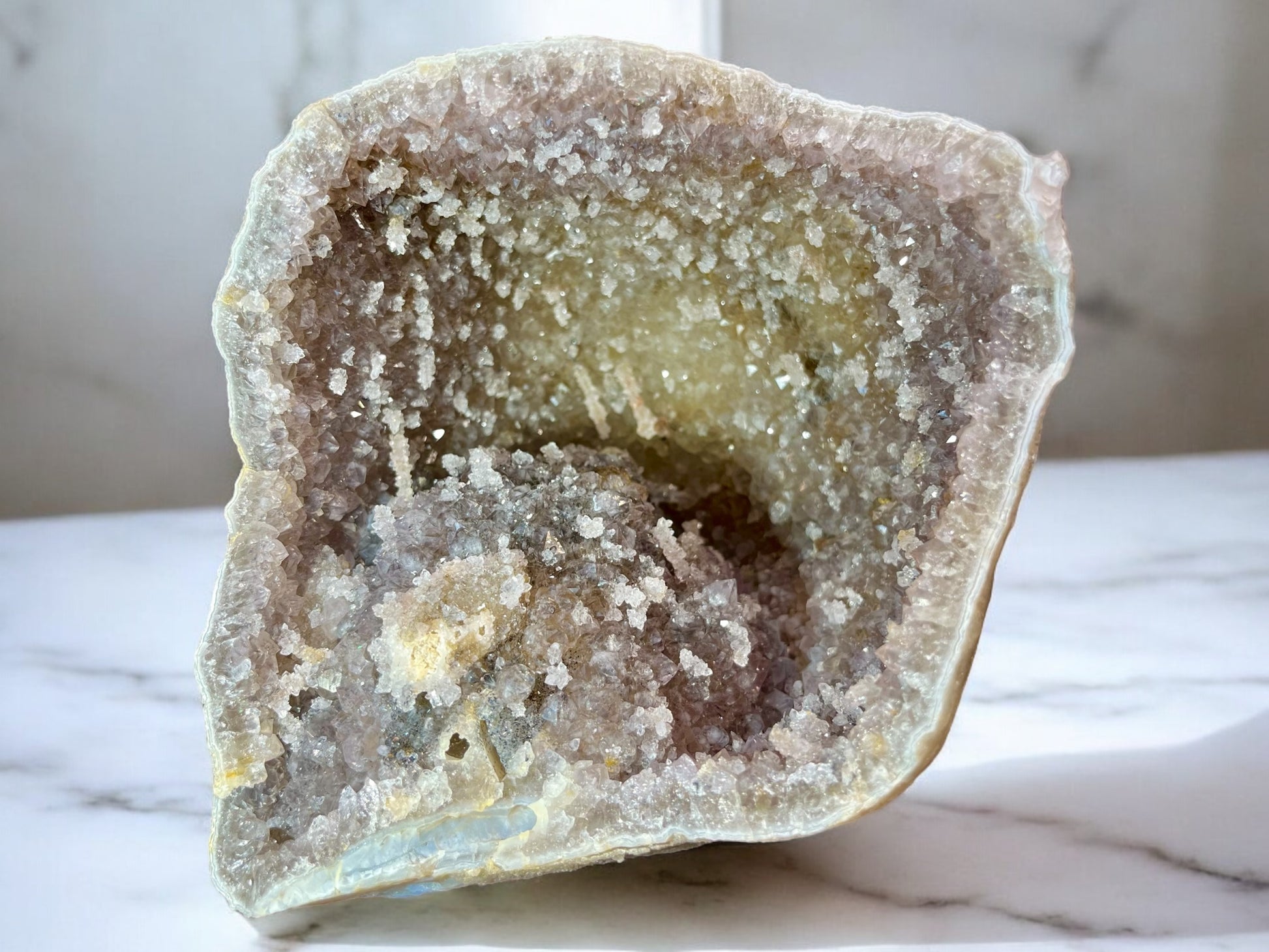 This geode is incredibly special. When opened up, you're greeted with a stunning sight—a natural crystal cavern filled with sparkling amethyst and clear quartz. The tiny stalactites growing every which-way give it an almost otherworldly feel, like you've just uncovered a hidden treasure on an alien planet. The interior has a soft, lustrous look, with pink, yellow, and orange crystals in every direction.