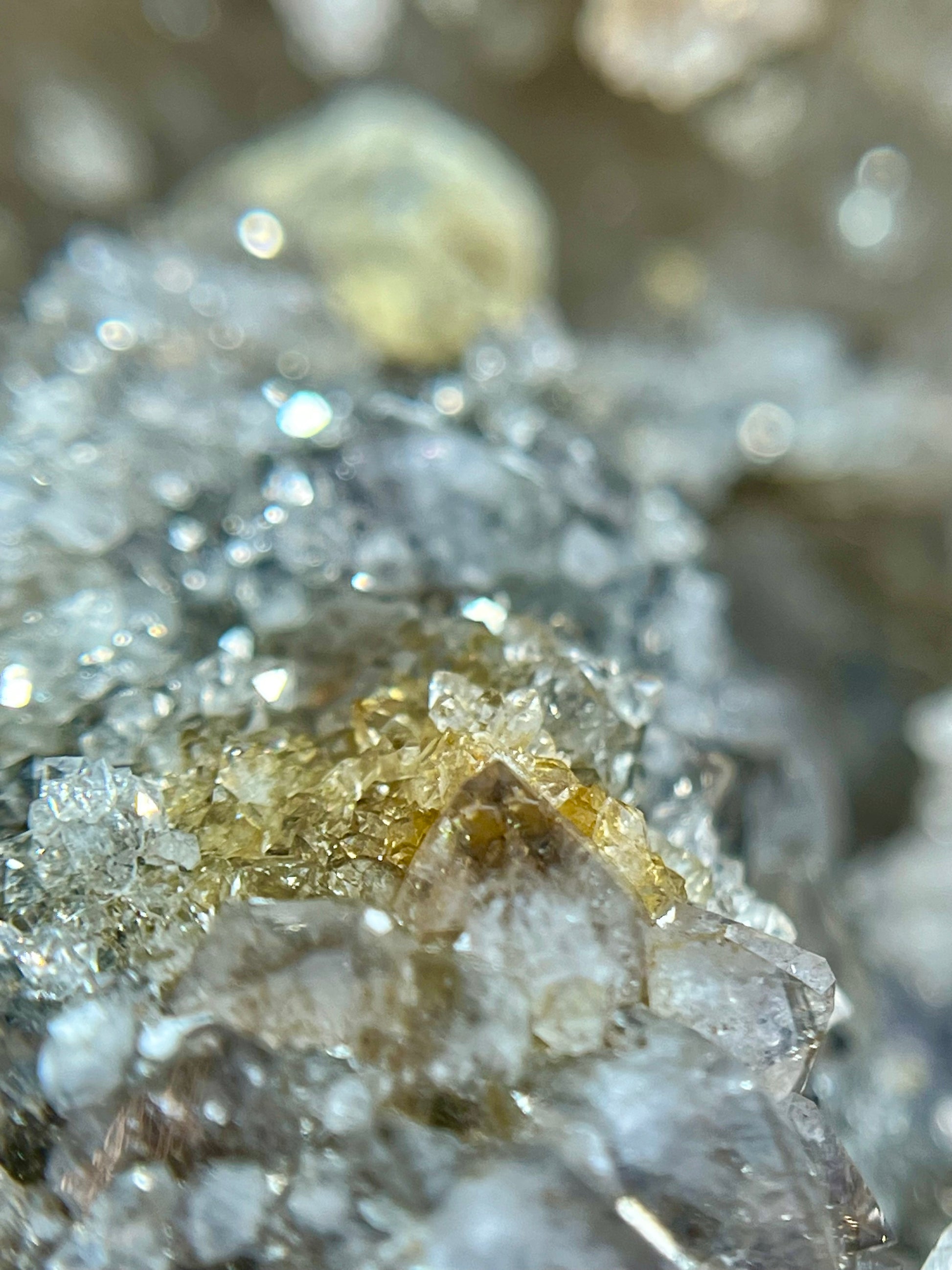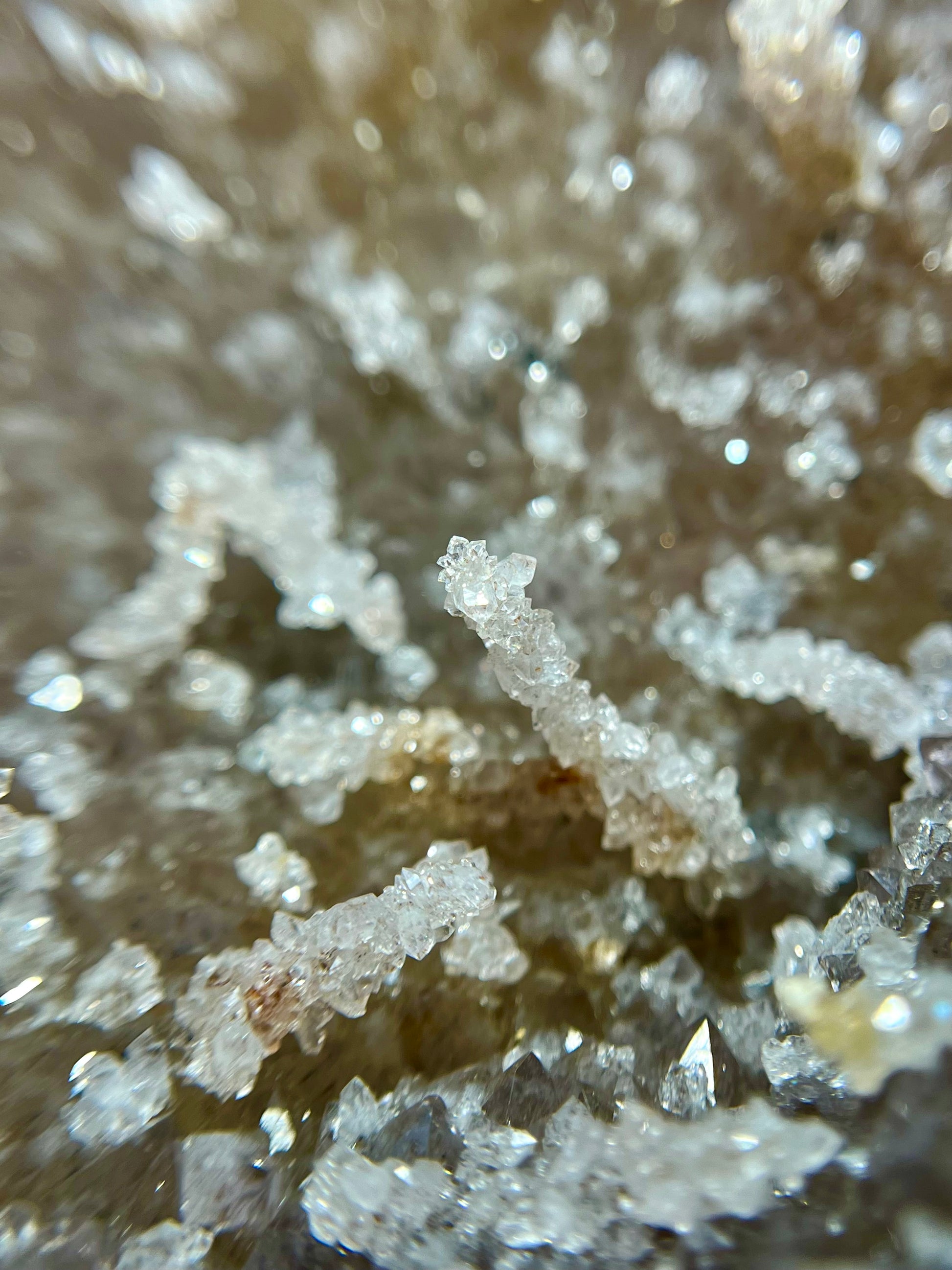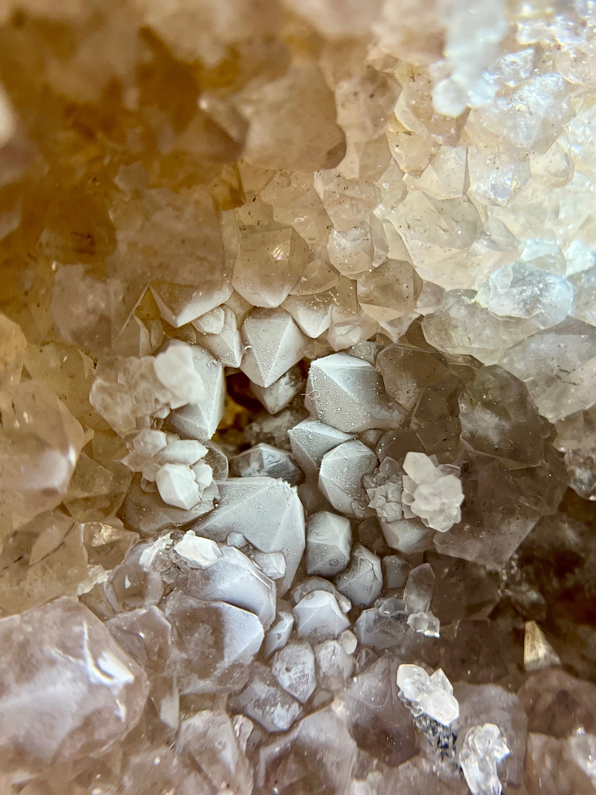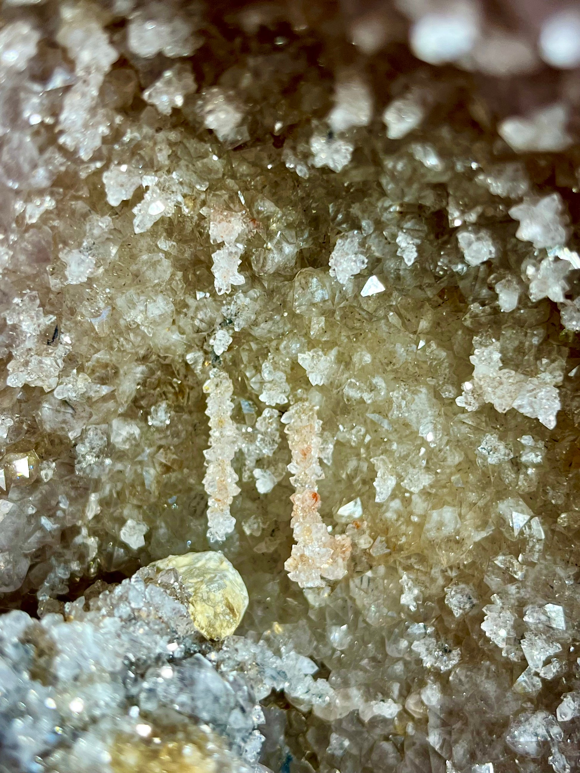 This geode is incredibly special. When opened up, you're greeted with a stunning sight—a natural crystal cavern filled with sparkling amethyst and clear quartz. The tiny stalactites growing every which-way give it an almost otherworldly feel, like you've just uncovered a hidden treasure on an alien planet. The interior has a soft, lustrous look, with pink, yellow, and orange crystals in every direction.