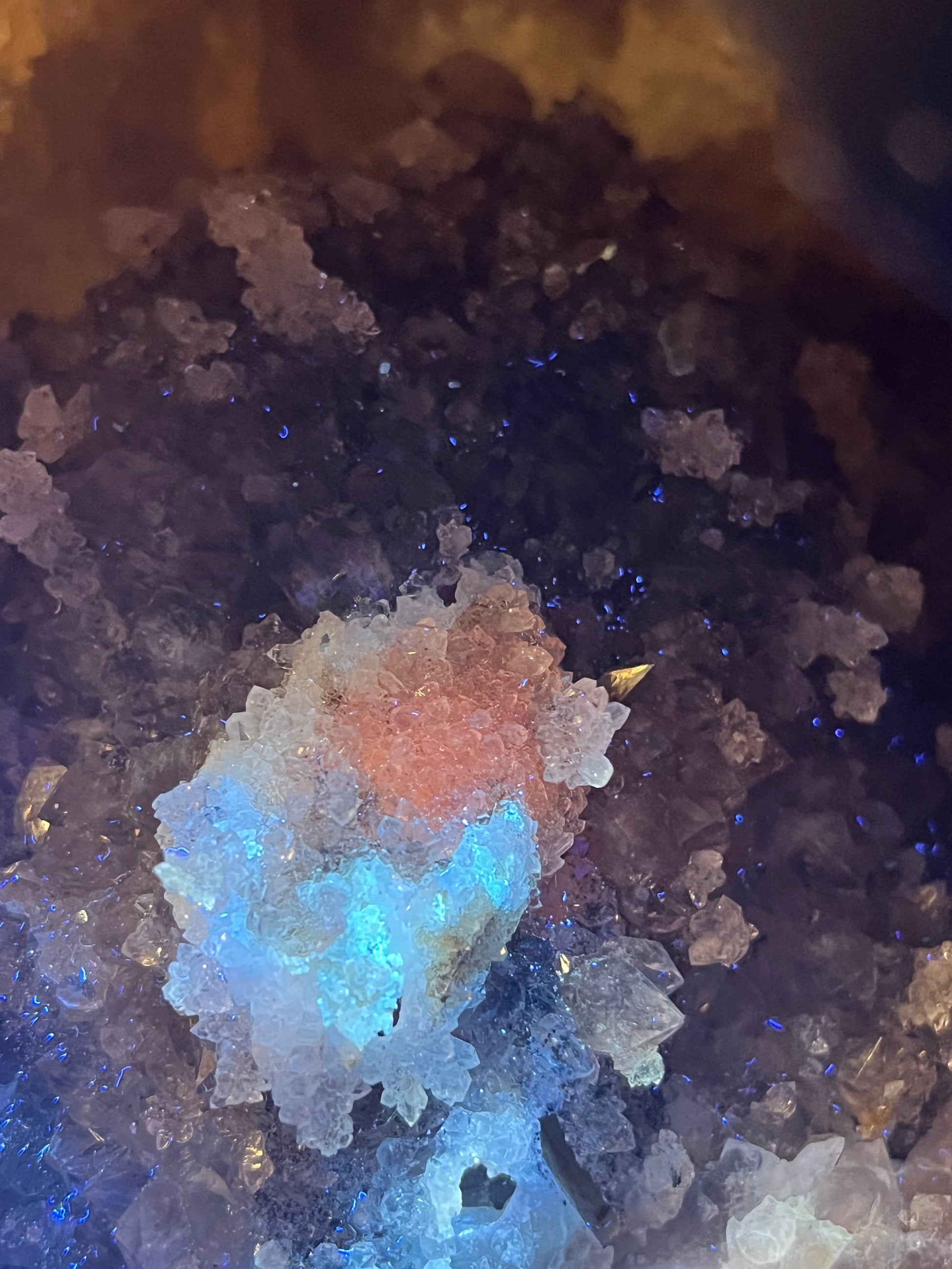 One half of the geode is particularly interesting, featuring a calcite crystal blanketed by smaller quartz and amethyst. The calcite glows brilliantly under UV, with patches of purple, pink, and orange. Around it, you've got a bed of amethyst and clear quartz, with little flecks of hematite that add some metallic shimmer. There's also a cluster of frosted white quartz points that adds some nice contrast and texture to the whole piece.