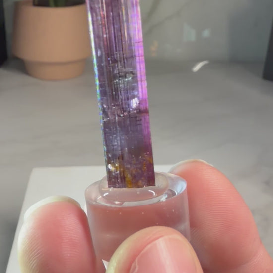 - Form: Single prismatic crystal, color-zoned