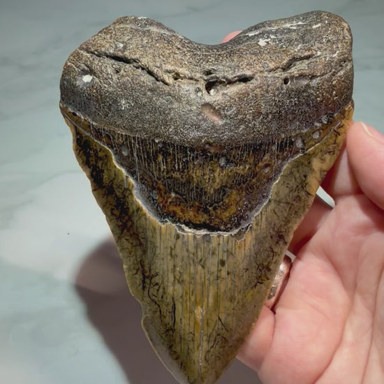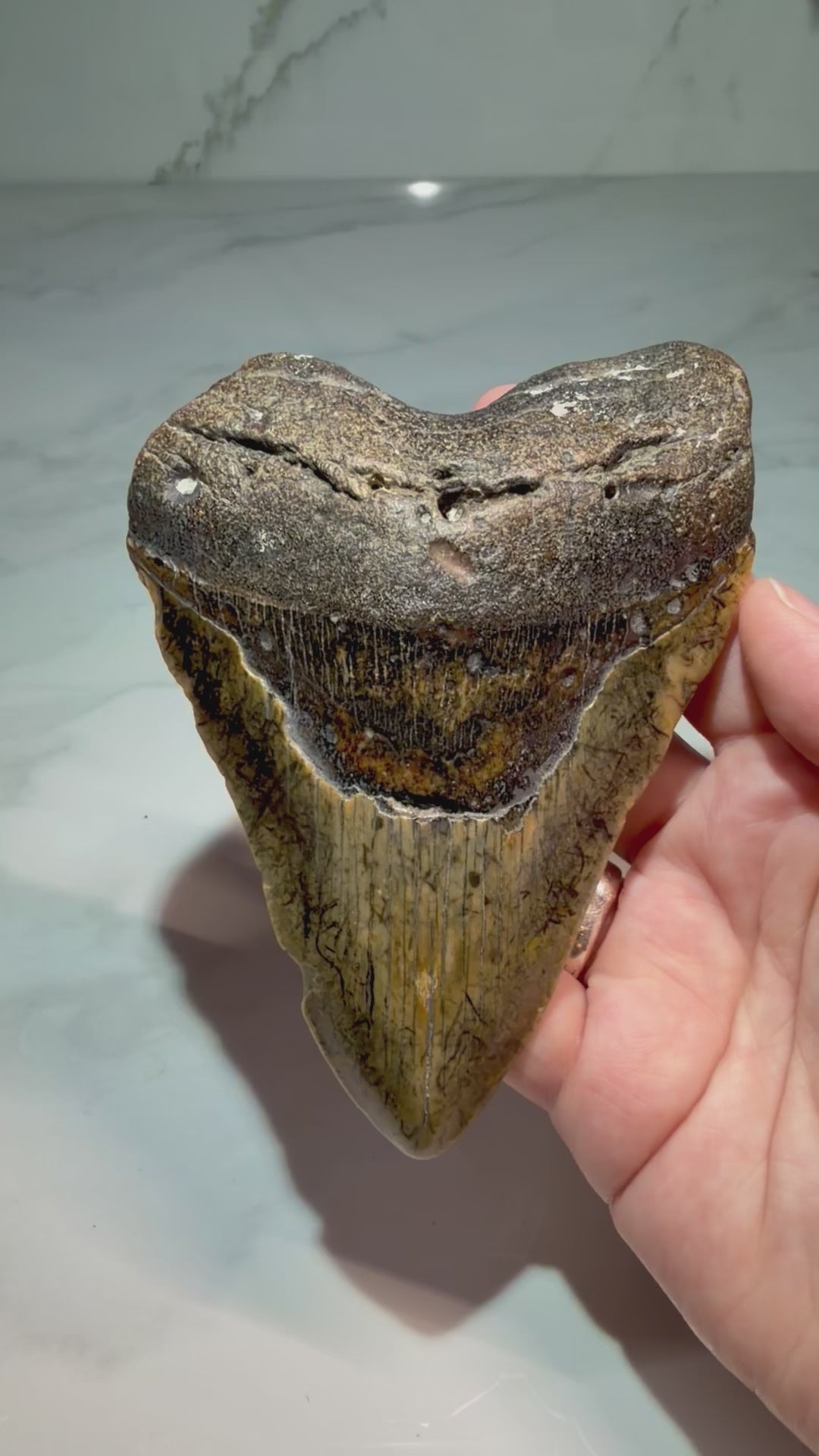 This 5.2-inch fossil tooth from Carcharocles megalodon was found in South Carolina, a region known for producing well-mineralized Miocene–Pliocene shark teeth.
