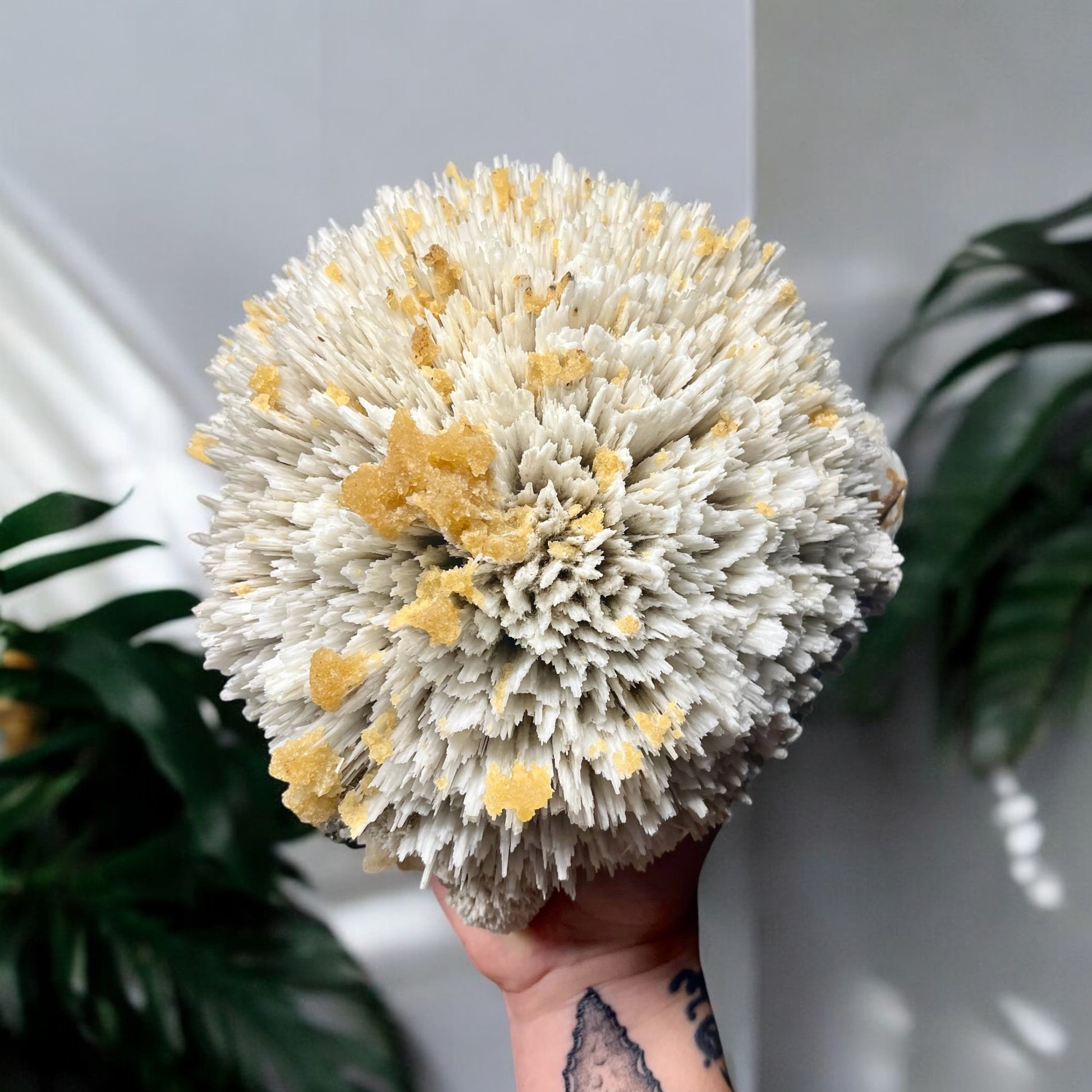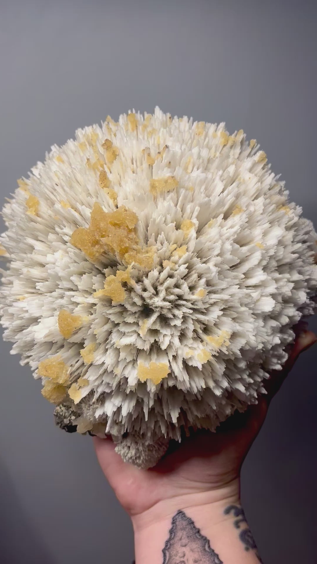 This is a unique cluster of mordenite “spears”, which formed into a large spherical formation. Atop the tips are clusters of vibrant yellow calcite crystals that have an exceptional glow under UV light. This was a small find and these are very hard to come by, especially in this large size.
