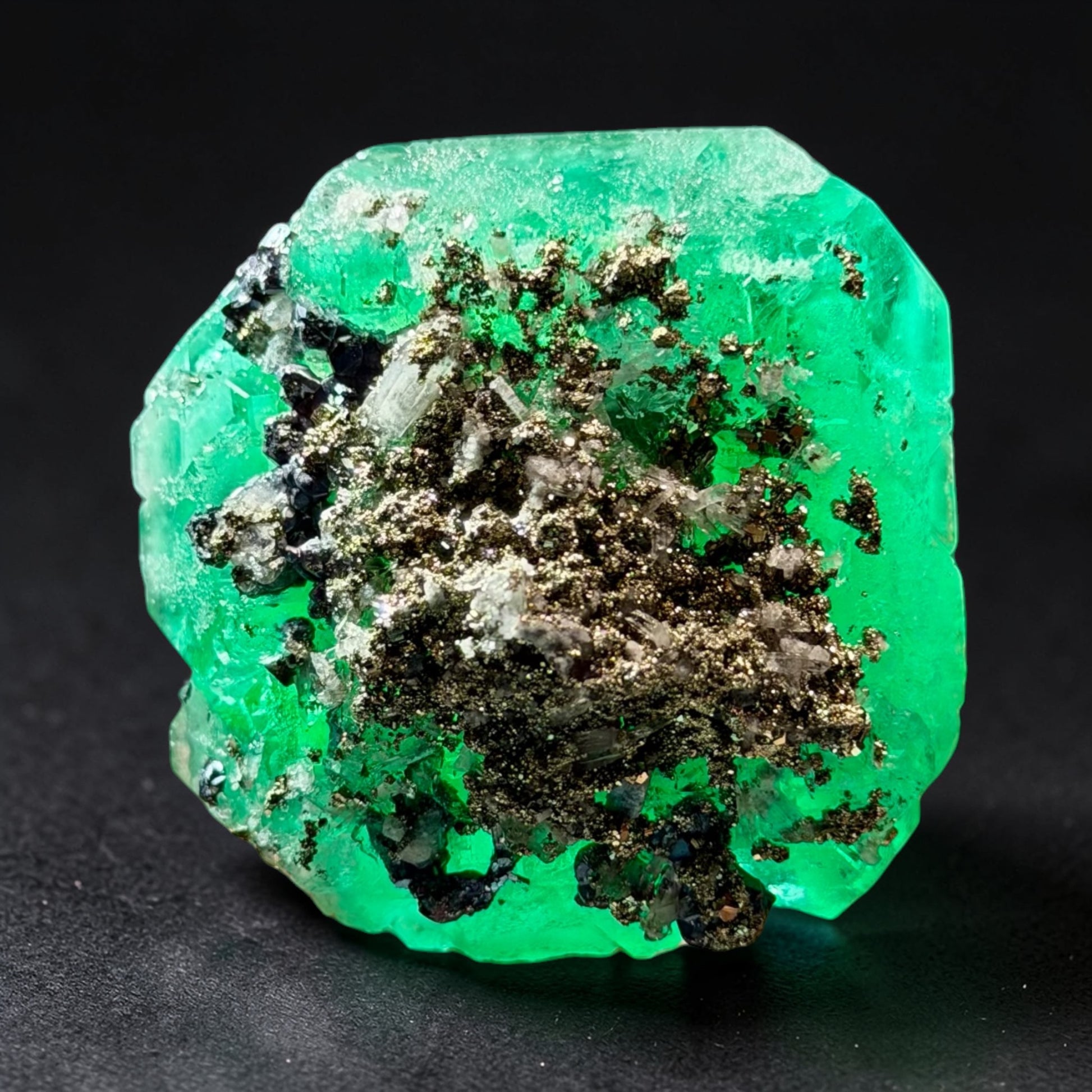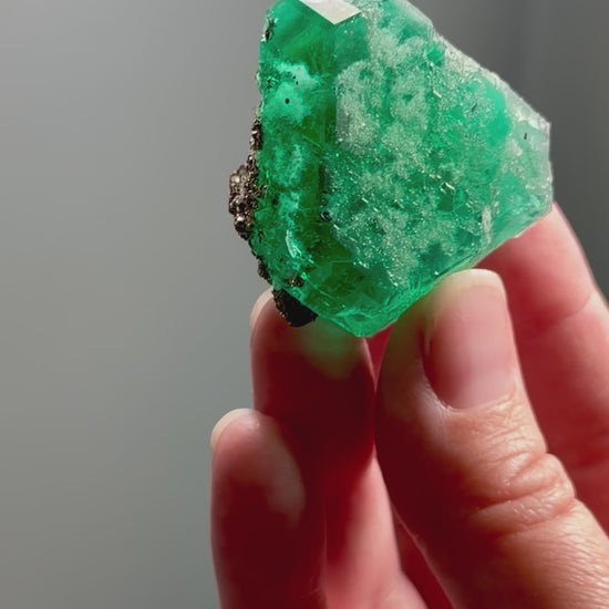 A single, well-formed green fluorite crystal showing a clear octahedral habit, accented by a concentrated cluster of pyrite on the base. The fluorite has a rich, even color with glowing translucency, giving it that unmistakable internal luminance when light passes through.