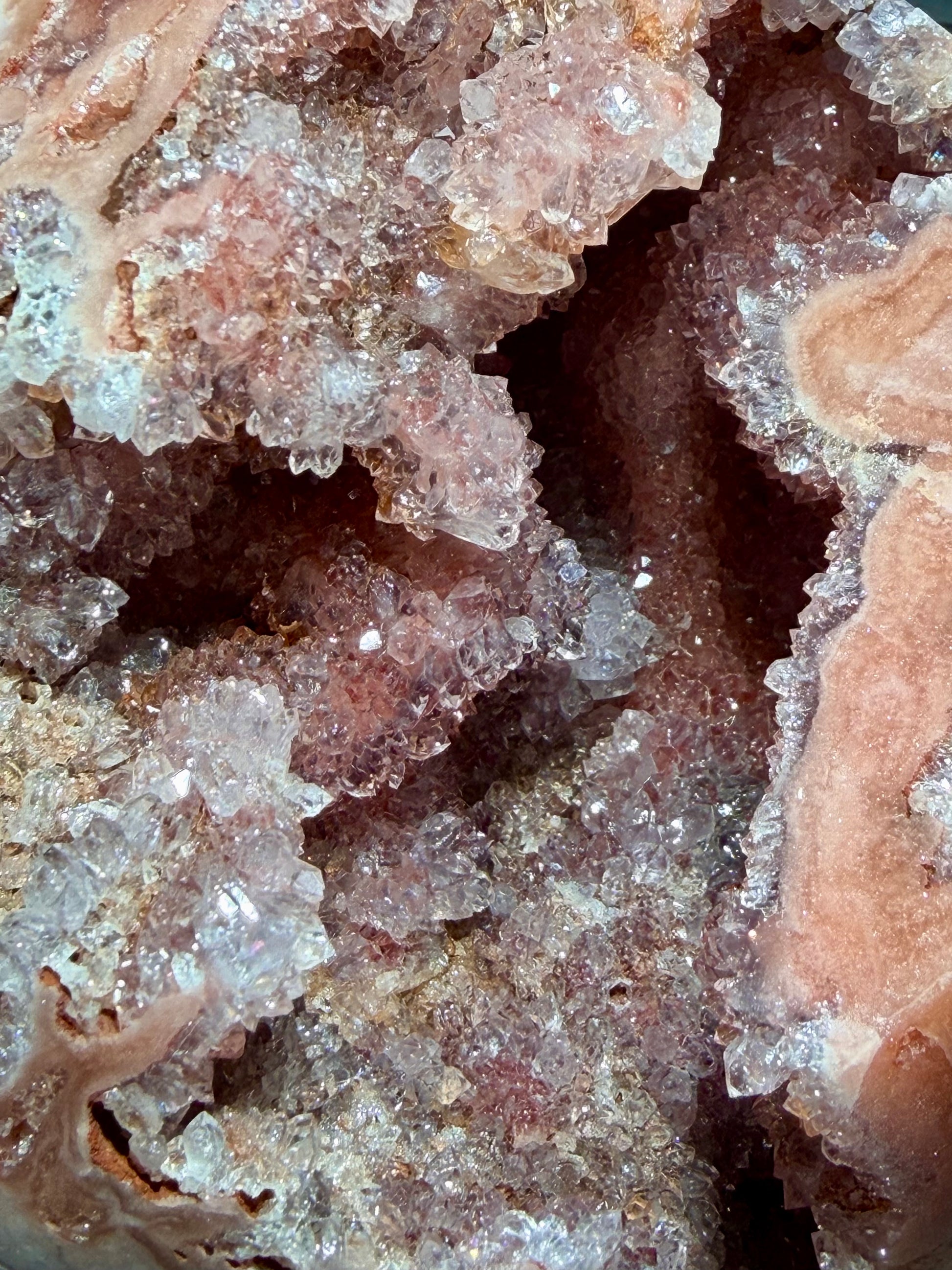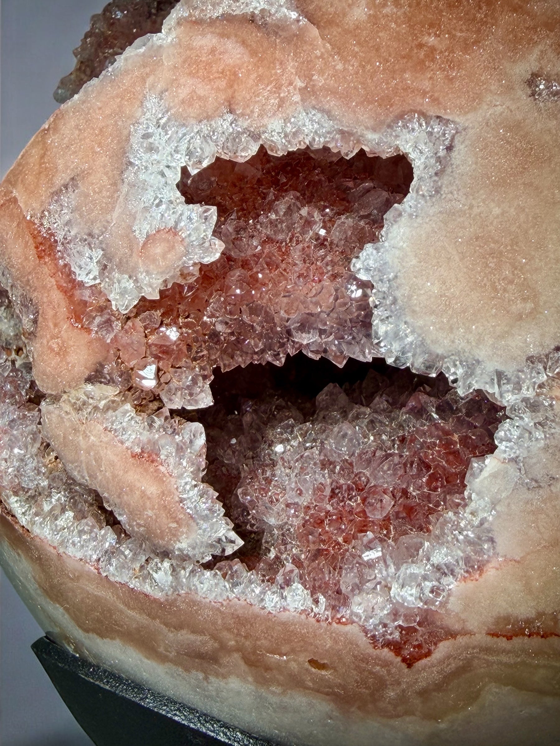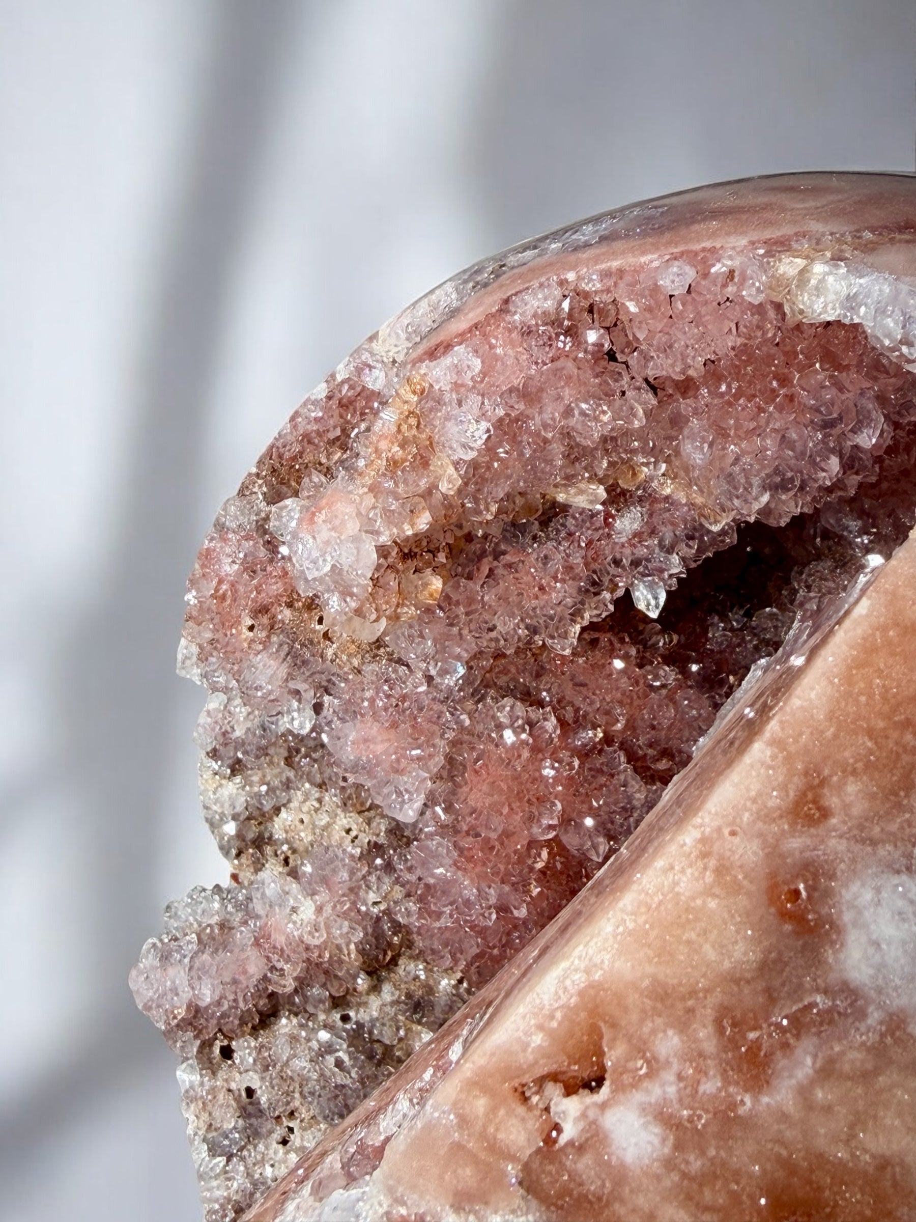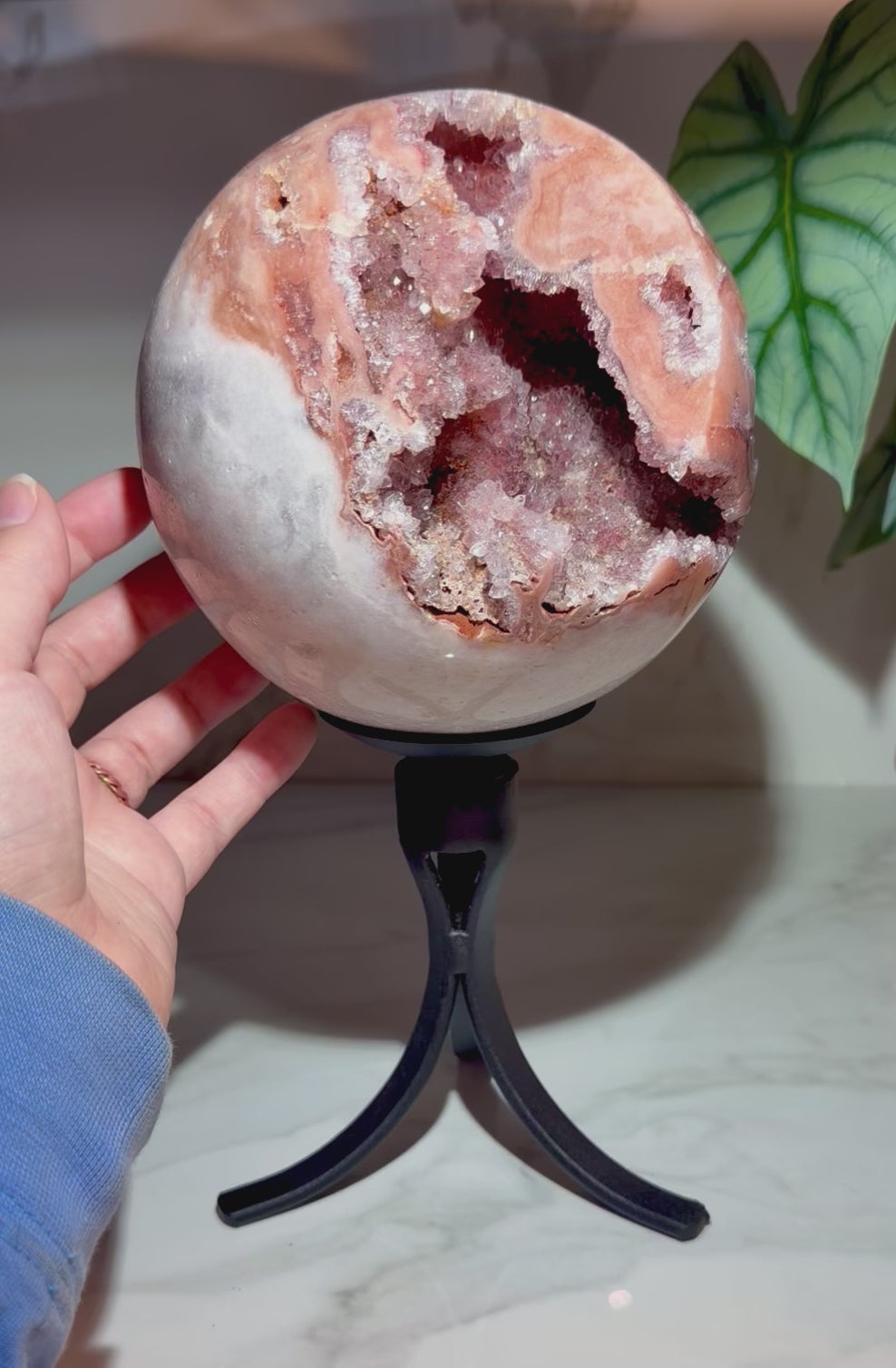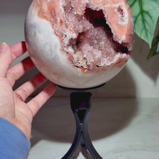 This XL Brazilian pink amethyst sphere features a naturally open geode interior lined with high-luster druzy quartz in deep-to-soft blush and champagne tones. The polished exterior contrasts beautifully with the raw crystalline cavity, giving the piece depth and dimension from every angle.