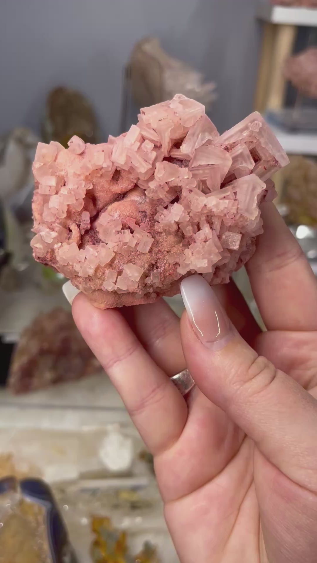 Pink Halite is a visually striking mineral composed of sodium chloride (NaCl). It forms in the salt flats through the slow evaporation of mineral-rich waters, creating delicate cubic crystal structures in shades ranging from soft pink to deep rose. The coloration is due to halophilic bacteria and algae that thrive in the highly saline environment. Its intricate formations, glassy luster, and natural beauty make it a prized specimen for collectors. However, because of its solubility, Pink Halite must be kept dry and handled carefully to prevent deterioration.