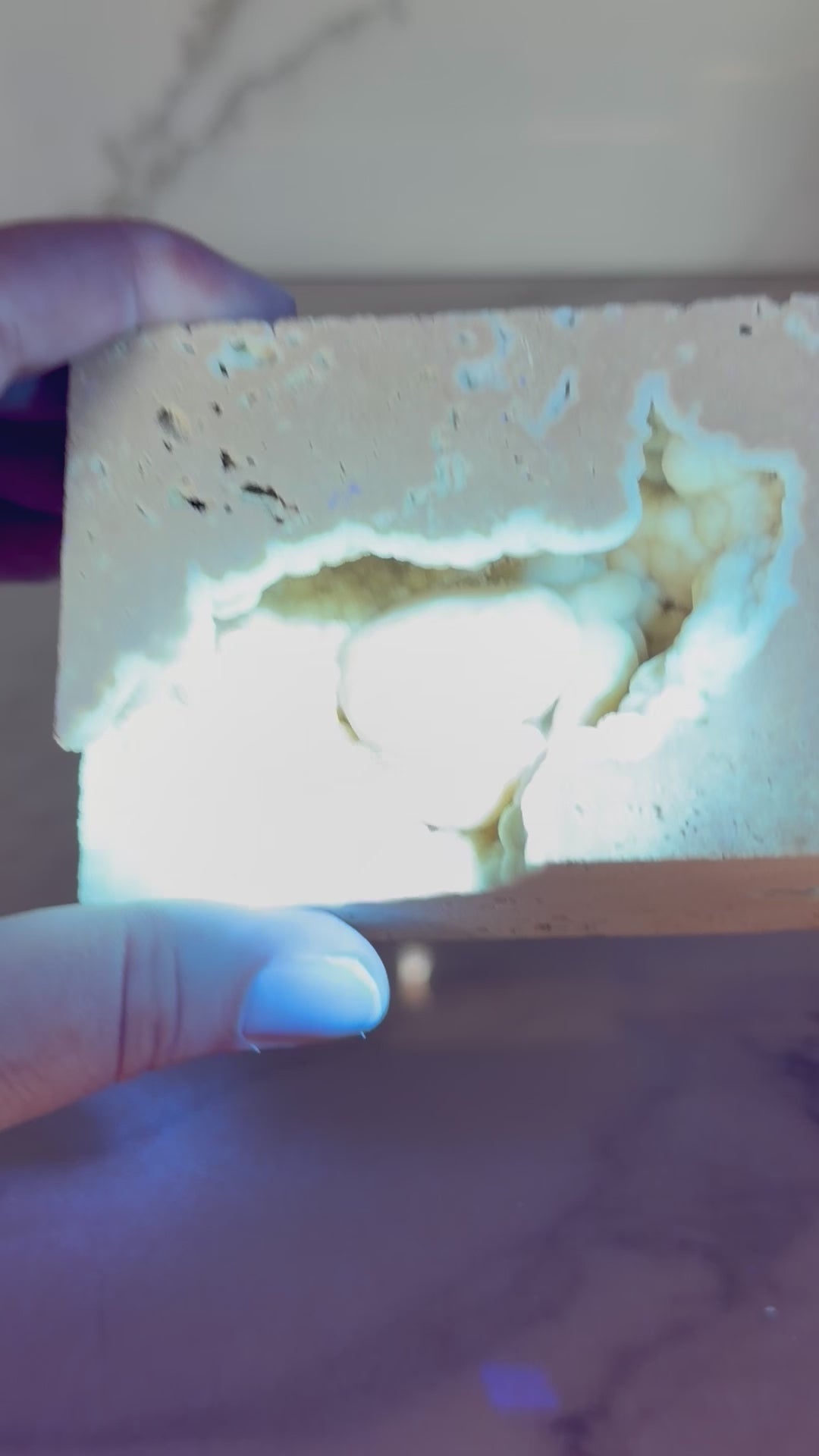 The crab sits low and naturally inside its home, its carapace partially revealed beneath the mineral build-up— exactly how it was preserved in situ. Nothing has been carved out or enhanced. Its posture and visibility are the result of the natural deposition of calcium-rich spring waters millions of years ago. This piece is UV reactive and phosphorescent!