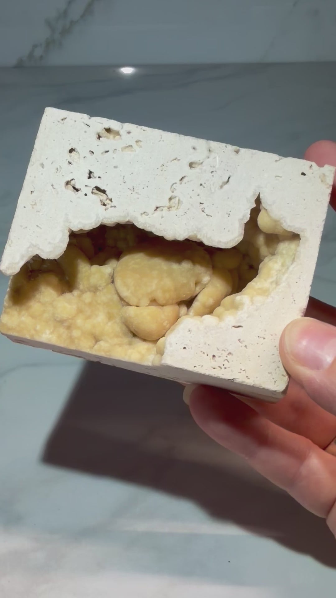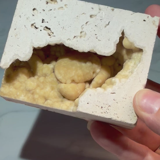 The travertine matrix is thick, pale, and full of natural porosity typical of Denizli material. The inner cavity contrasts beautifully with the smooth, chalky exterior block, creating a miniature diorama effect when viewed from above. Under light, the surfaces show a fine sugary sparkle that highlights every curve of the botryoidal texture.