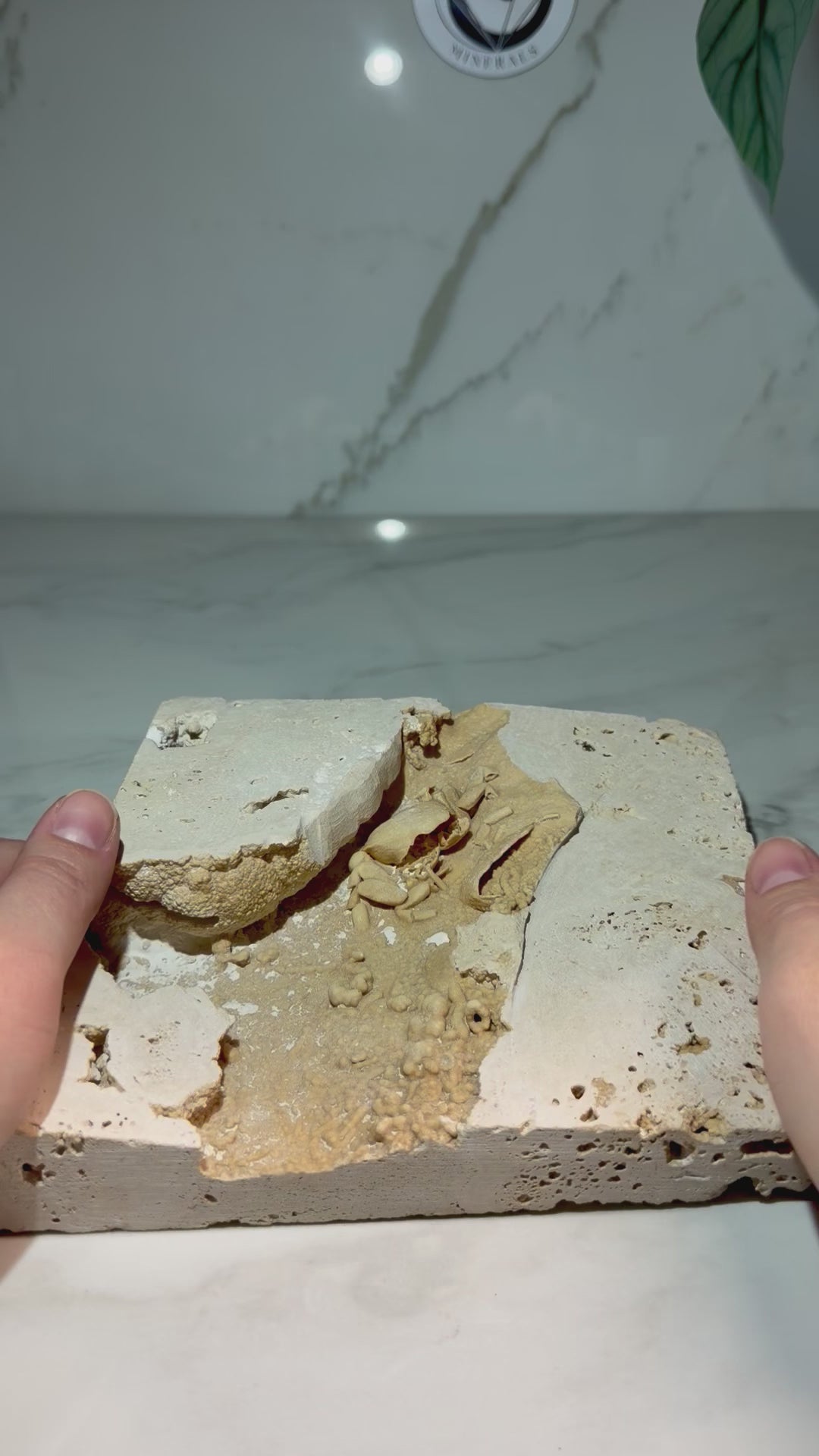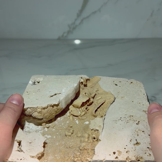 A cavern-like travertine chamber housing an well-preserved Potamon freshwater crab from the Denizli Basin of southwestern Turkey. This is one of the largest pieces of the group— substantial in weight and full of detail.