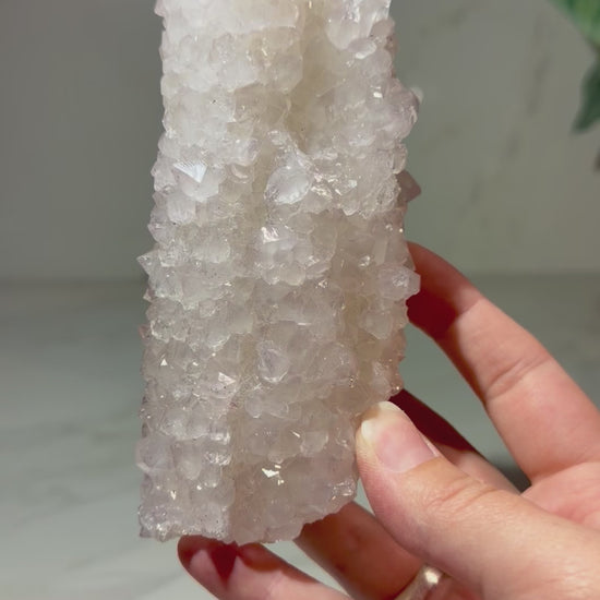 This is a really striking calcite stalactite completely coated in sparkling quartz (possibly very light amethyst) crystals. The elongated columnar form gives it an interesting look, while the bright quartz blanket adds extra luster and texture across the entire surface. A great natural growth piece that blends the organic shape of a stalactite with the brilliance of quartz crystalization!