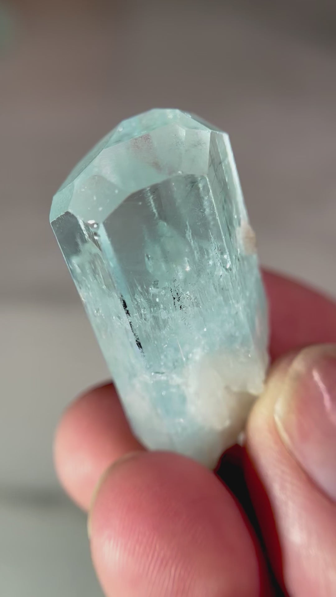 A stunning aquamarine crystal from the legendary Shigar Valley in Pakistan’s Skardu District — renowned for producing some of the world’s finest aquamarine. This piece features a true enhydro near the surface on one side, where the trapped fluid can be clearly seen moving with motion. The crystal terminates naturally in a flawless “diamond tip” termination, adding sharp geometry and brilliant internal reflection.