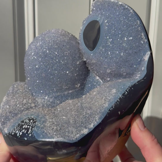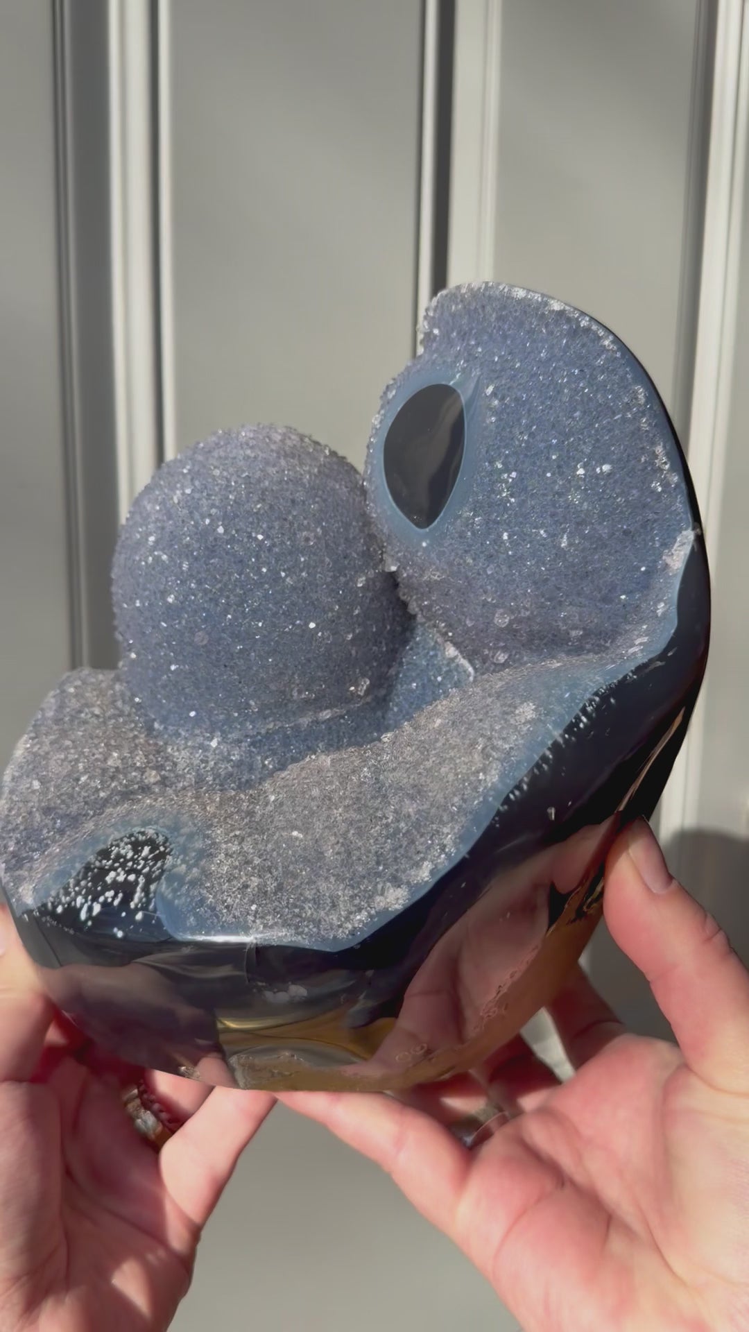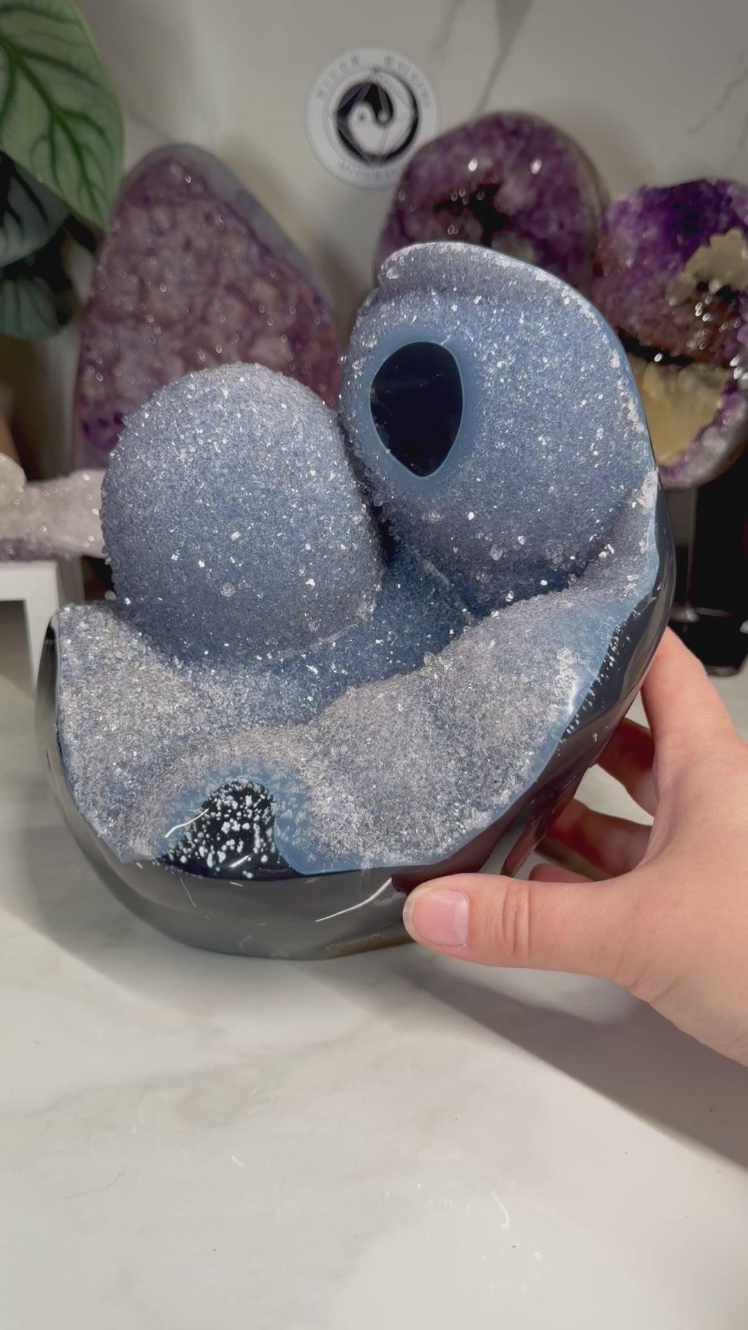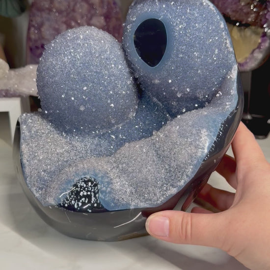 This piece is wild in all the best ways! There are two rounded “bubble”(botryoidal) formations that rise up from the base, with the whole surface dusted in small natural druzy that catches light from every direction. The taller dome has an “eye”— an open pocket with a deep, polished inky center surrounded by soft blue banding, which gives it this almost otherworldly alien vibe.